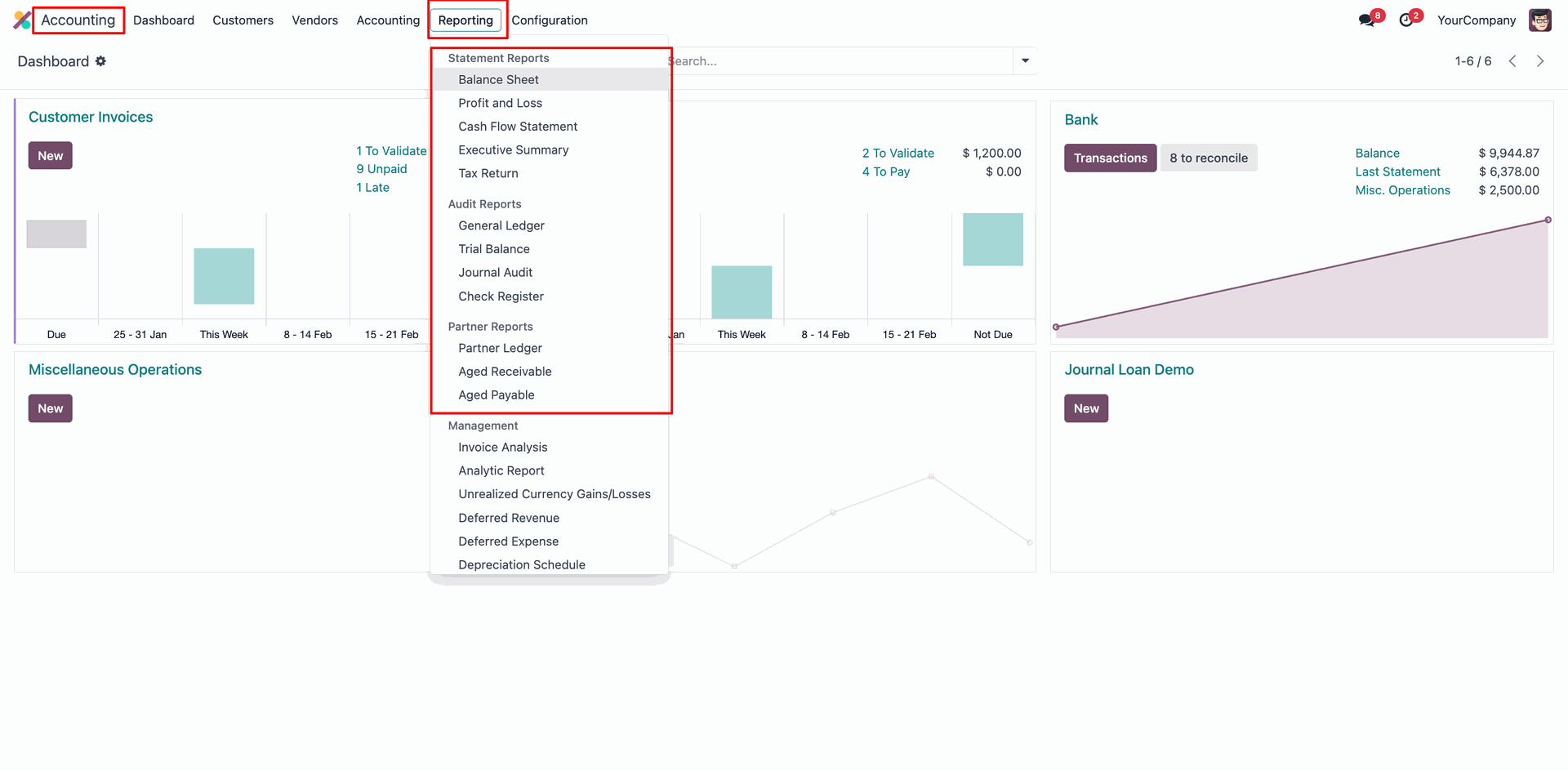 Go to the Accounting ==> Reporting ==> Balance Sheet