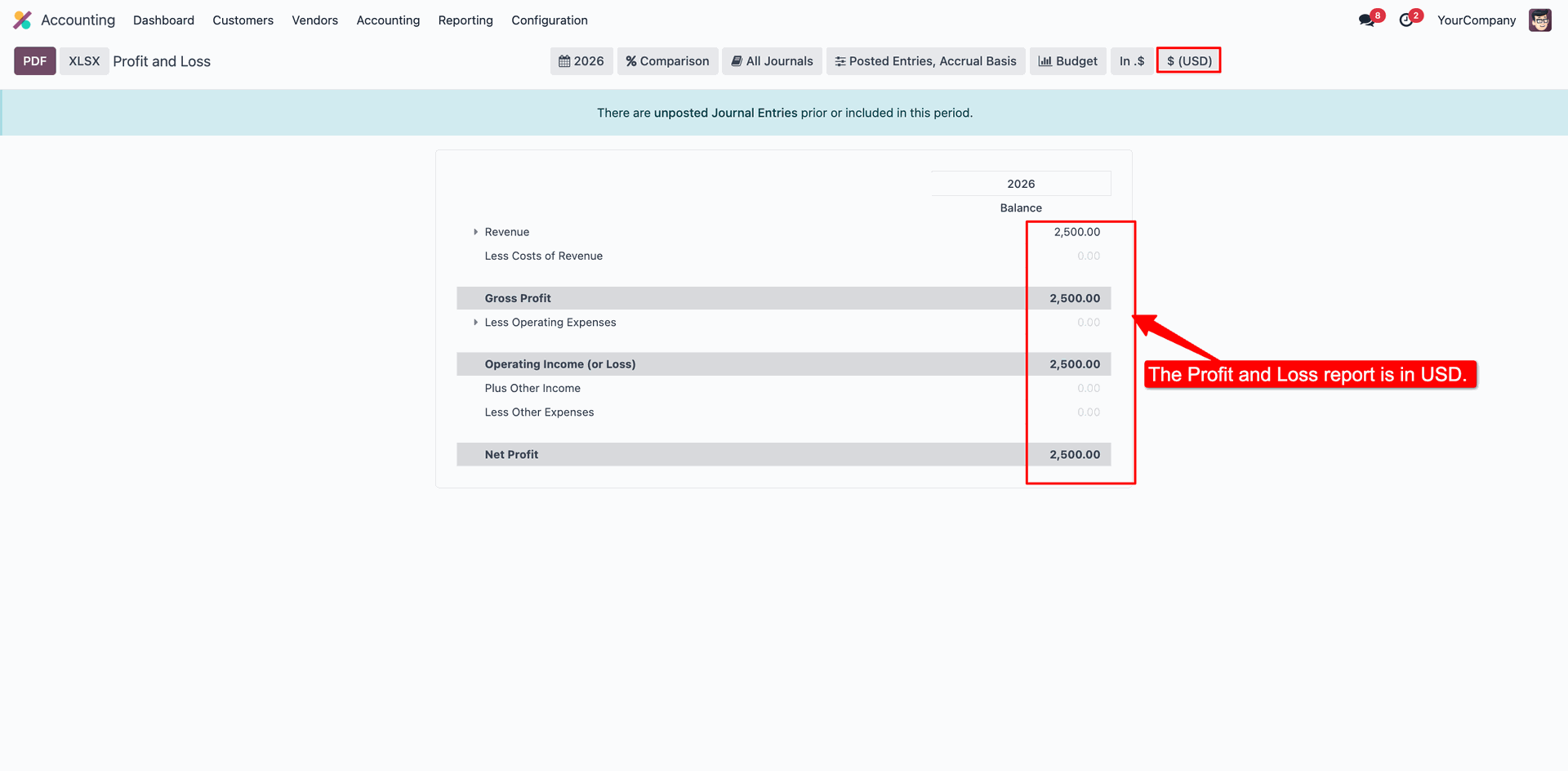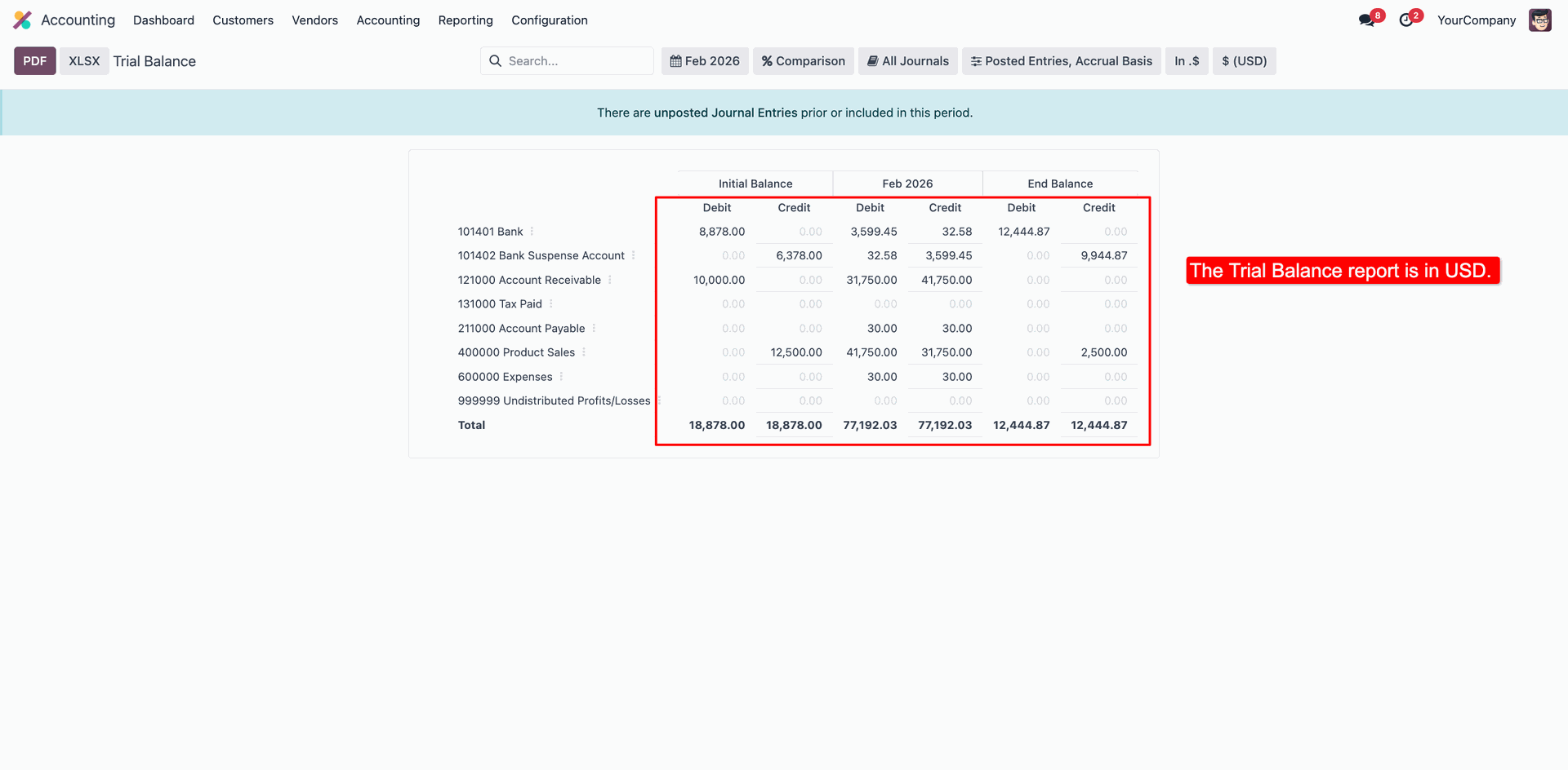 With this module, you can easily manage your account reports in multiple currencies. Easily switch between all activated currencies, and the report amounts will automatically adjust based on your selection. It provides accurate financial reporting for businesses operating internationally.