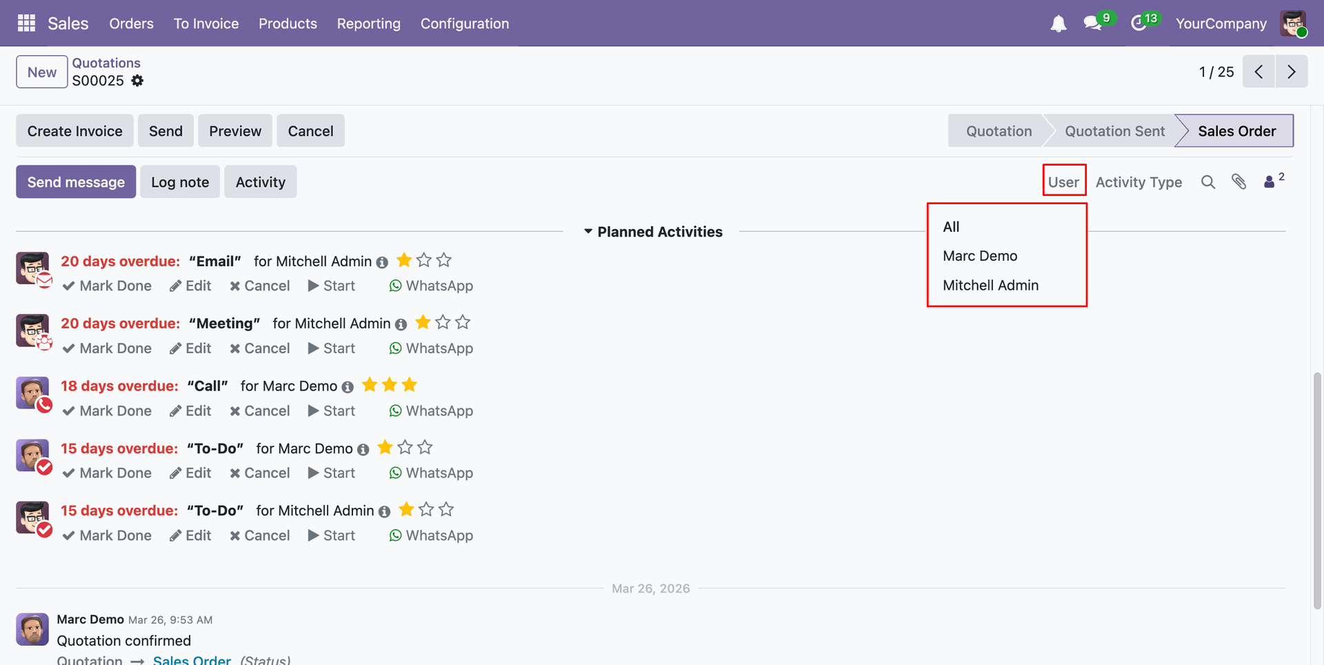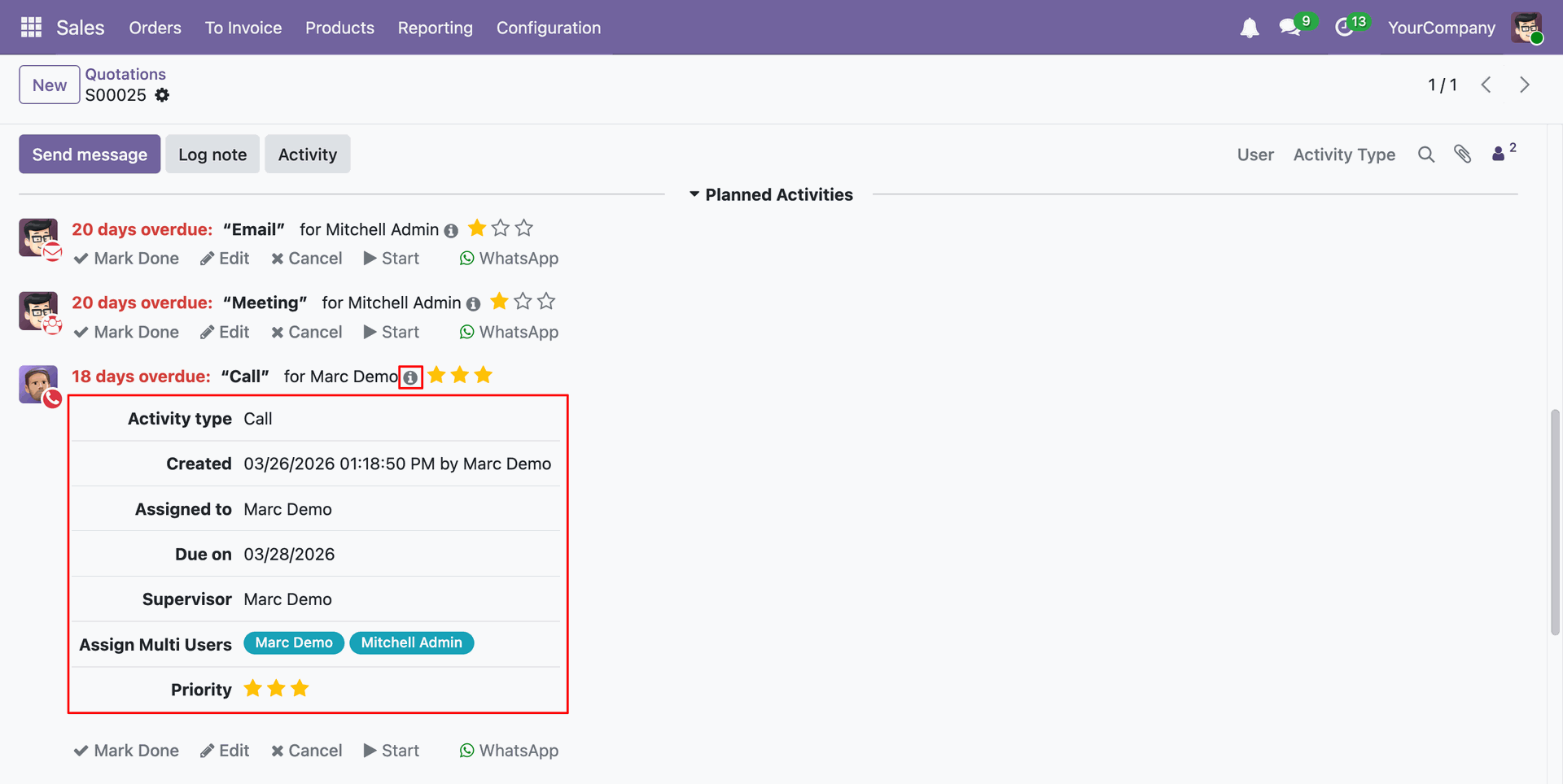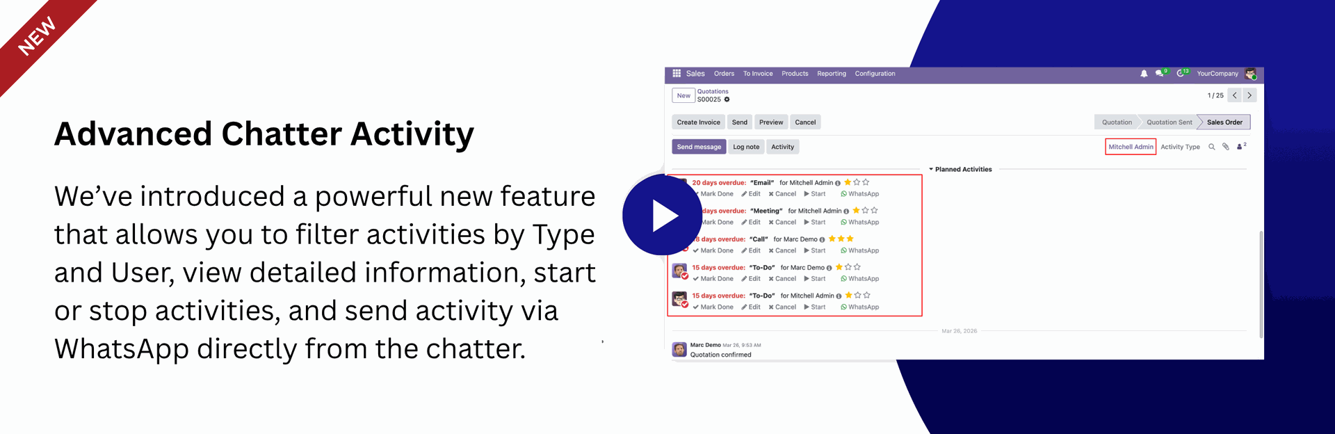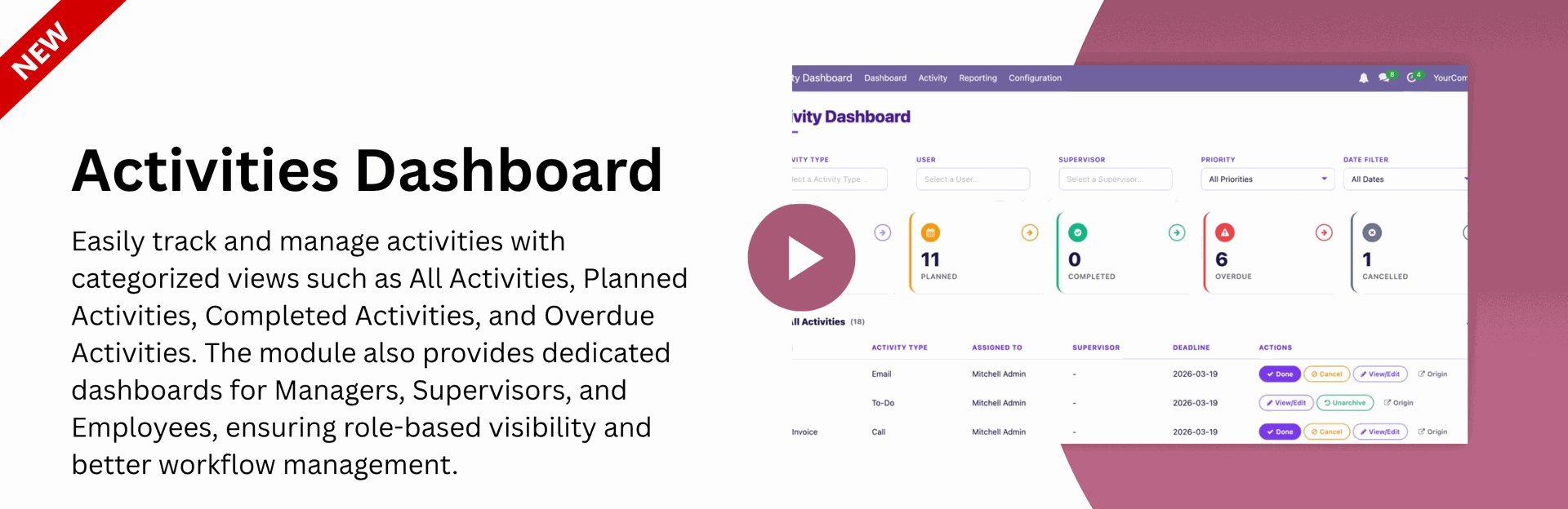 Do you want to show the well-organized structure of activities? Do you want to show completed, uncompleted activities easily to your employees? Do you want to show an activity dashboard to the employee? Do you want to show the scheduled activity to the manager, supervisor & employee? This module helps the manager can see everyone's activity, the supervisor can see the assigned user and their own activity, the user can see only their own activity. You can see activities like all activities, planned activities, completed activities, or overdue activities. Manager, Supervisor & Employee have their own dashboard. Activity notification will help to send a notification before and after the activity due date. You can notify your salesperson/customer before or after the activity is done. Hurray!