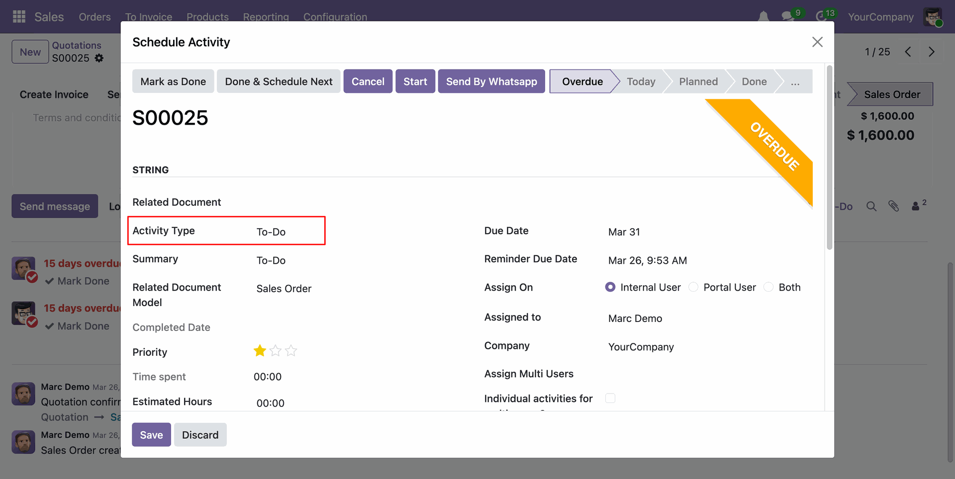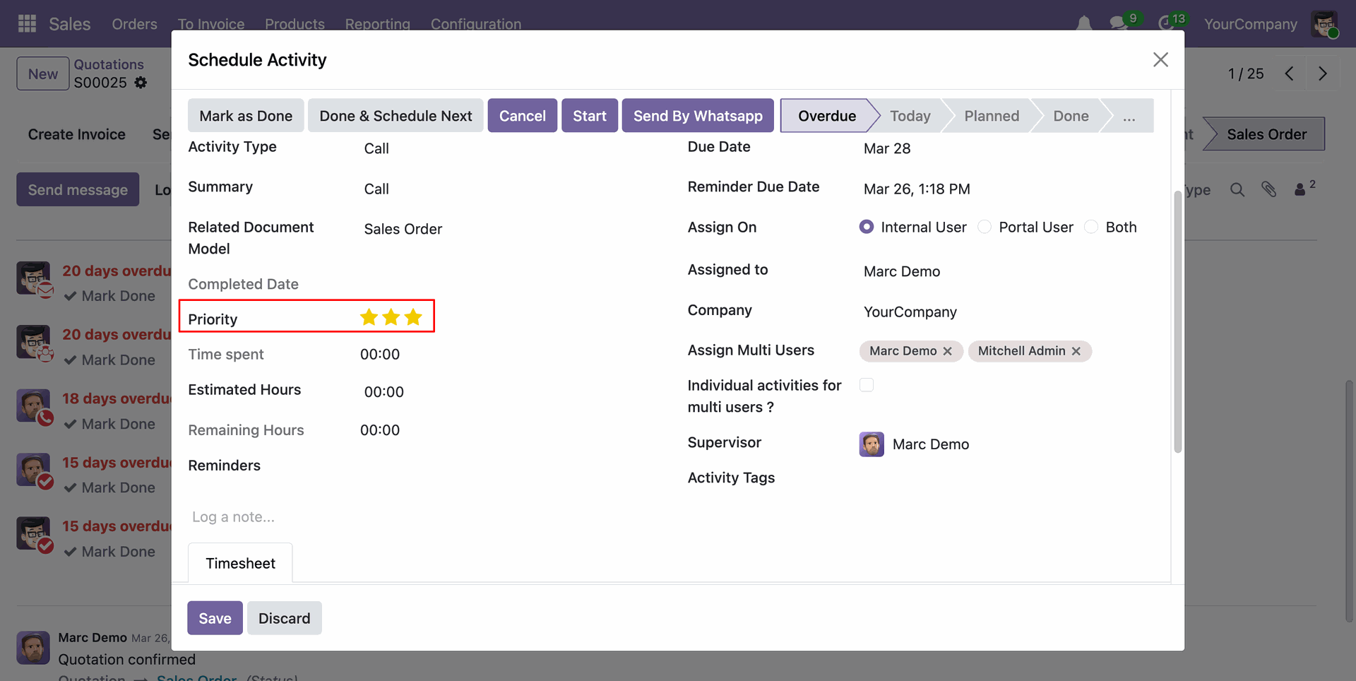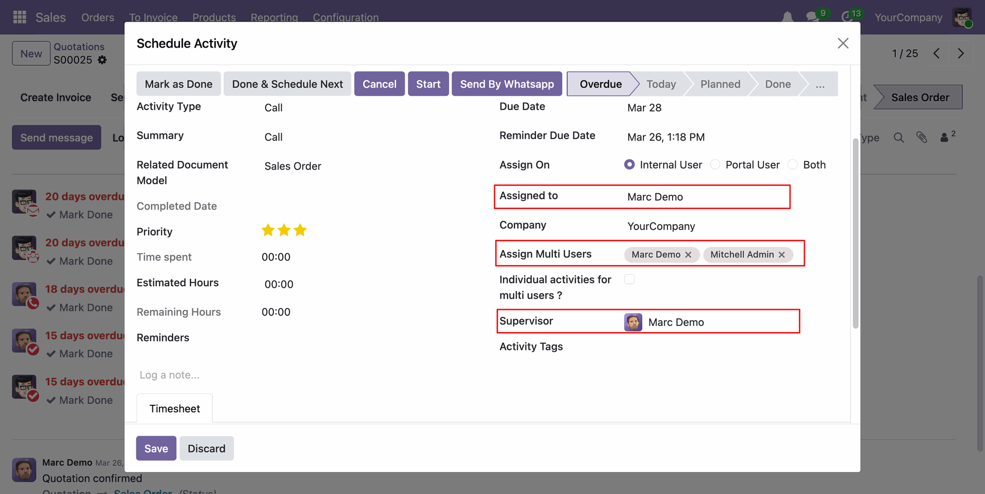 Create Activity and Set Supervisor to whom you want to assign. This is assigned to the user, who will get an activity Due notification as per settings. Click on the 'Save' button.