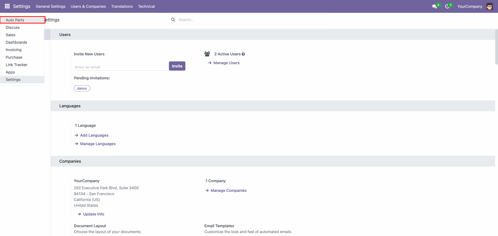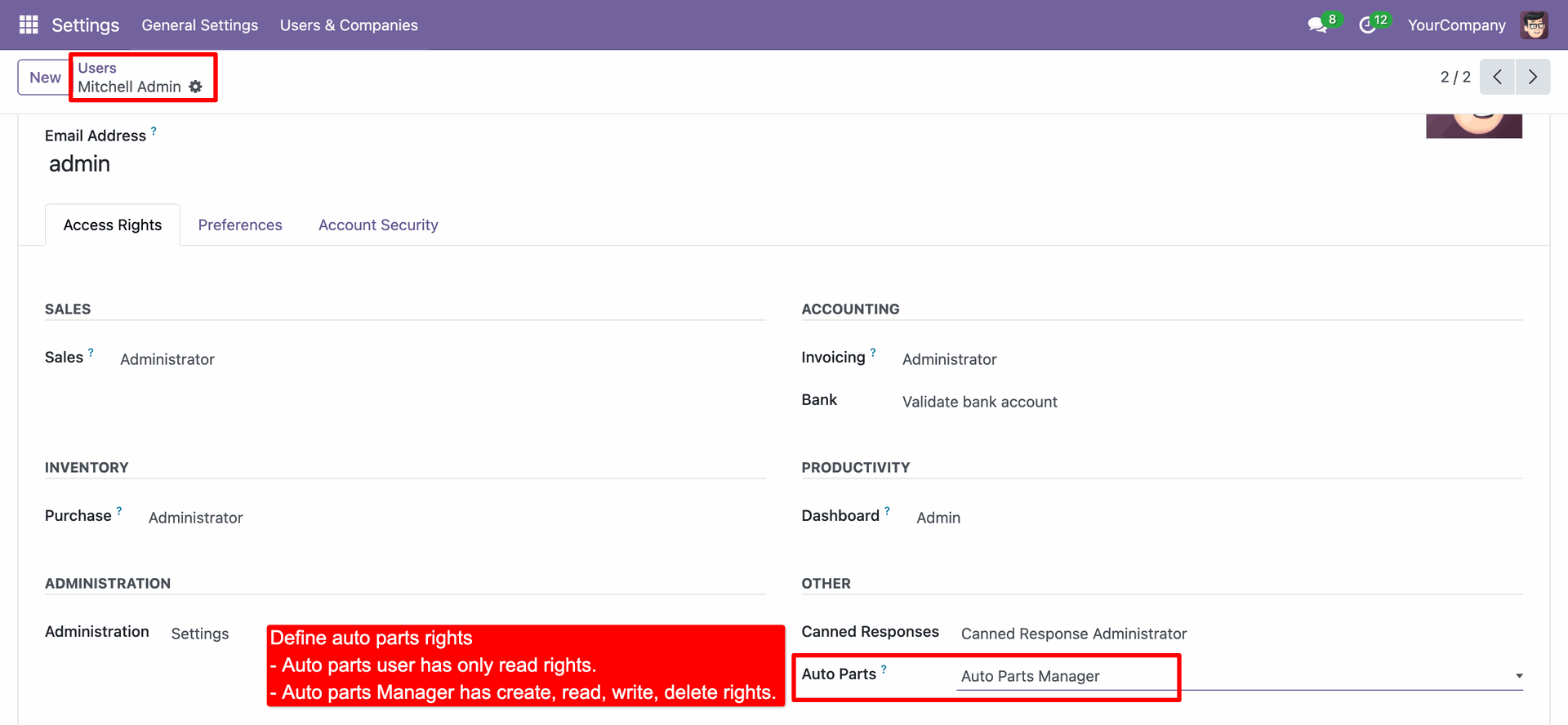 Go to the user settings and assign the 'Auto Parts Manager' access rights under the 'Auto Parts'.