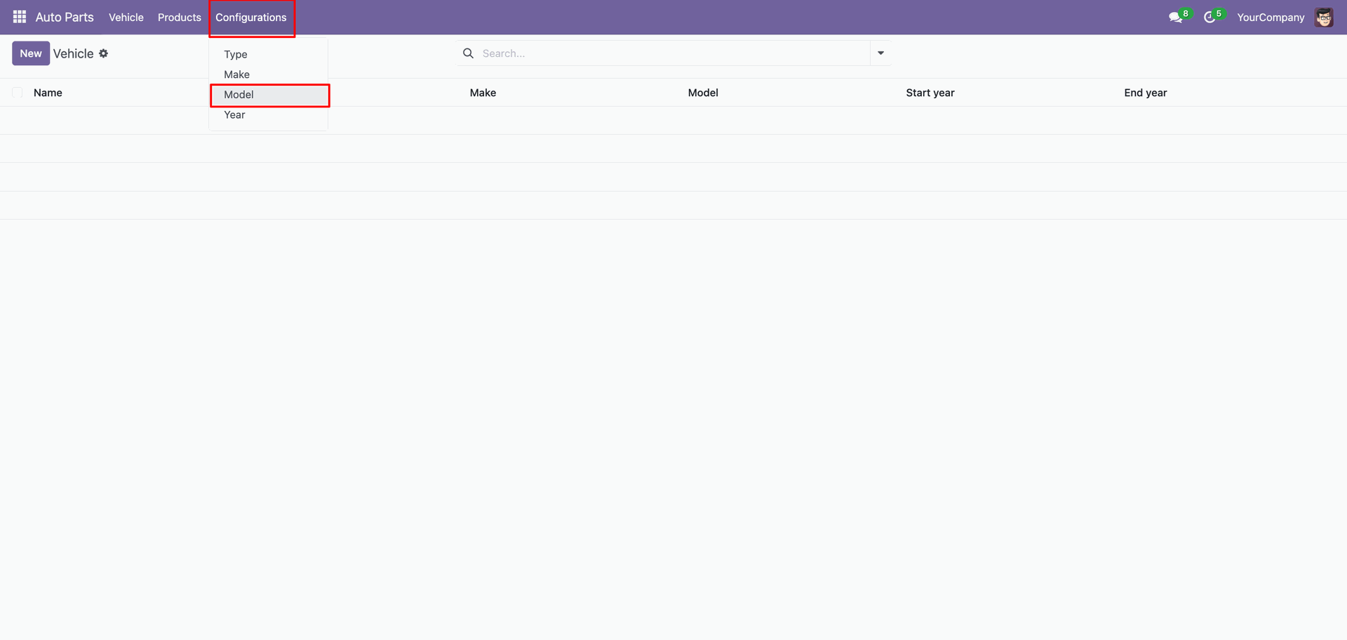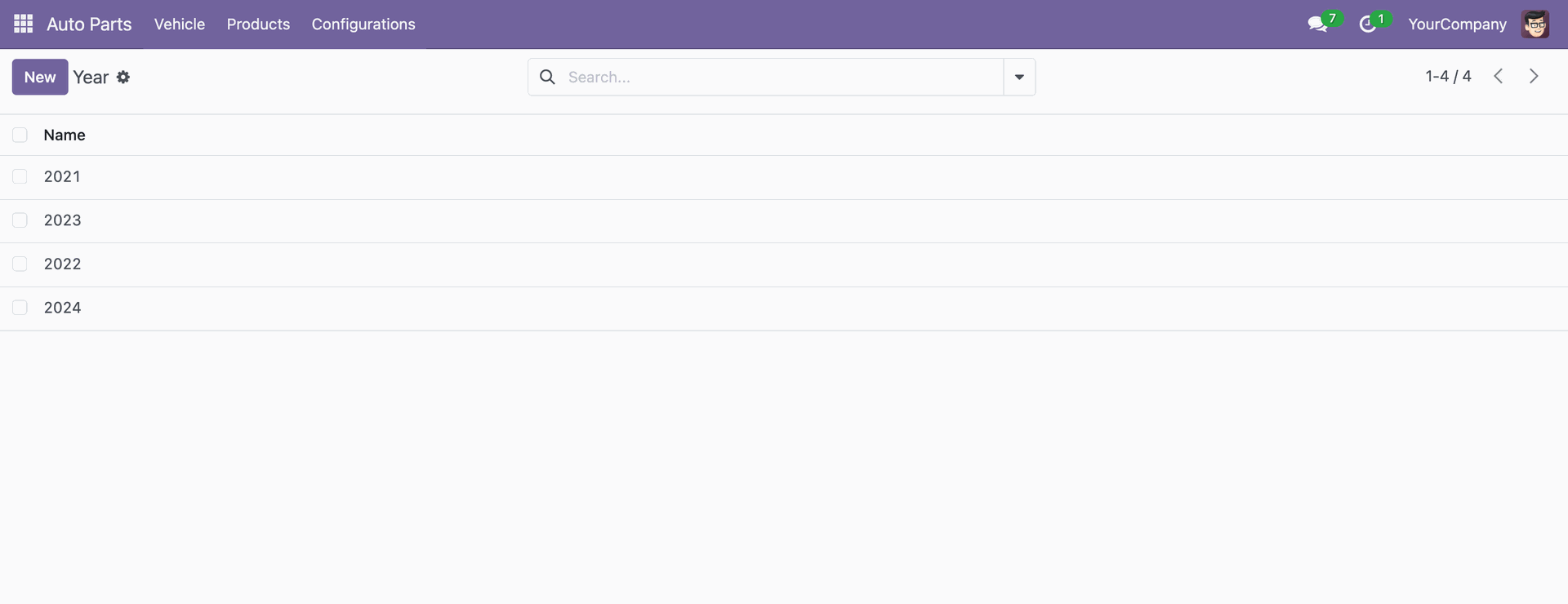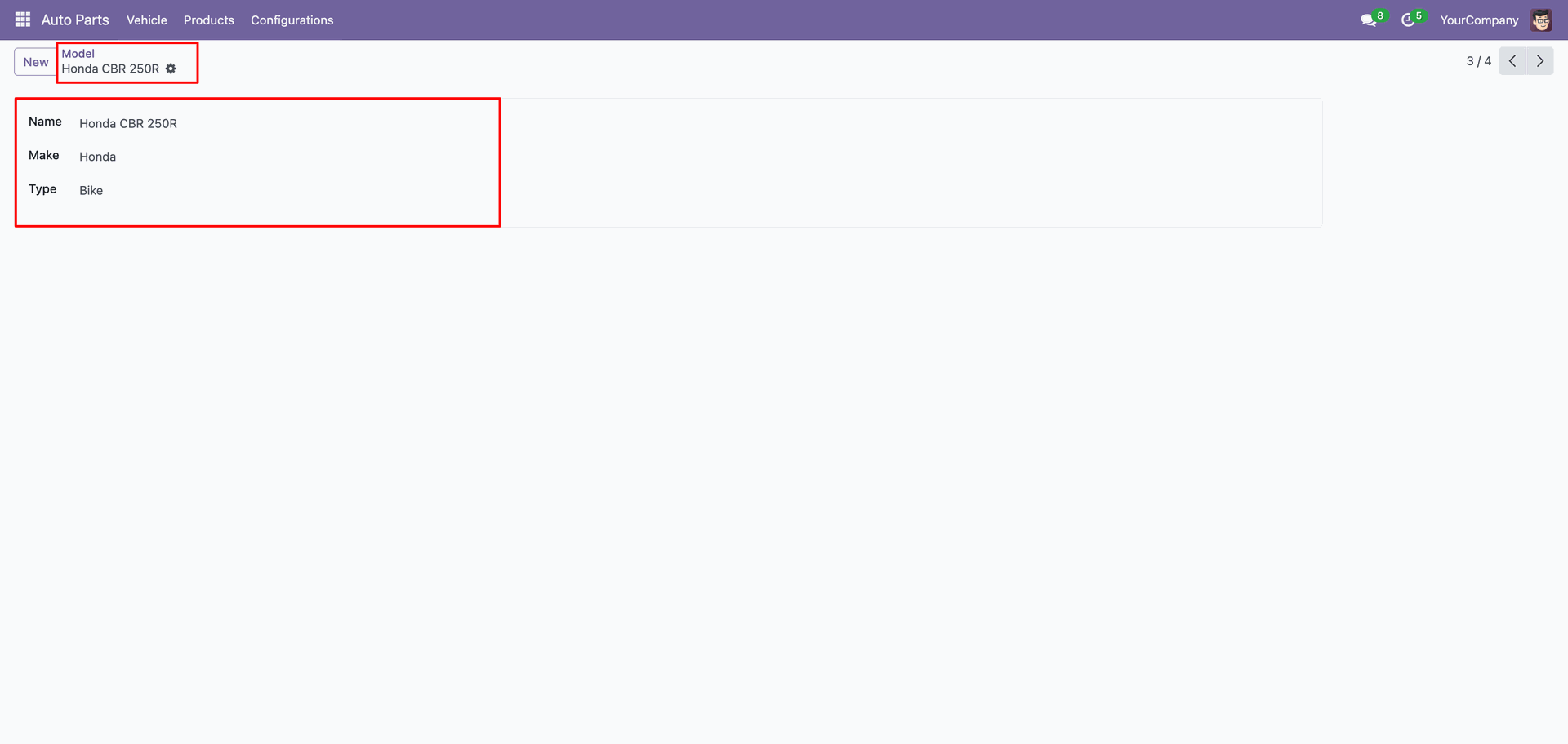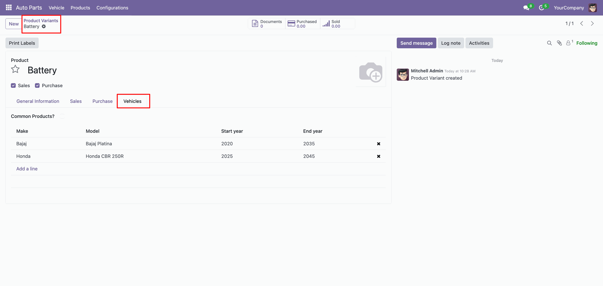 In the product variant form view, you can view the vehicle details under the Vehicle tab.