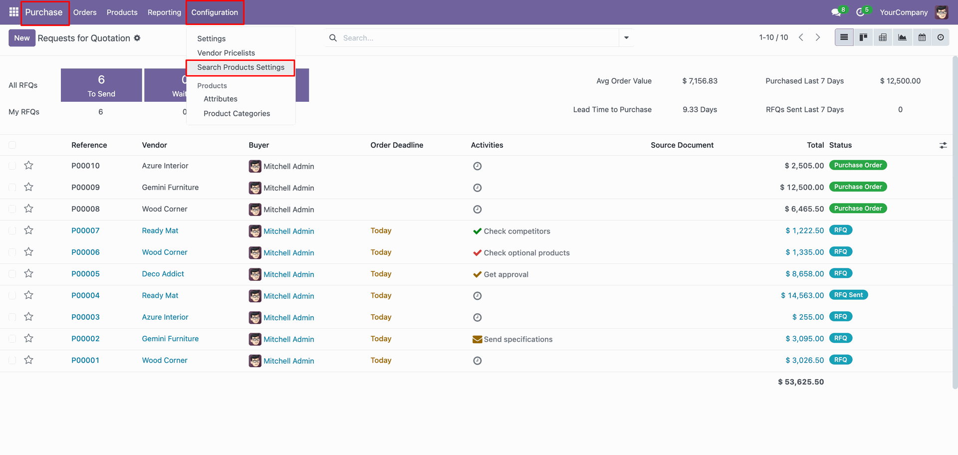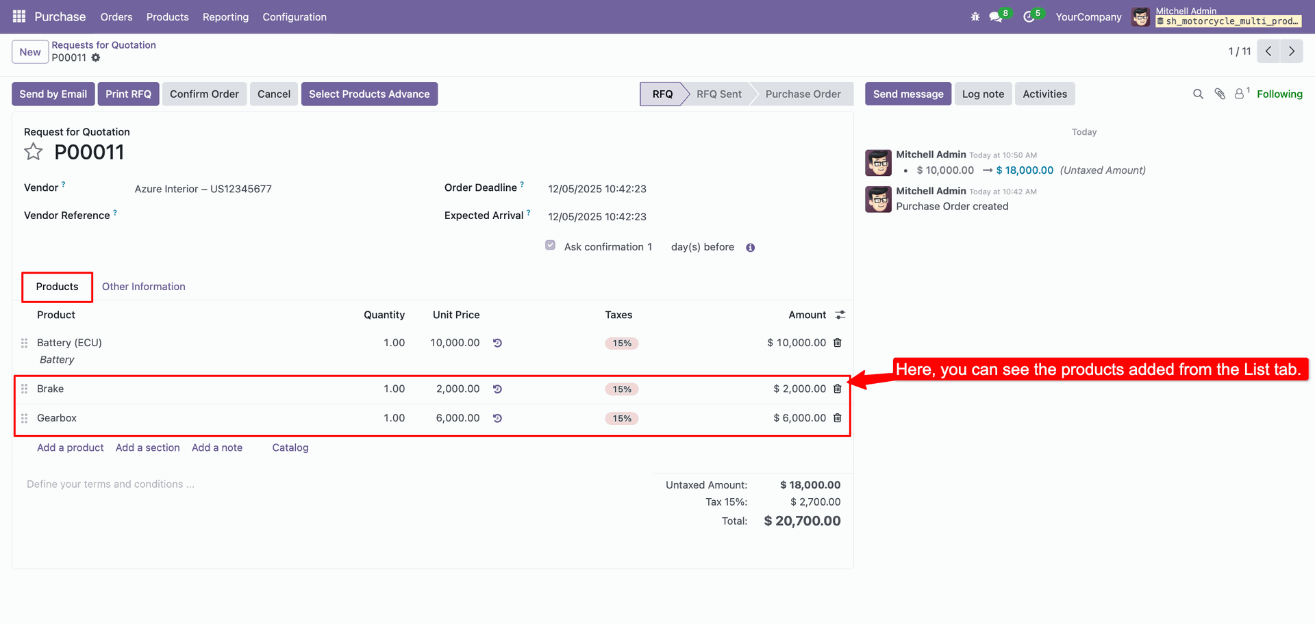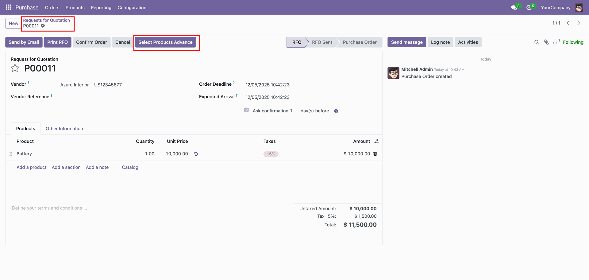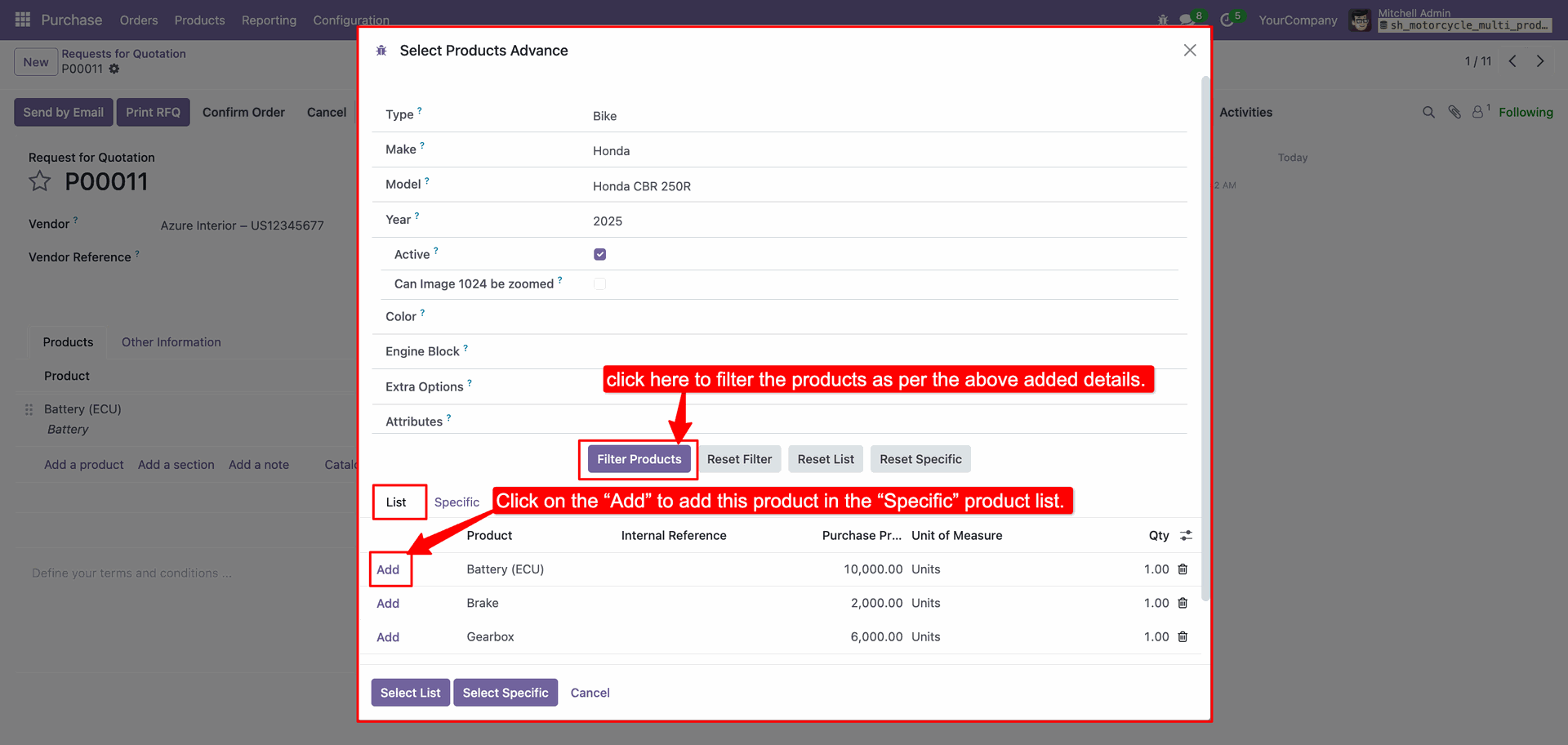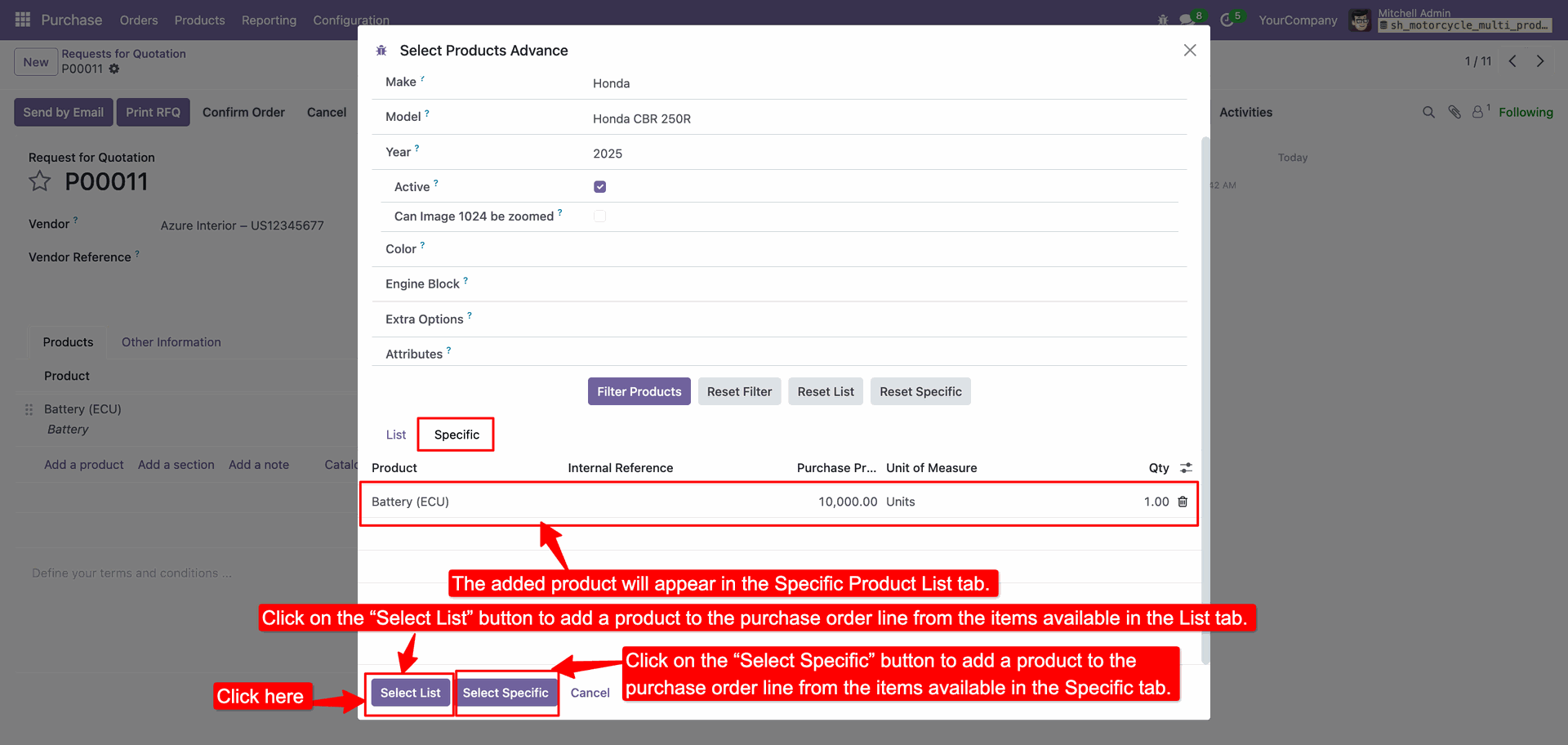 Creating purchase orders with a large number of products can be challenging and time-consuming. To simplify this, our module introduces a "Select Products (Advanced)" button in the purchase order form, allowing users to easily search and filter auto parts using criteria such as type, make, model, year, price, barcode, internal reference, and product attributes. It also offers the ability to save frequently used products in a 'Specific' list for quick selection. This advanced search functionality makes the process easy.