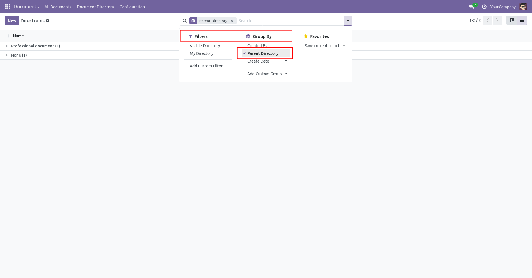 Search documents using the global search bar, apply custom filters, and group documents by directory, created date, or created by.