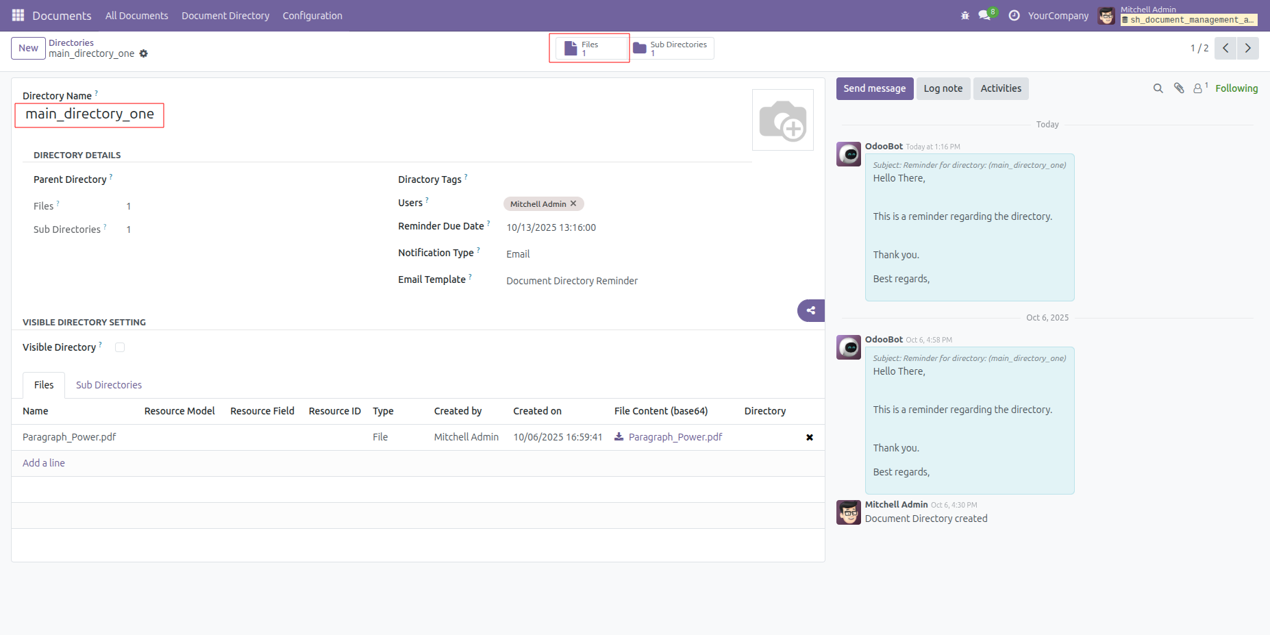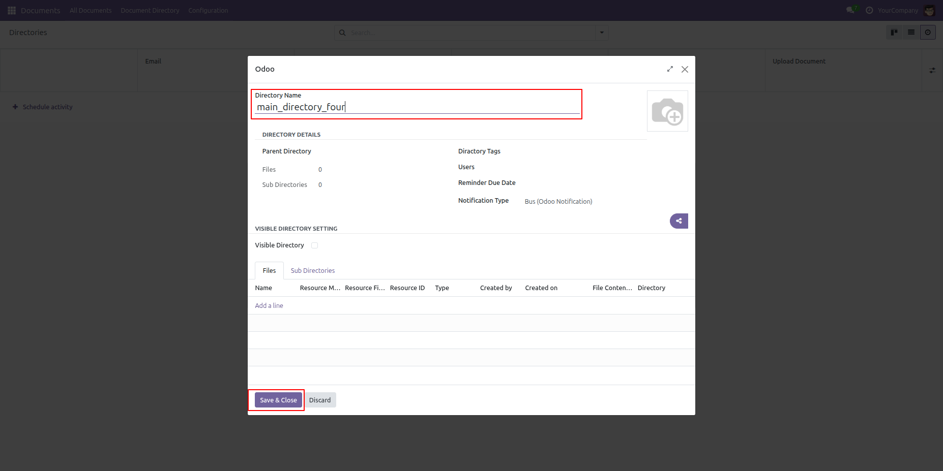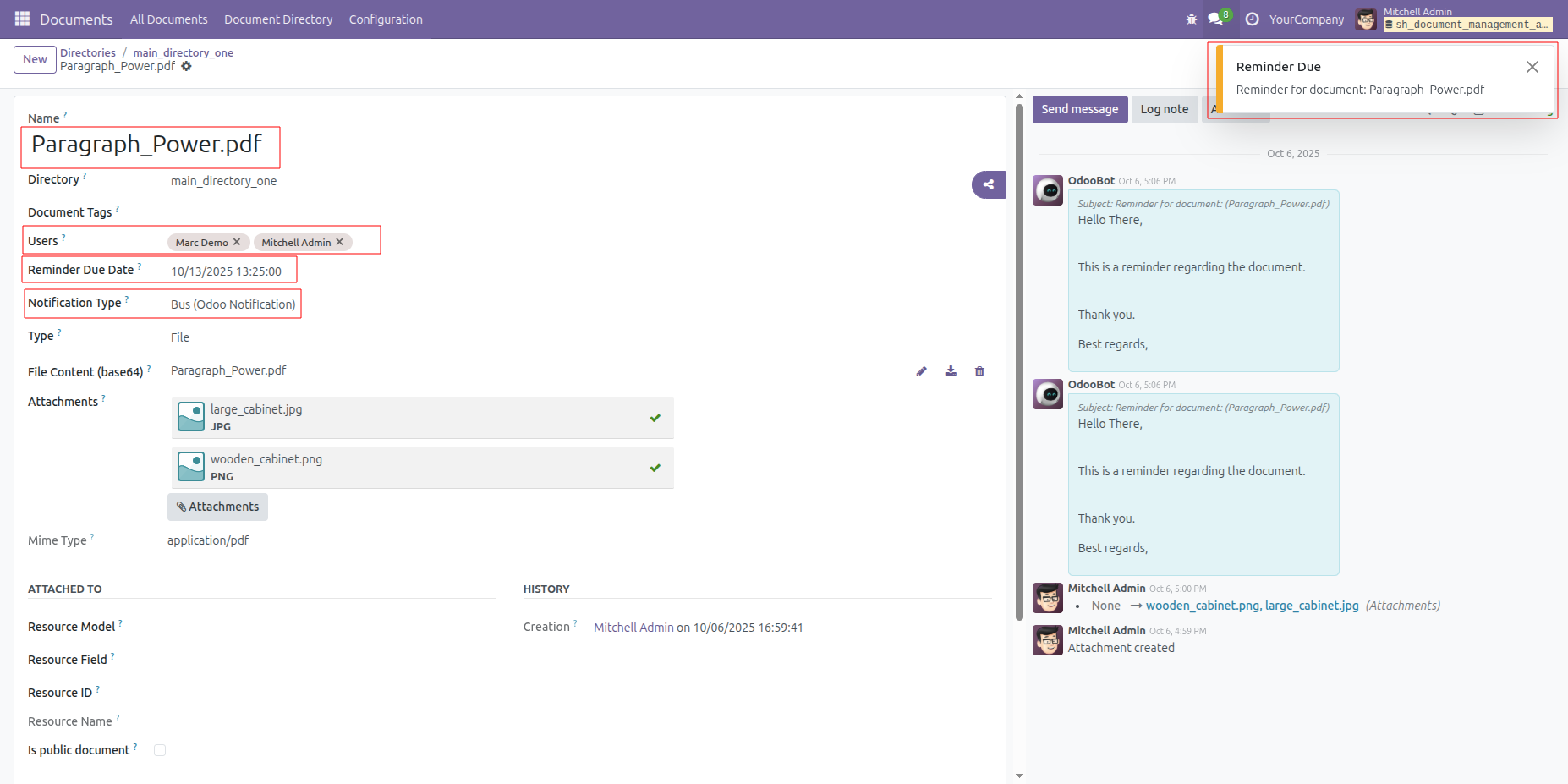 In the files form view, add the details such as User, Reminder Due Date, and Notification Type: Bus (Odoo Notification).