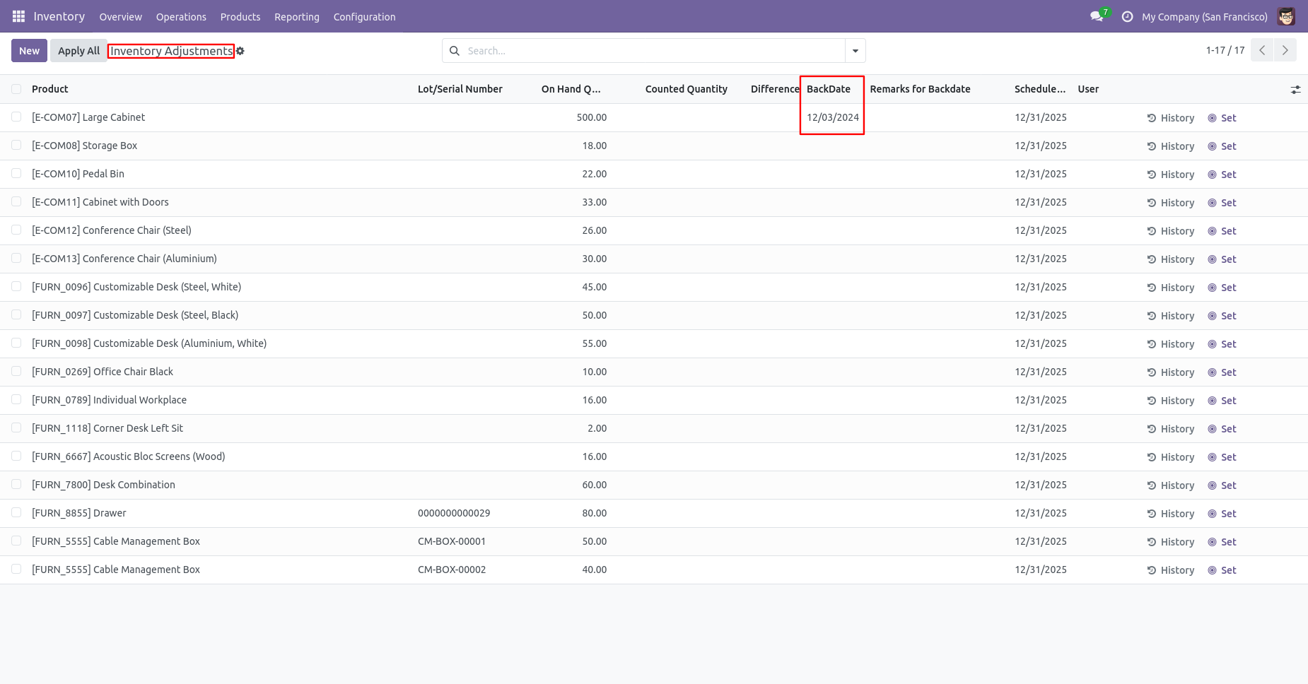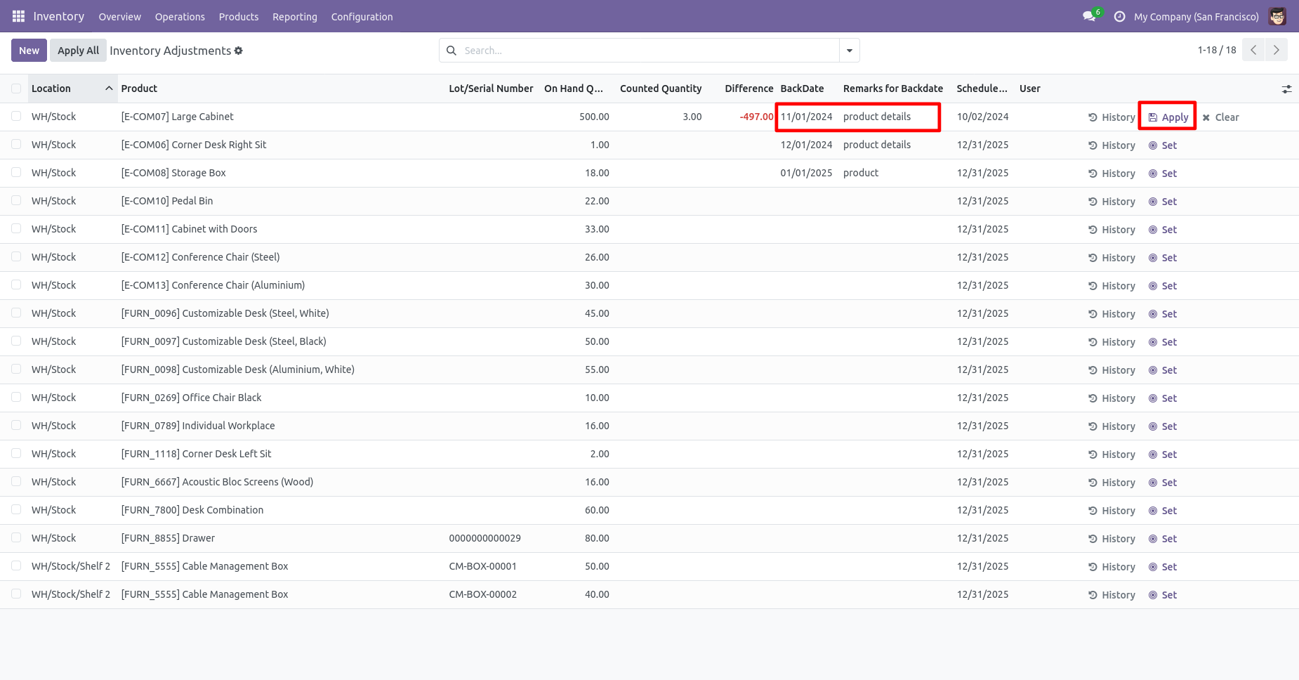 To adjust the inventory, you can select the counted quantity, choose a backdate and then click on "Save and Apply".