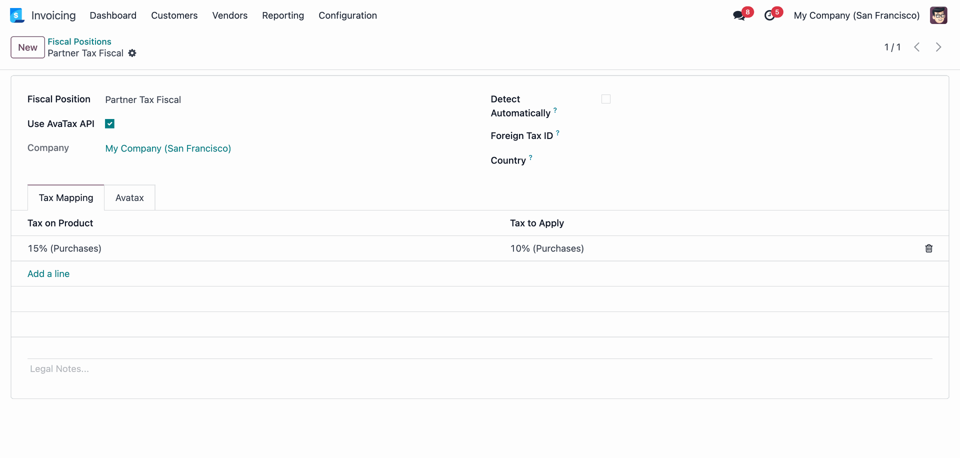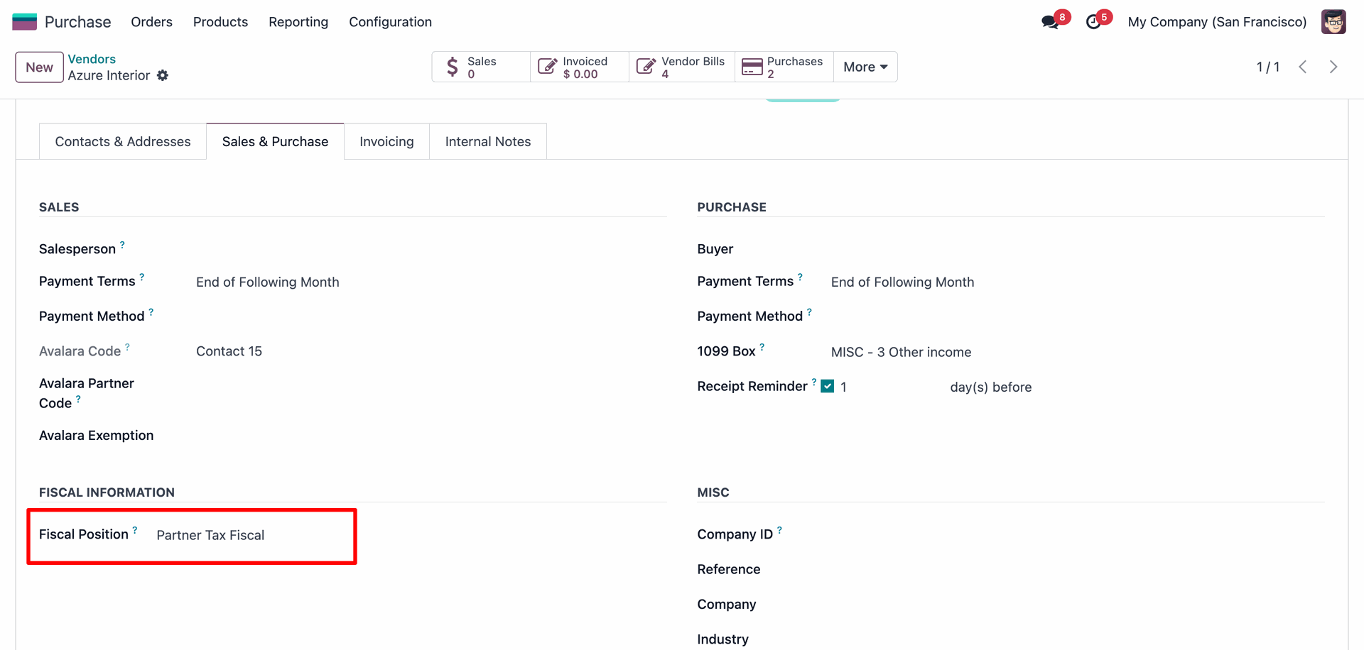 Here we set the Fiscal Possition: Partner Rax Fiscal under the 'Sals & Purchase' tab.
