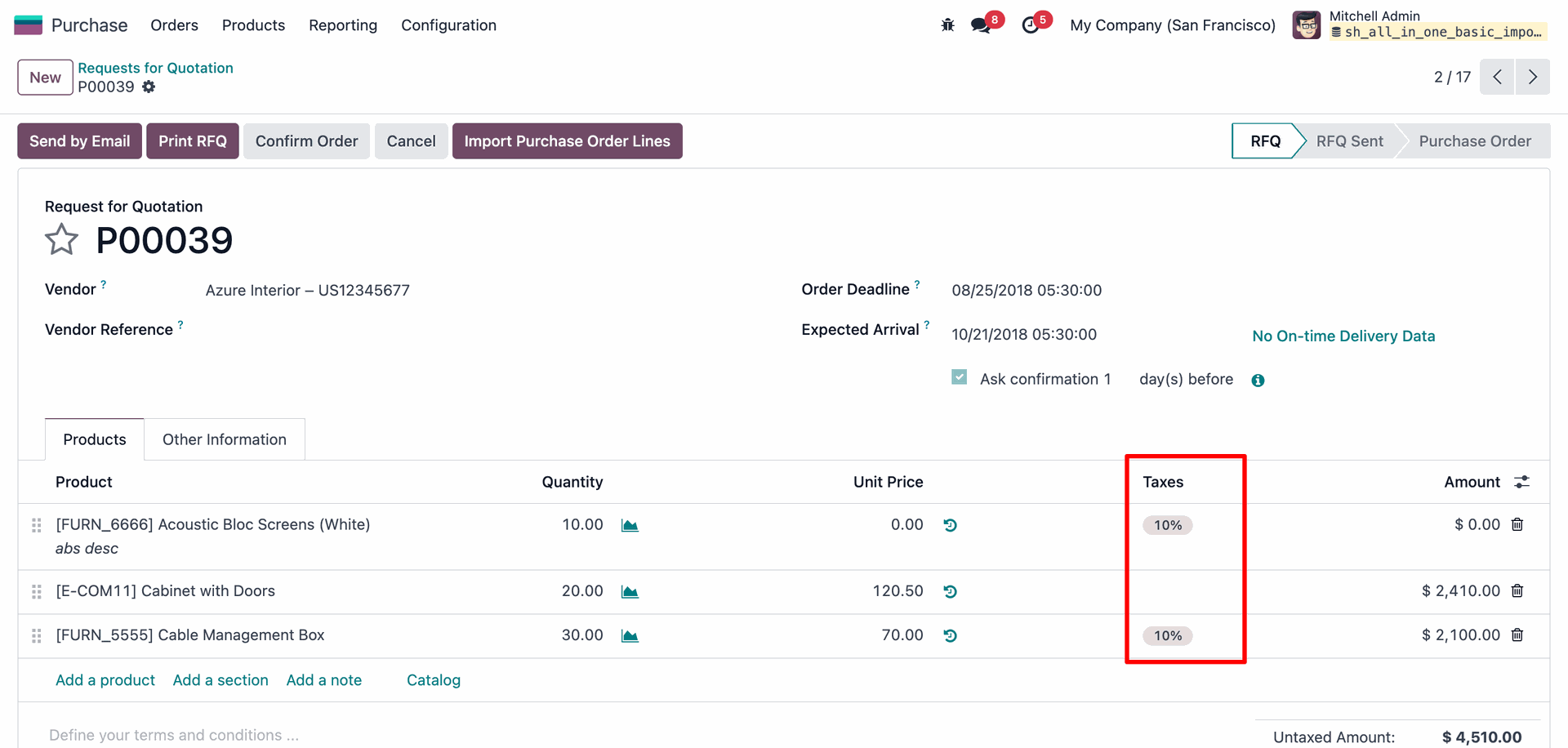 In the XLS file, we have set a 10% tax to the 'Acoustic Bloc Screens' product.