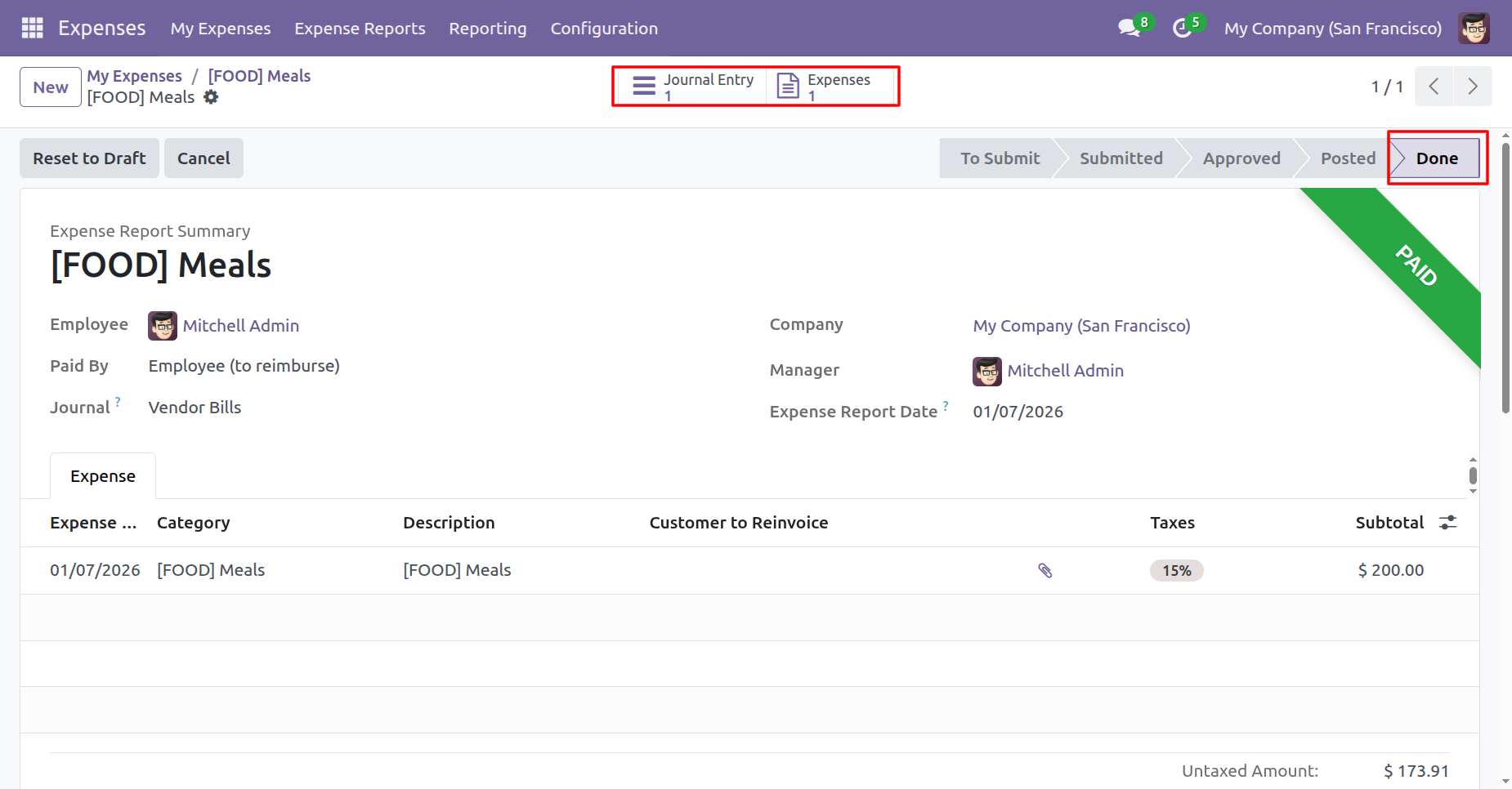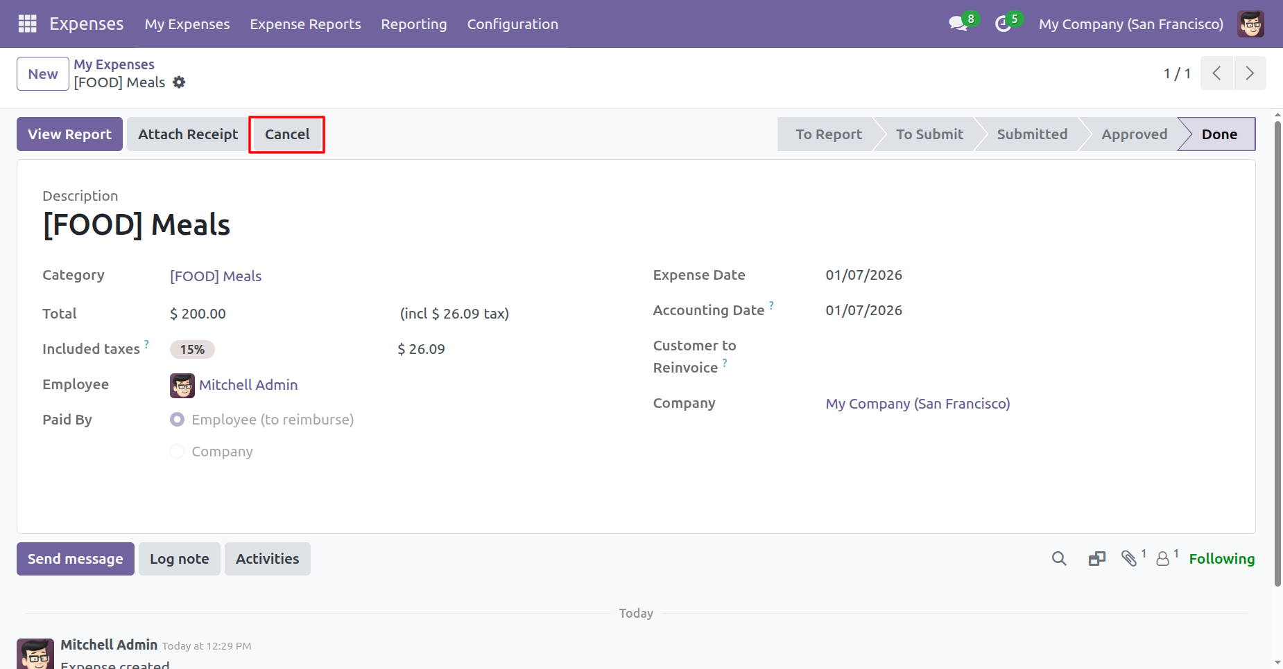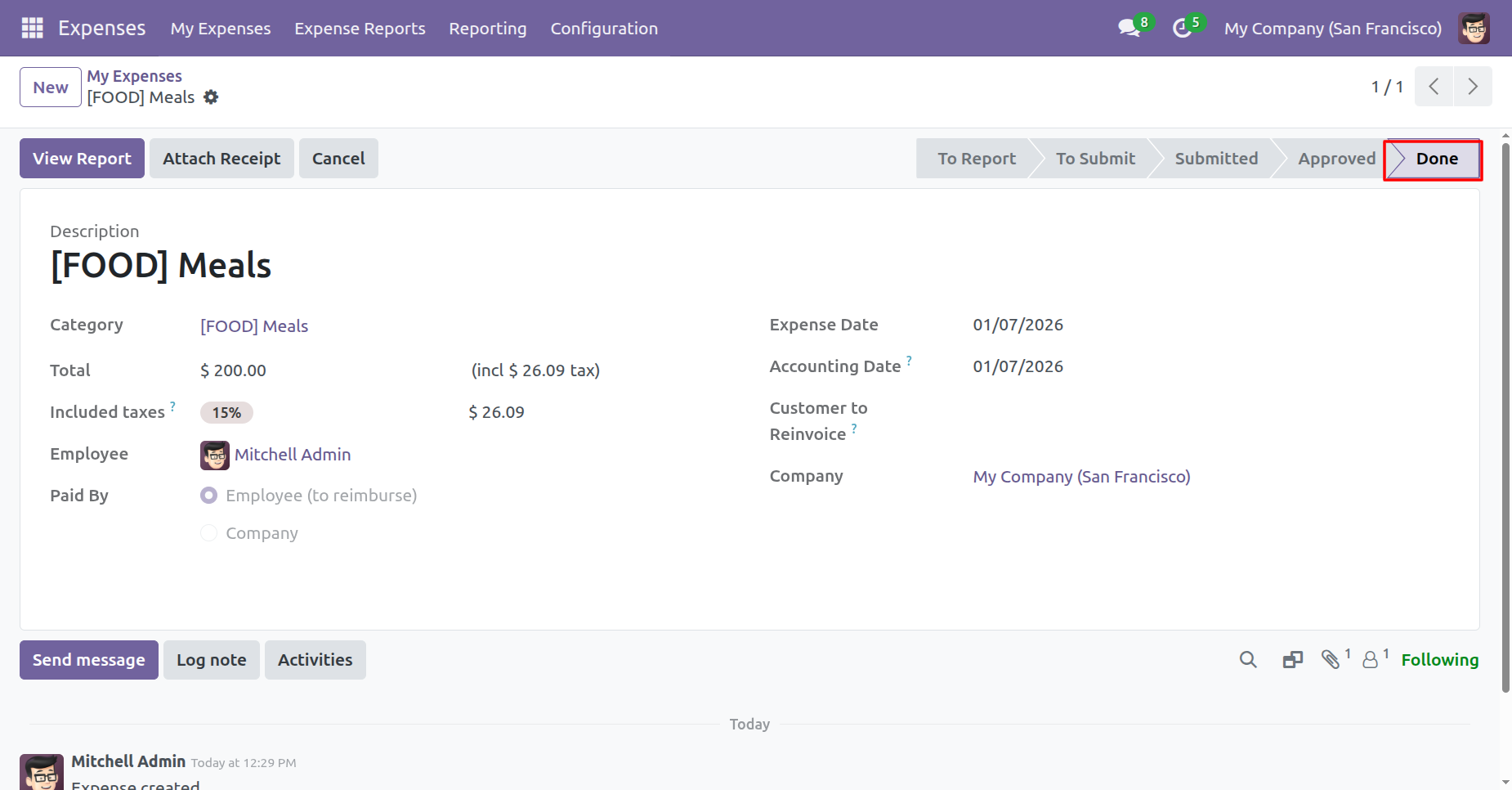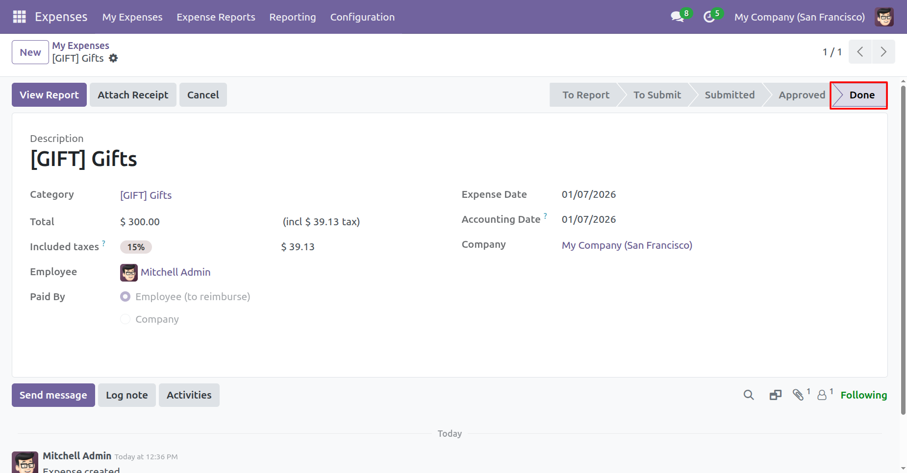The expense is in the 'Done' stage.