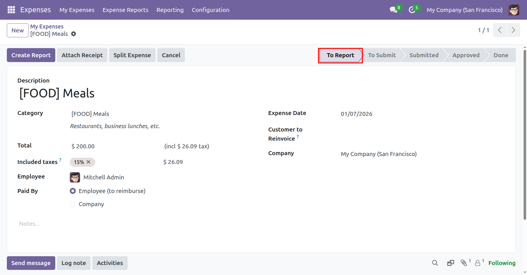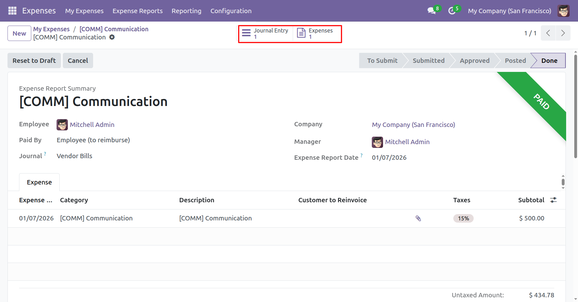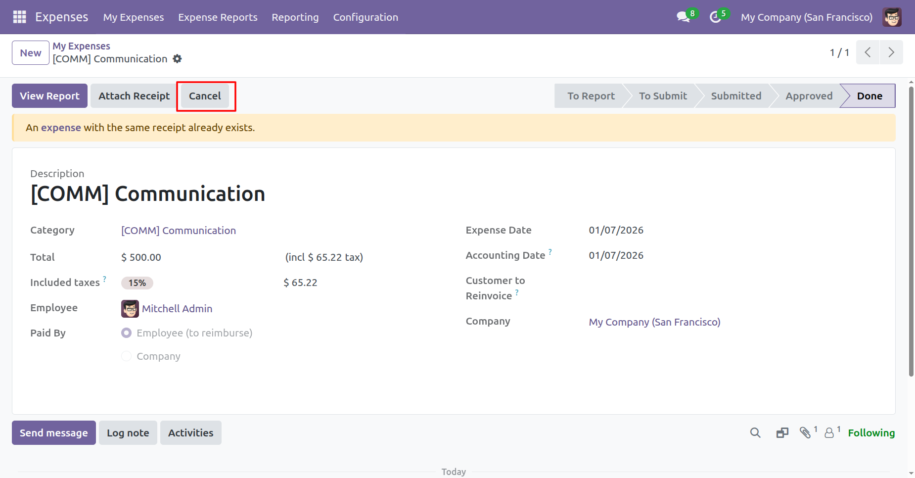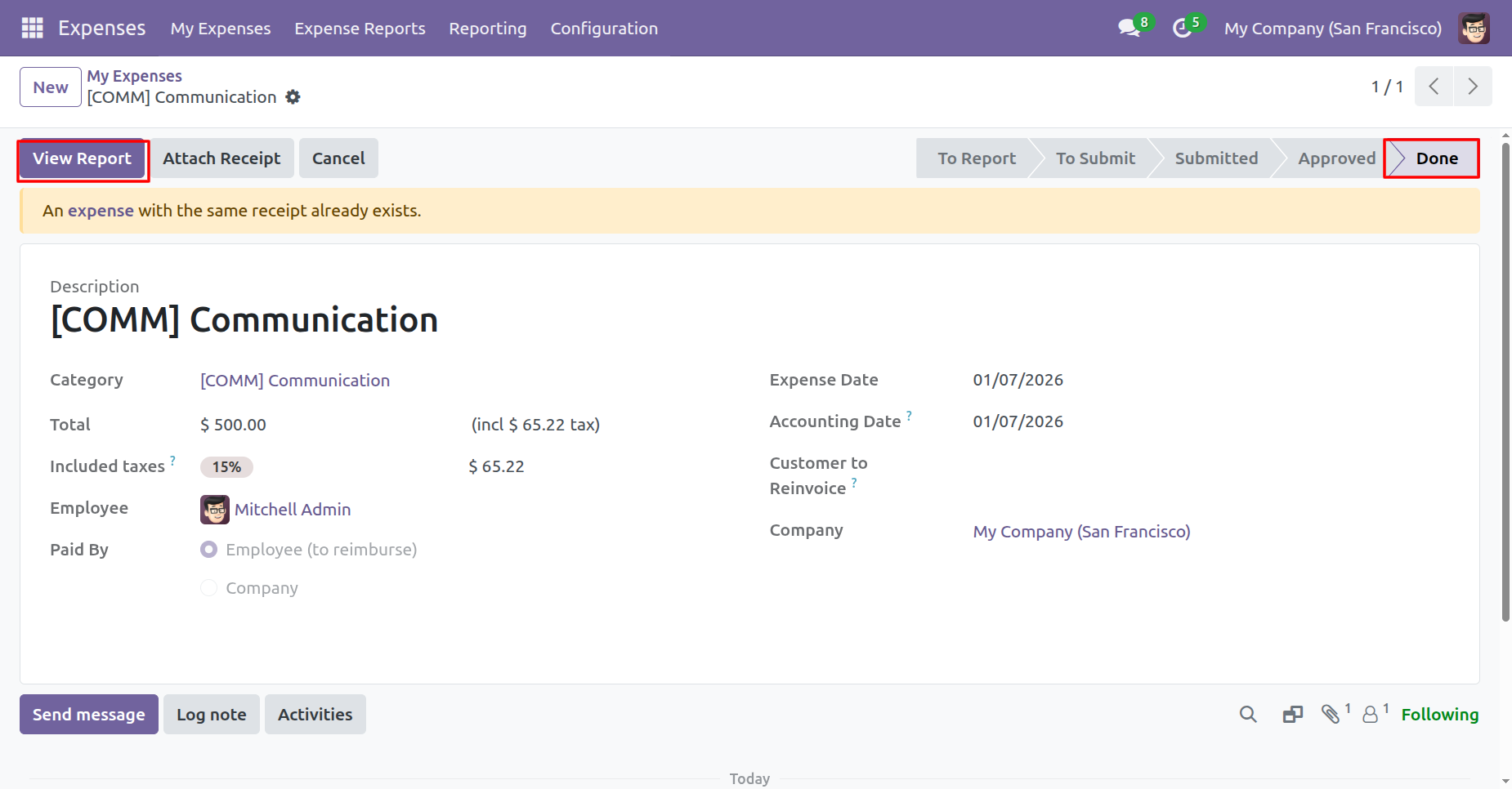 The expense is in the 'Done' stage.