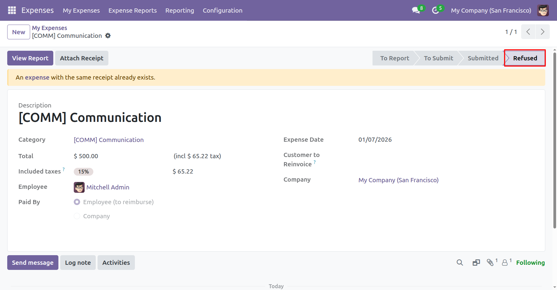 When you cancel a expense then the expense is cancelled and the state is changed to 'Refused'.