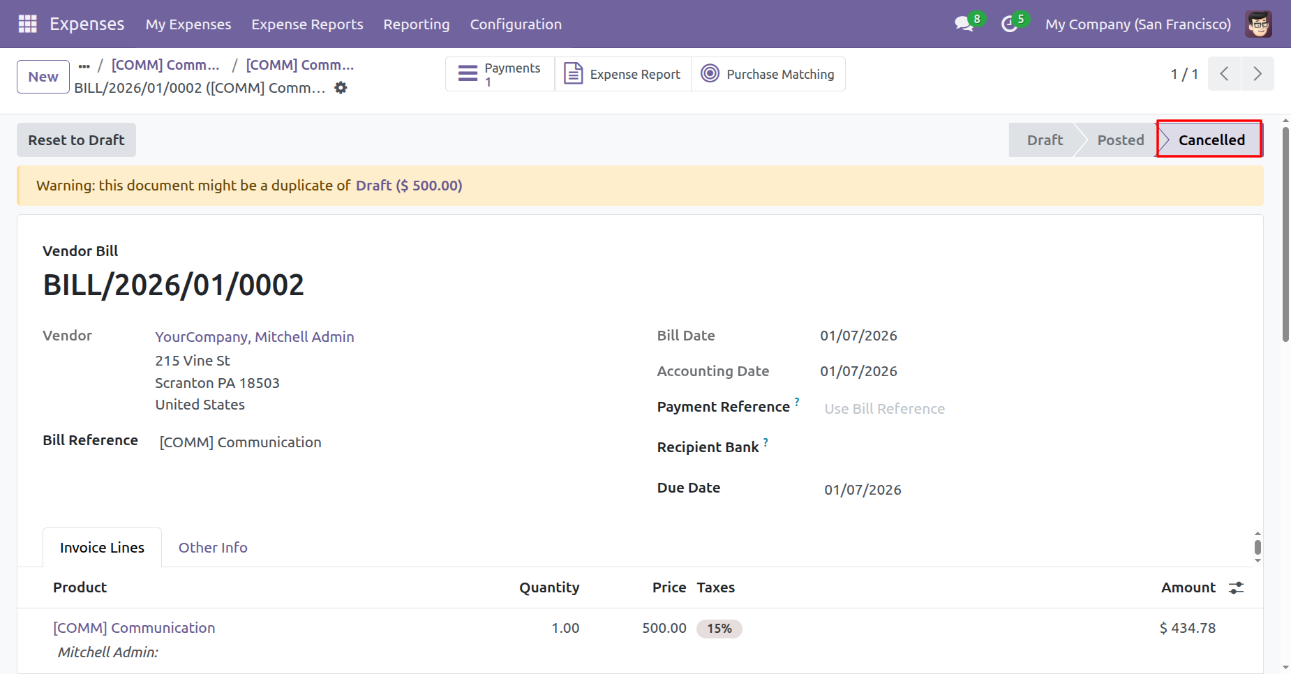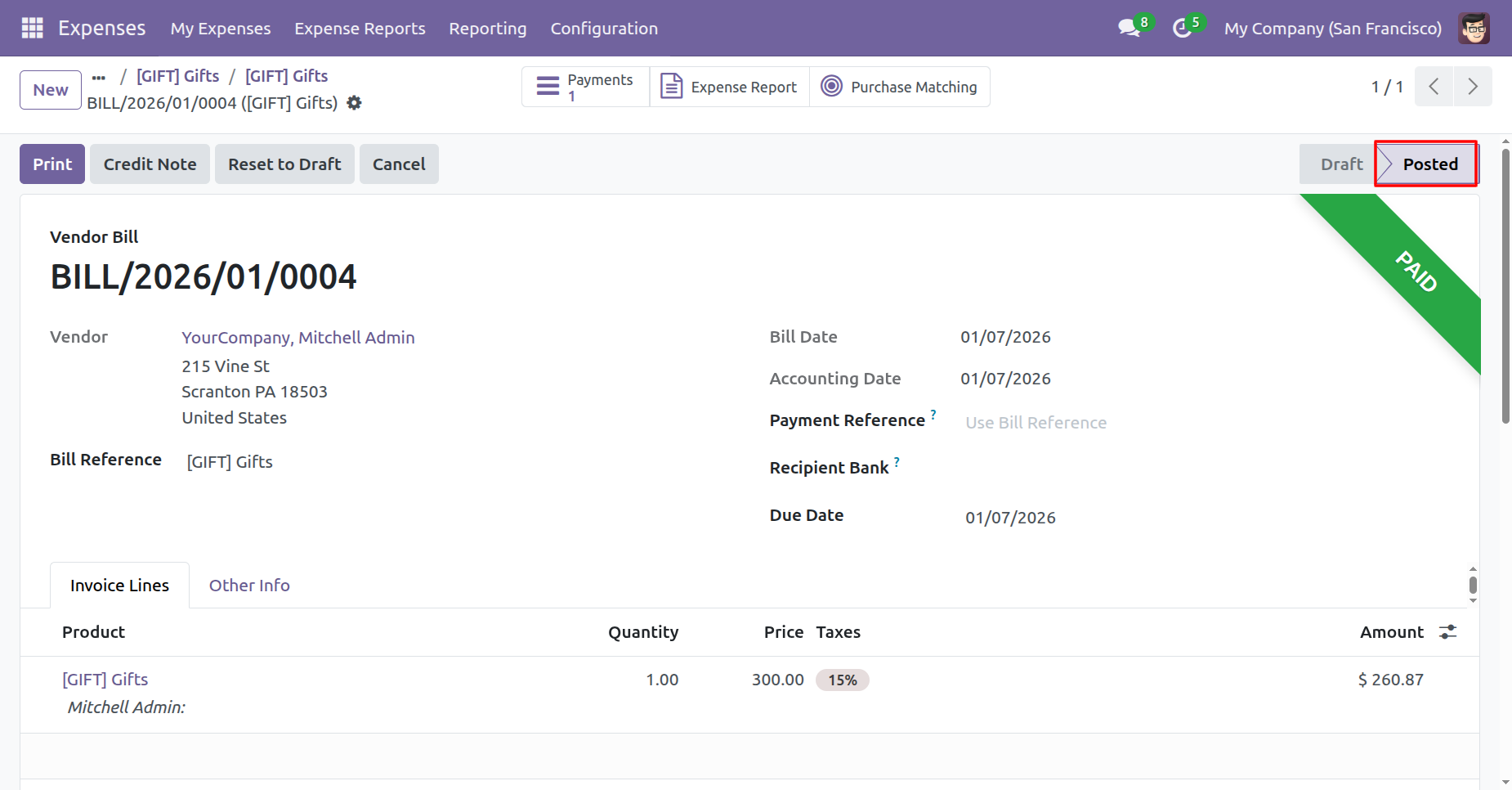 The vendor bill is in 'Posted' stage.