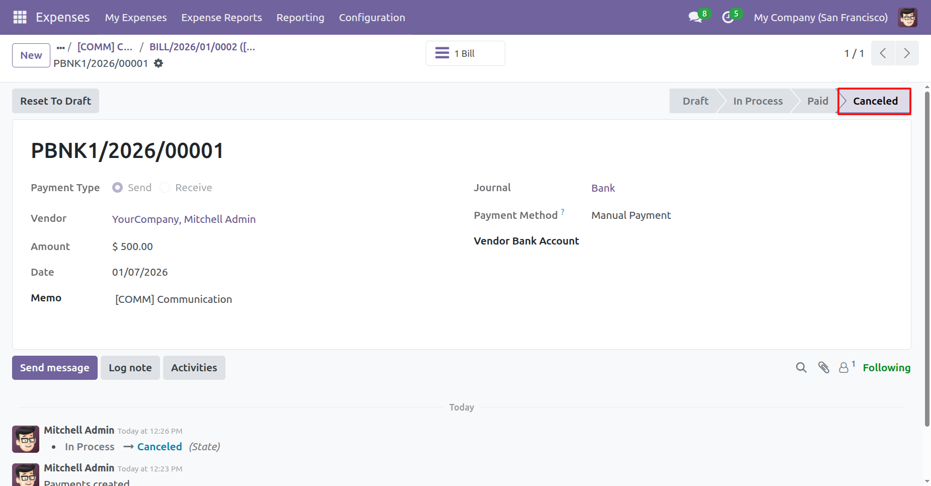 After canceling the expense it reset to the draft and the state is changed to 'To Report'..