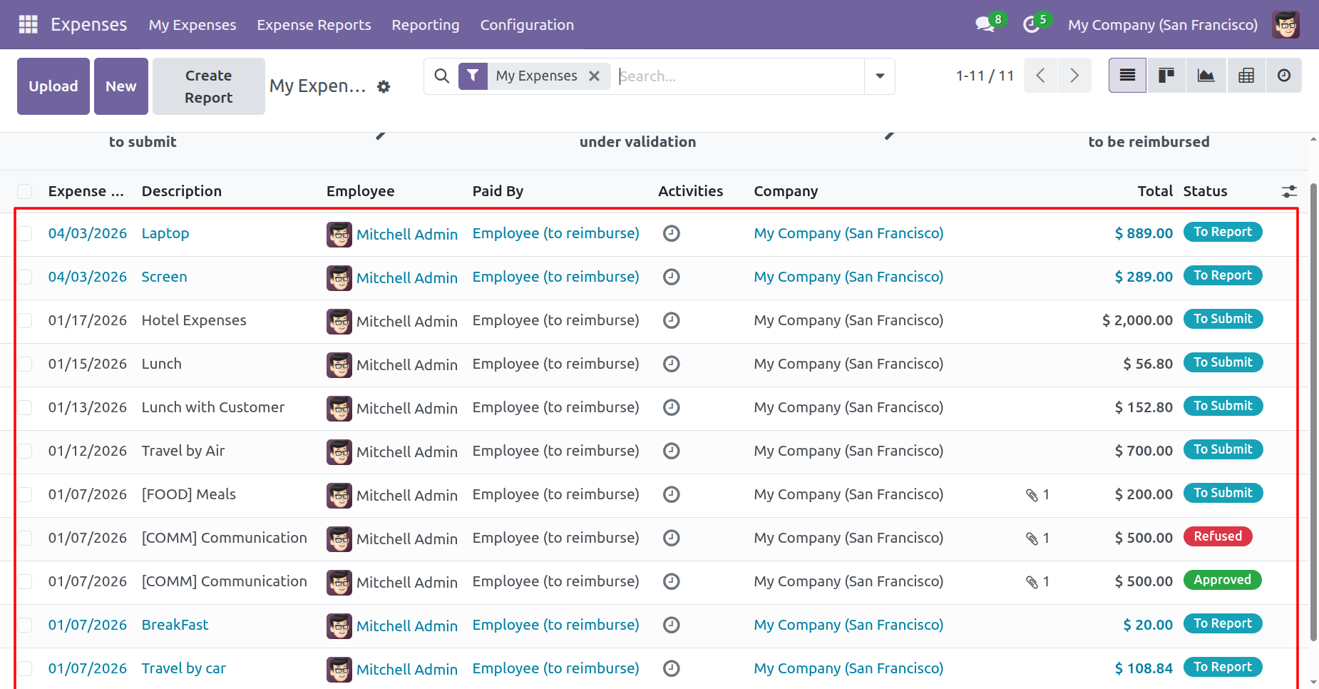 expenses(from tree view) with the following options: