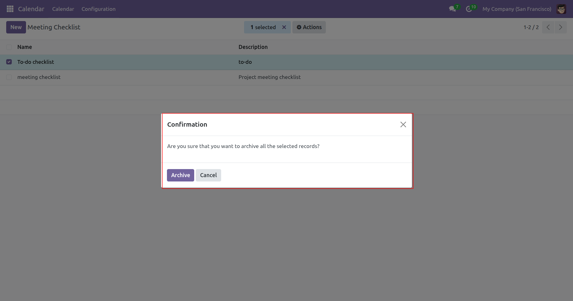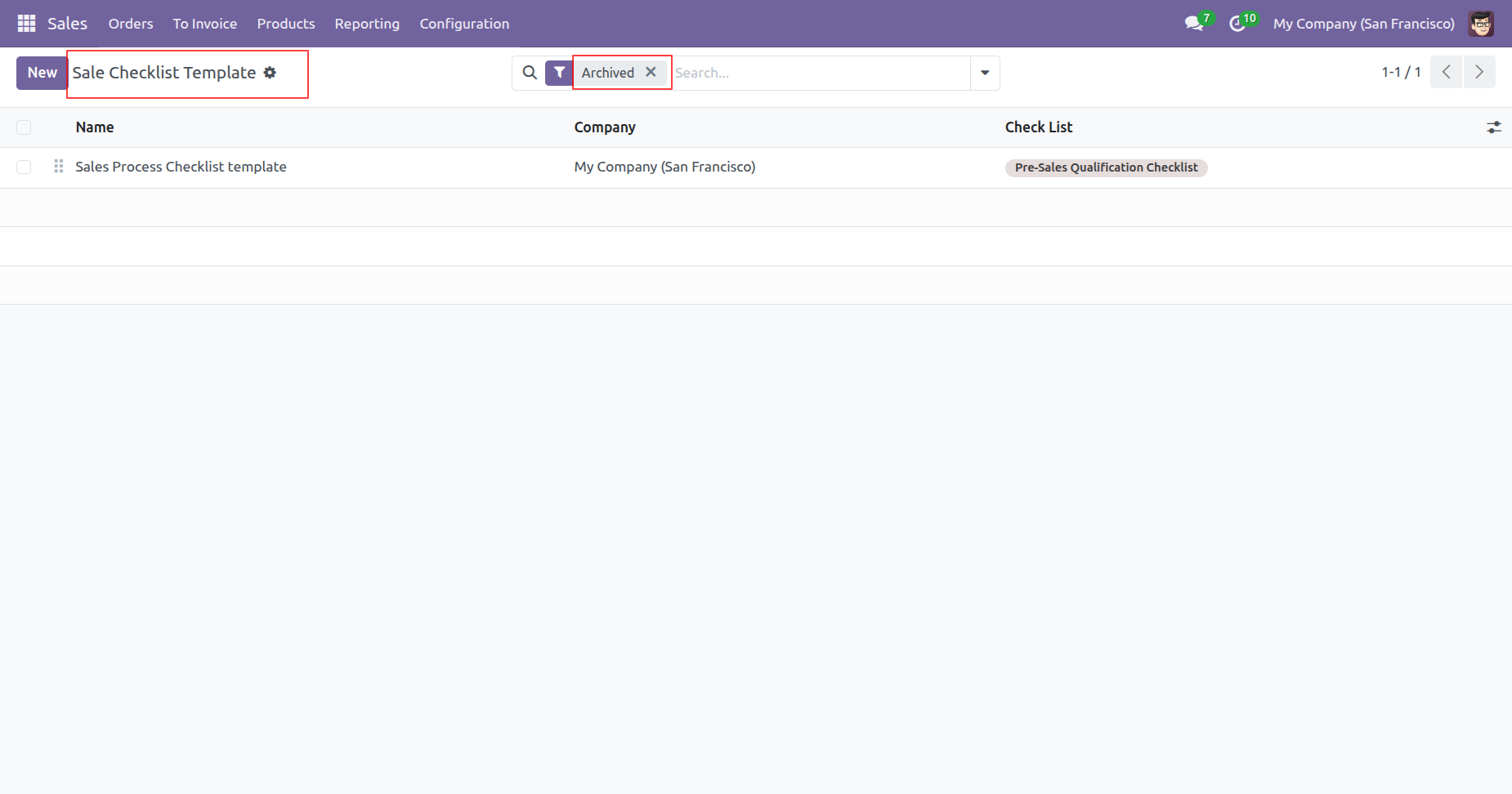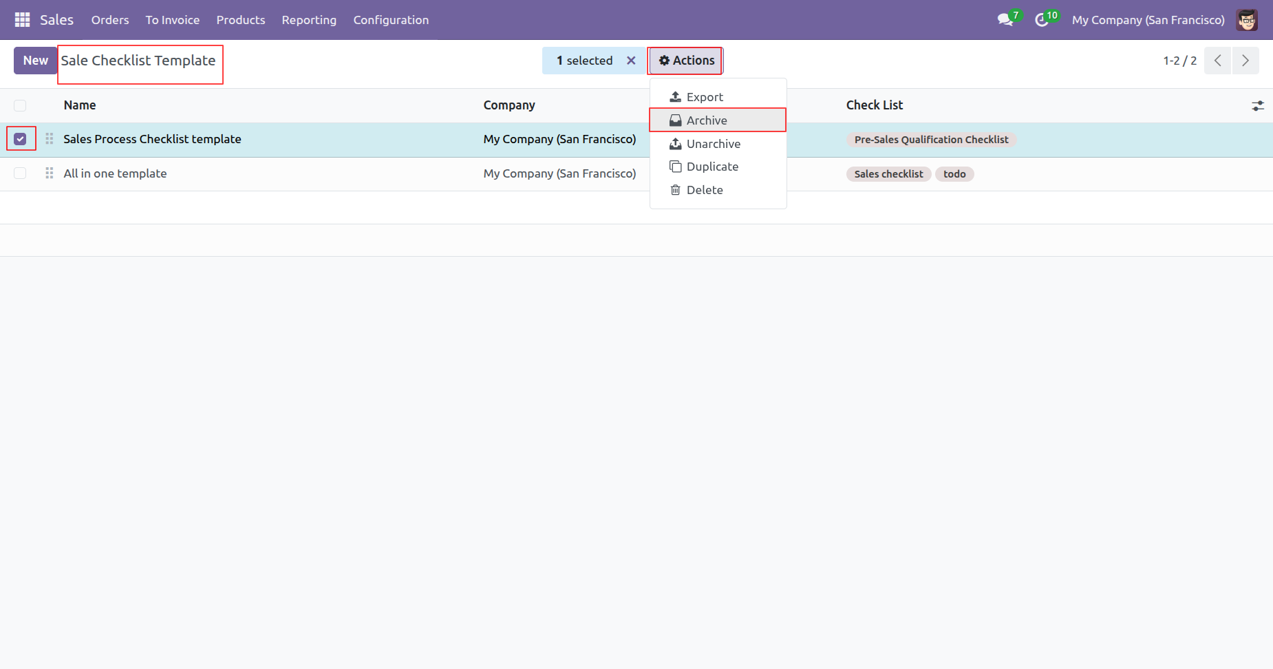 Select the sale checklist template and click on the 'Archive' option from the Actions menu.