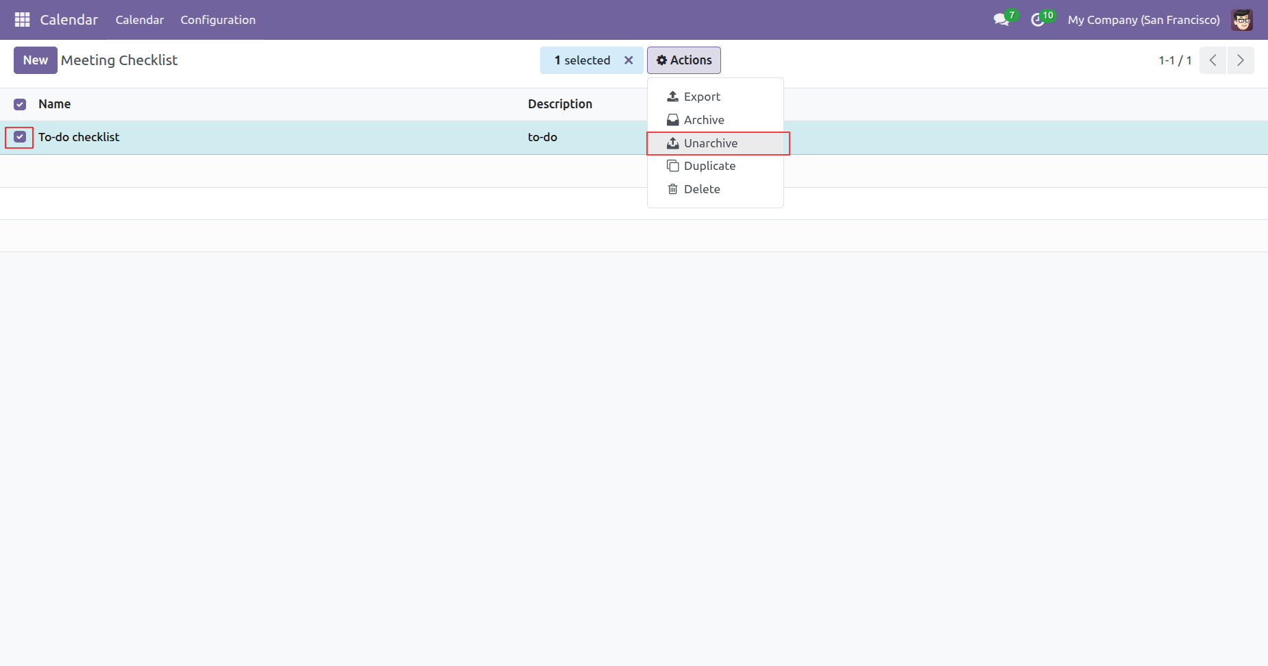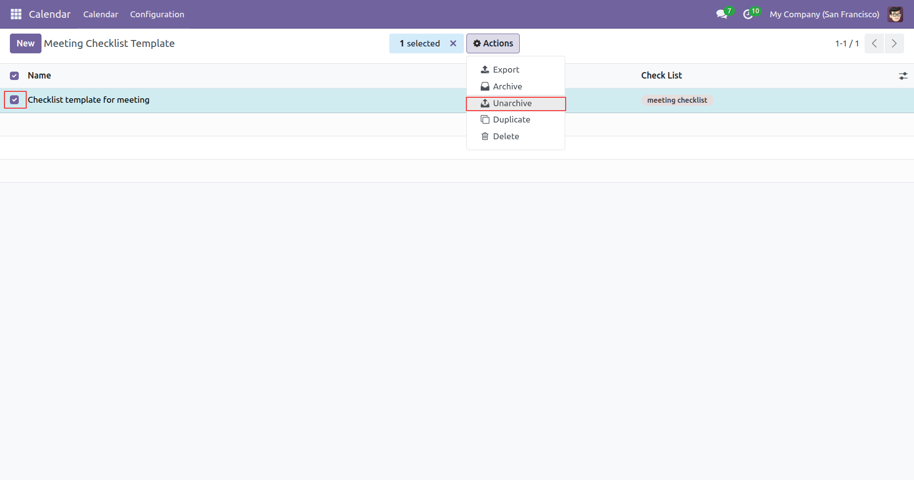 Select the meeting checklist template and click on the 'Unarchive' option from the Actions menu.