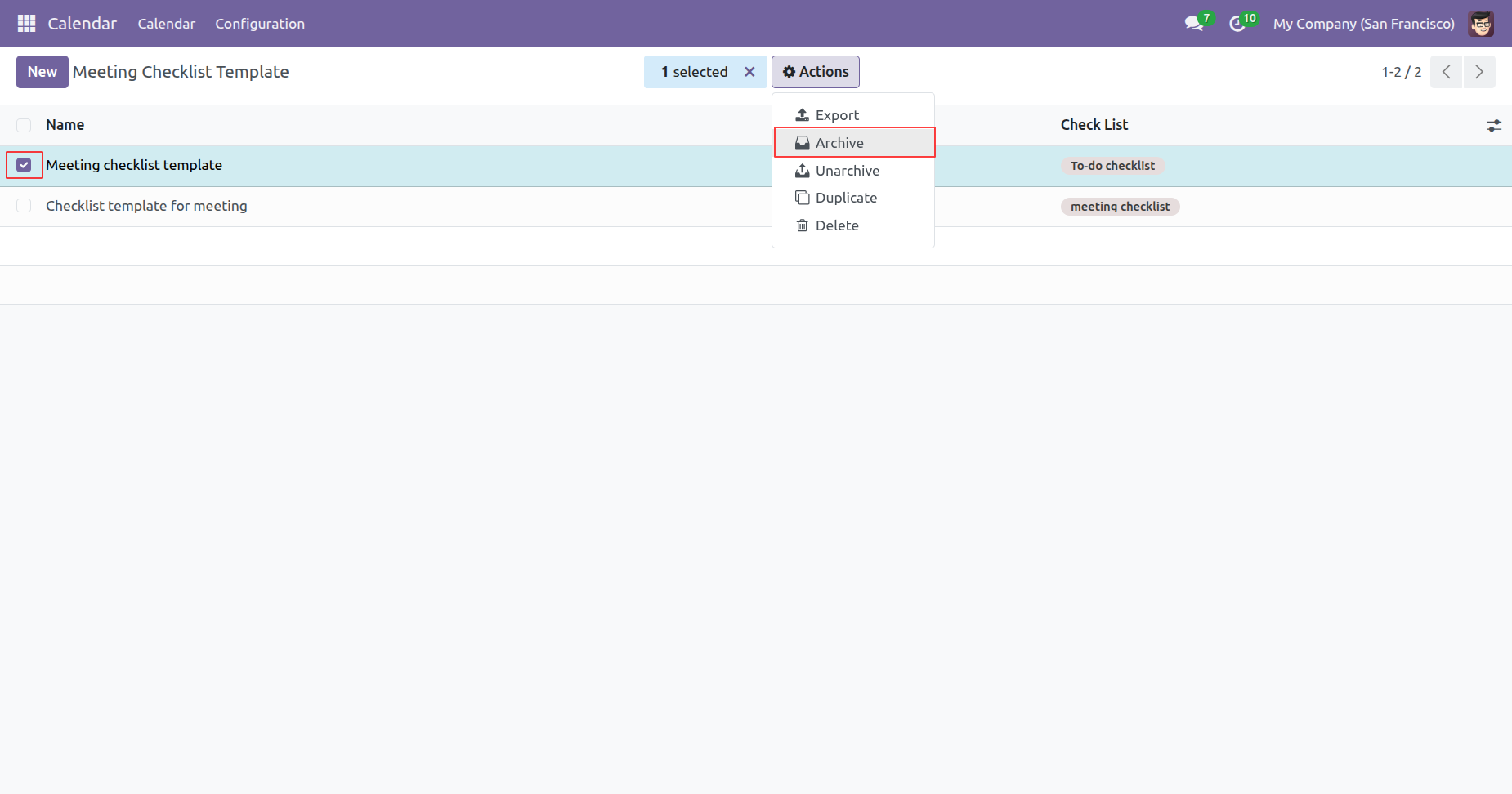 Select the meeting checklist template and click on the 'Archive' option from the Actions menu.
