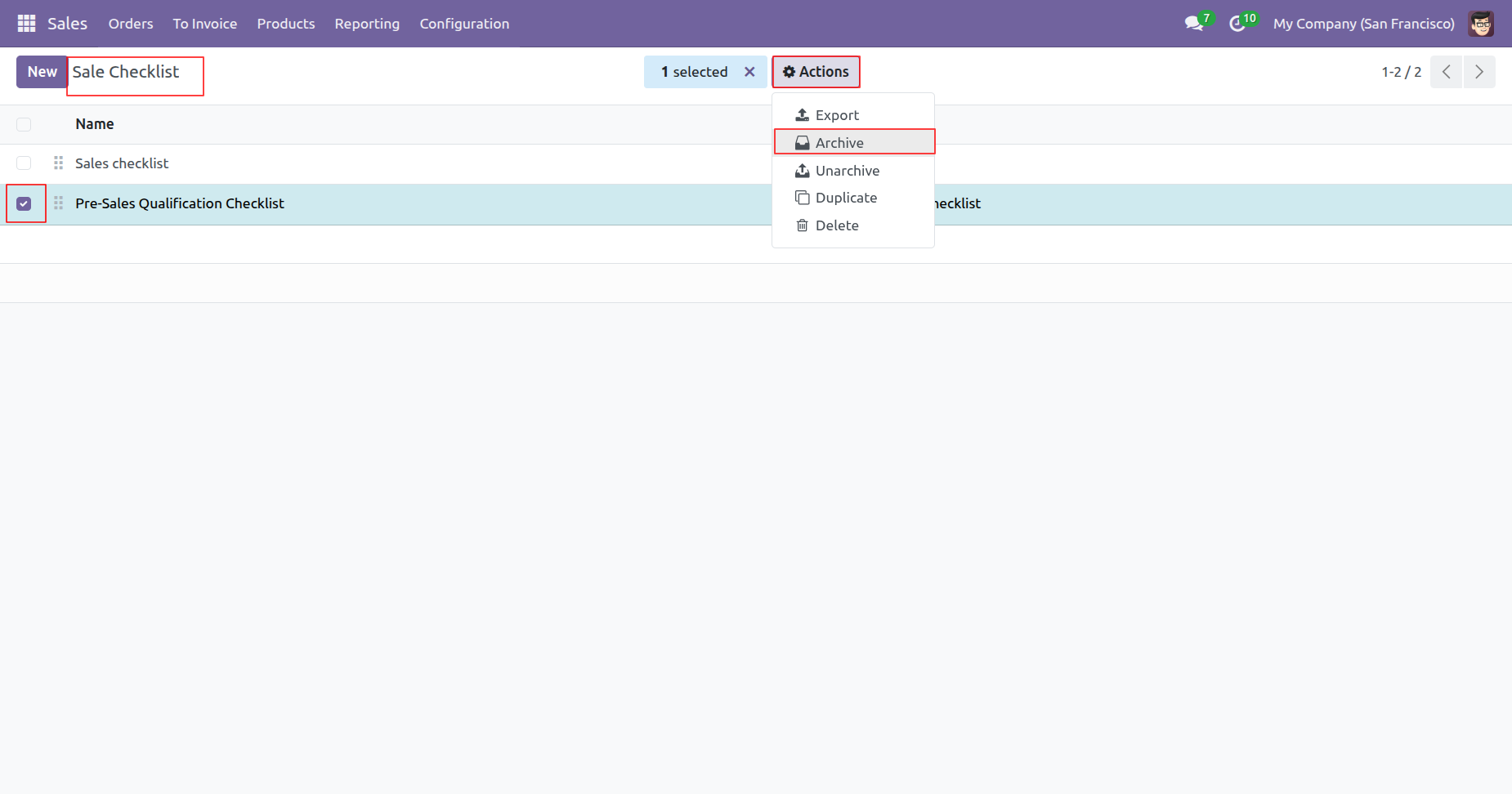 Select the sale checklist and click on the 'Archive' option from the Actions menu.