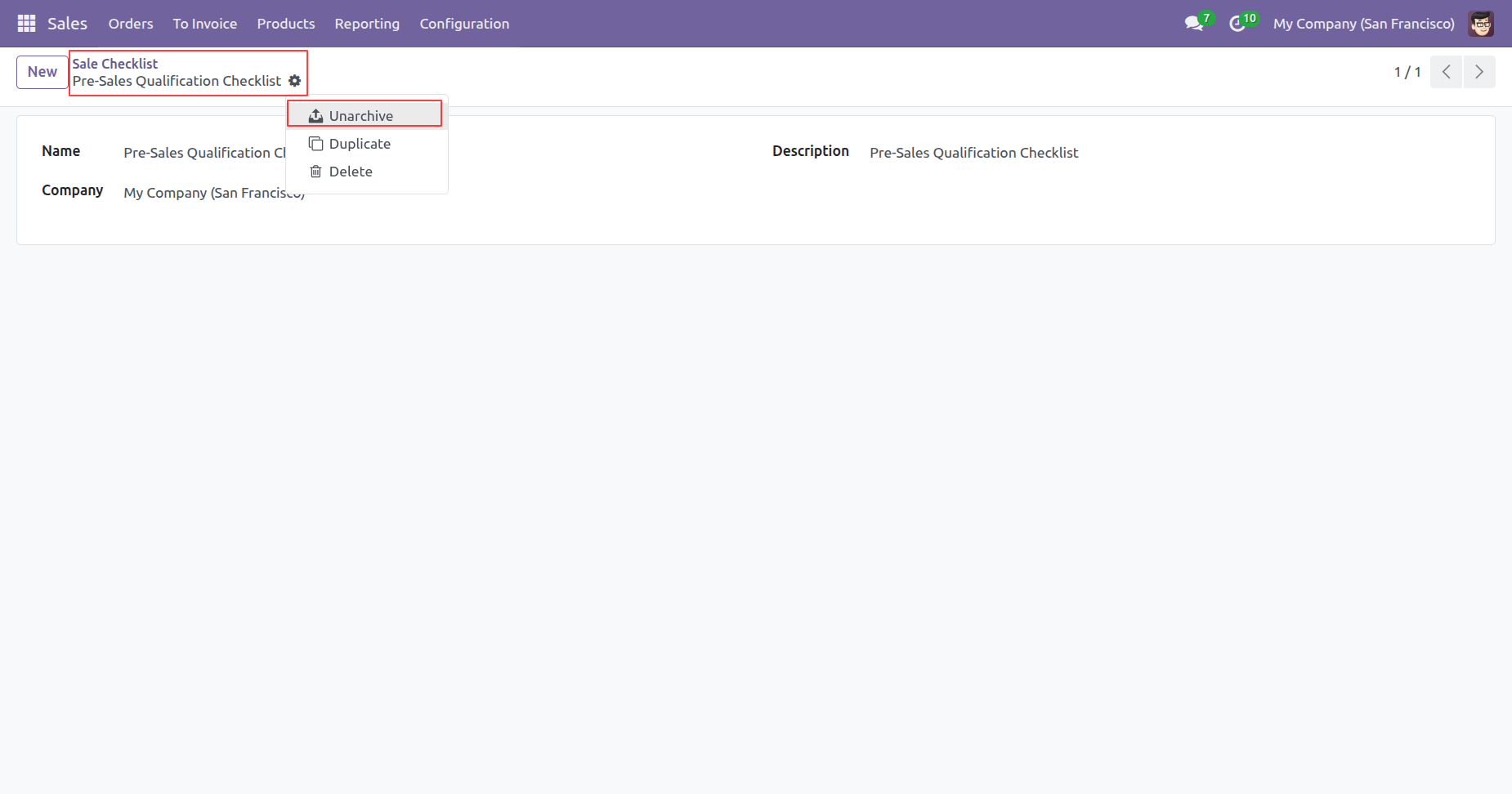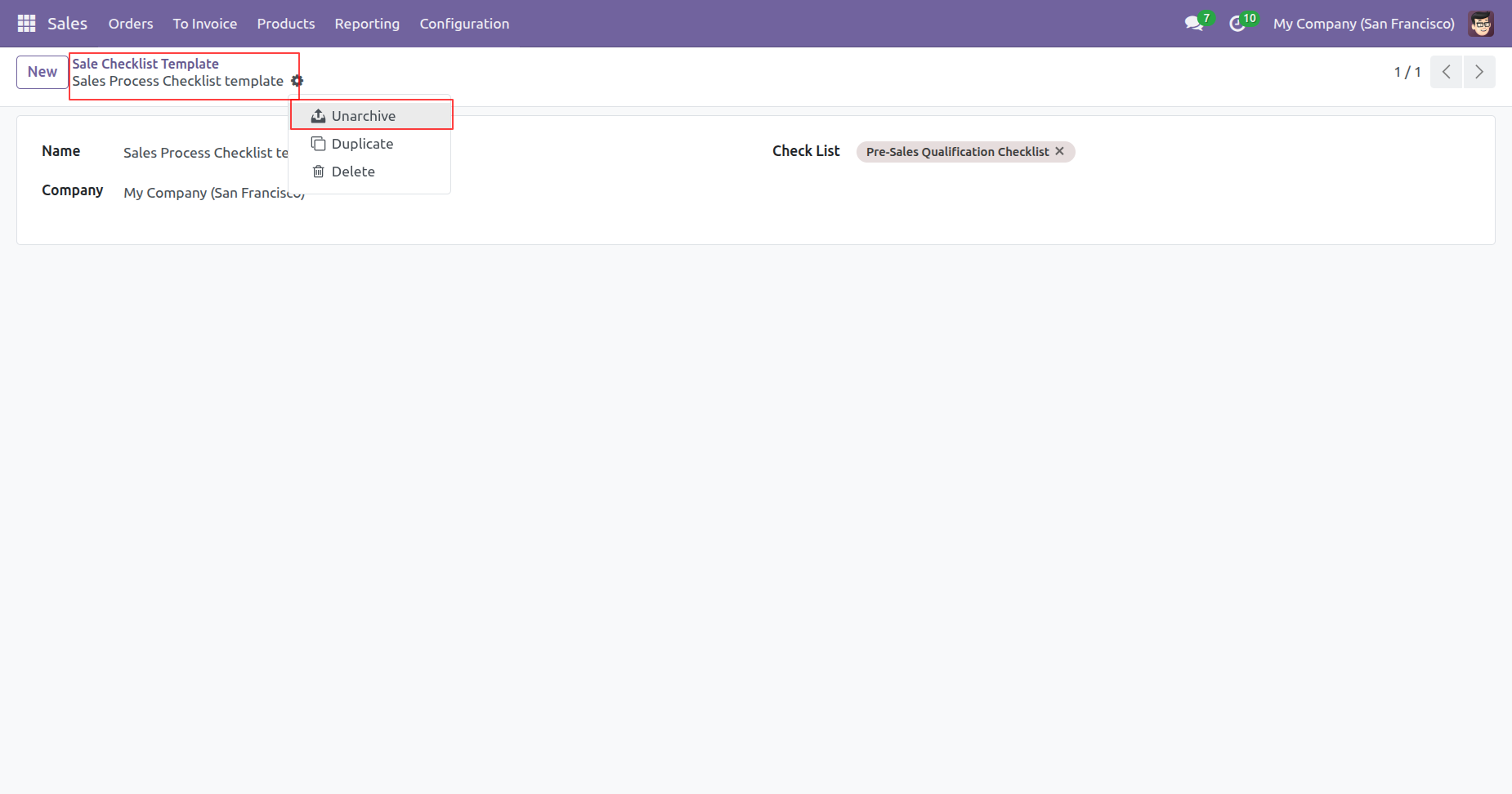 Form view the sale checklist template, click on the 'Unarchive' option from the Actions menu.