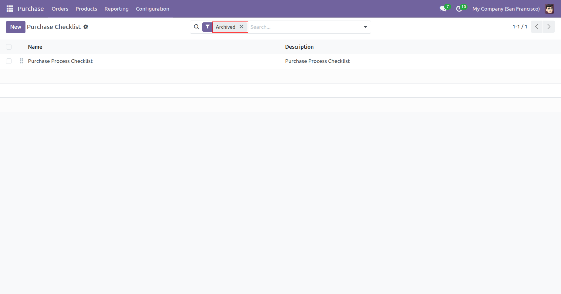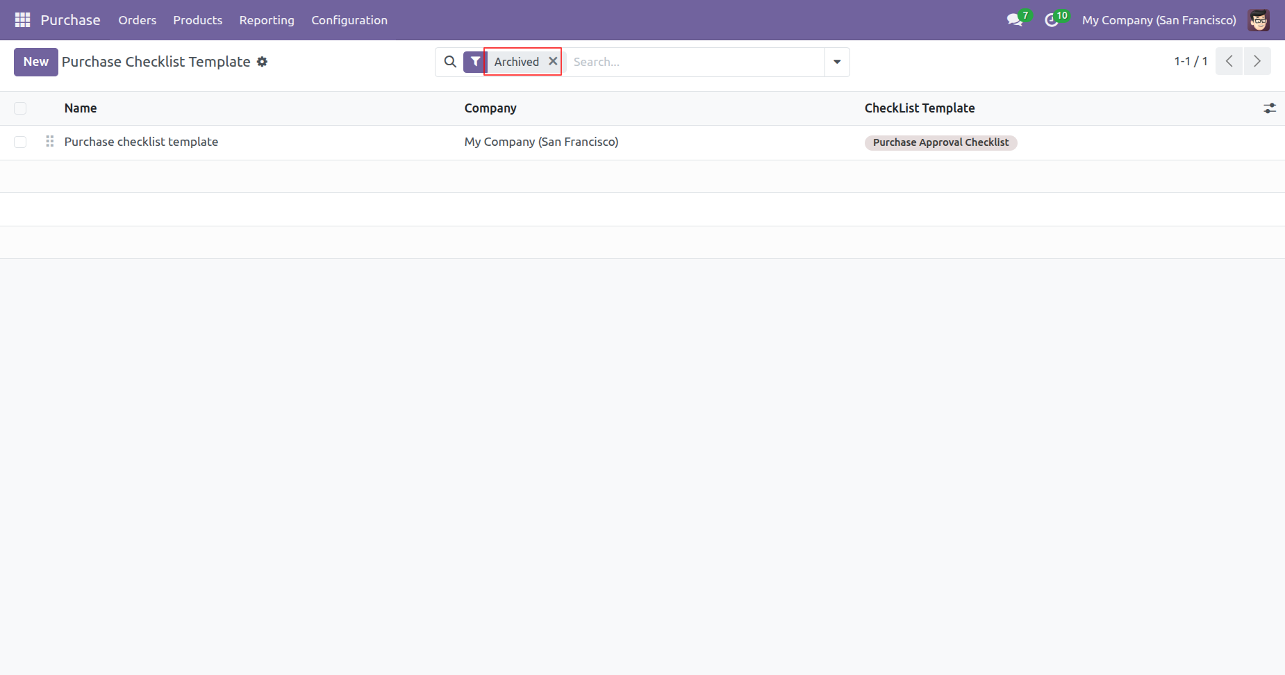 You can filter the purchase checklist template using the 'Archive' filter option.