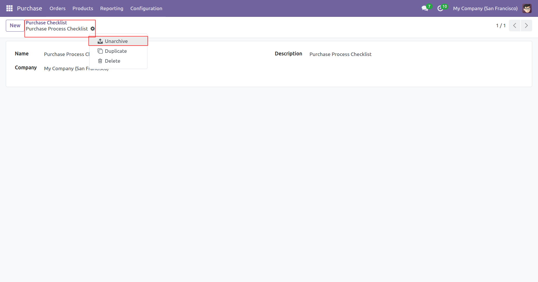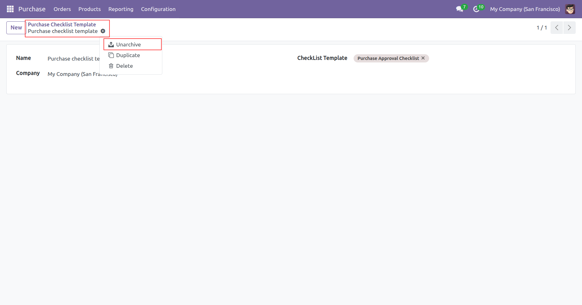 Form view the purchase checklist template, click on the 'Unarchive' option from the Actions menu.