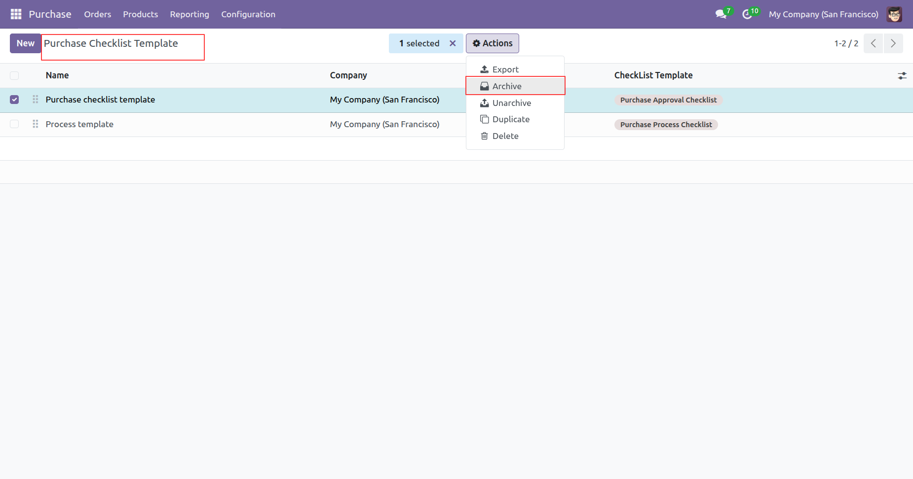 Select the purchase checklist template and click on the 'Archive' option from the Actions menu.