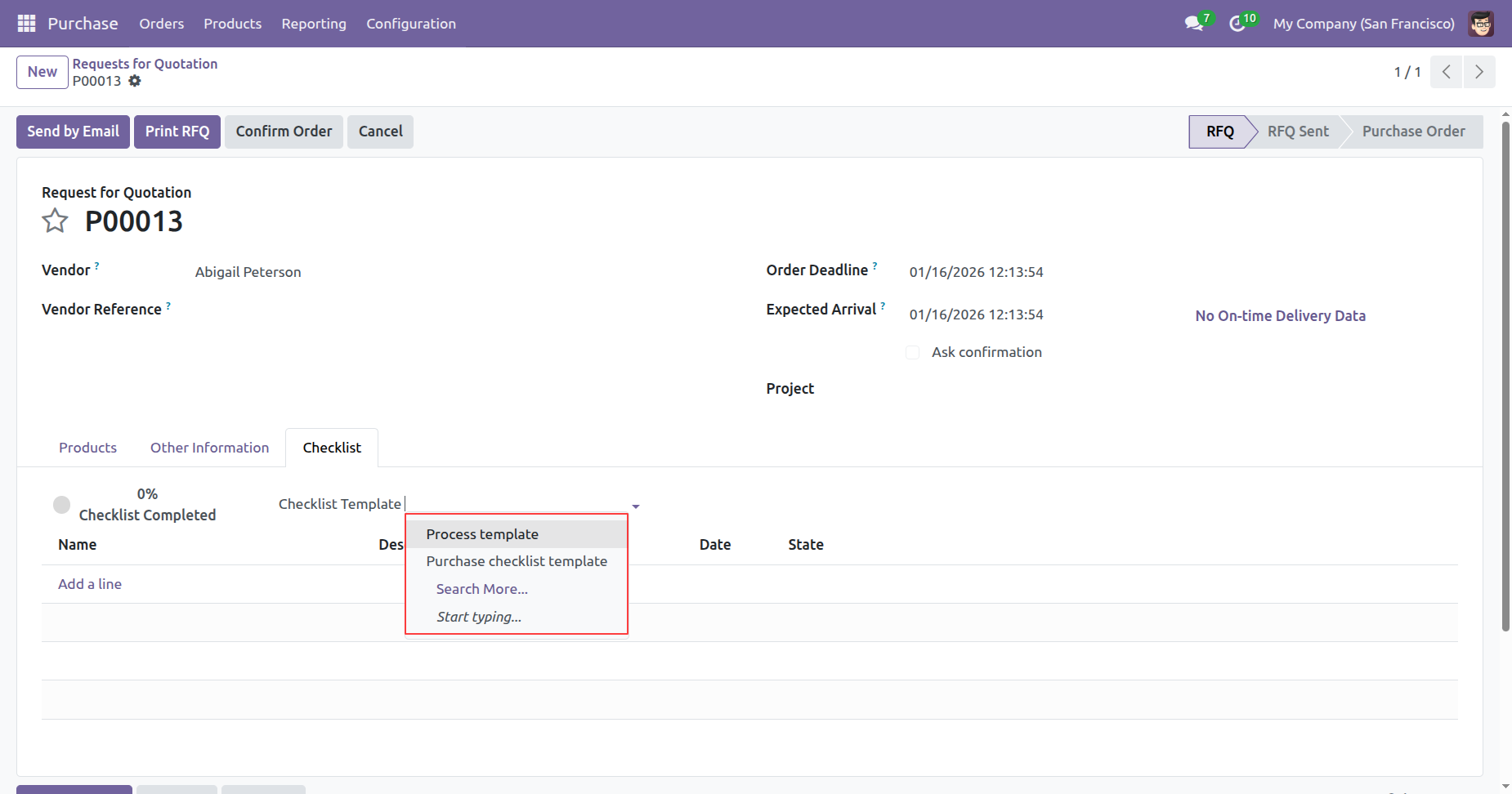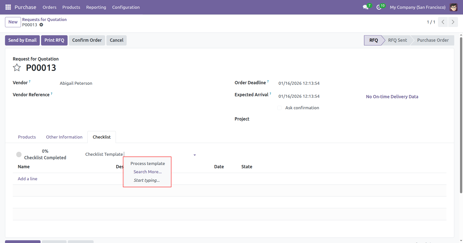 You can make a custom checklist in the request for quotation/purchase order. You can know the detail of the checklist in percentage.