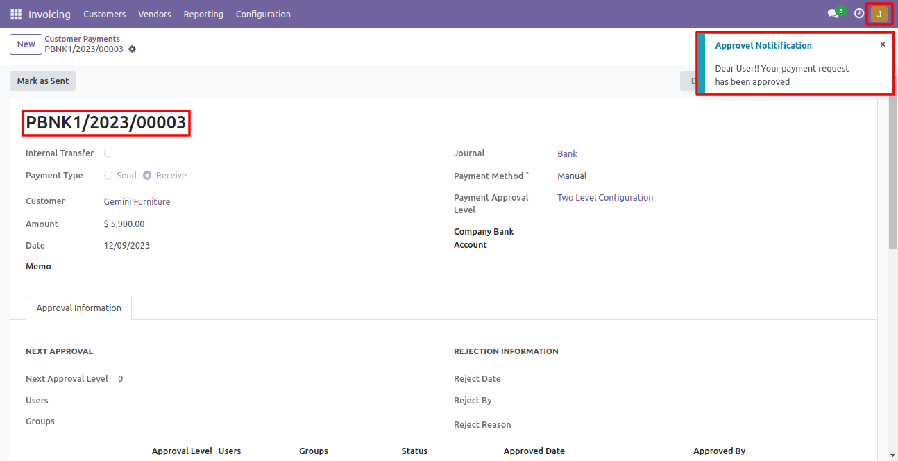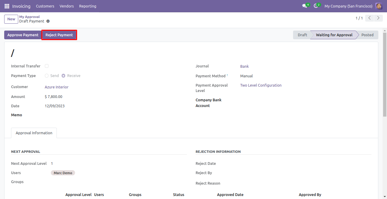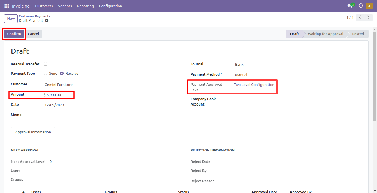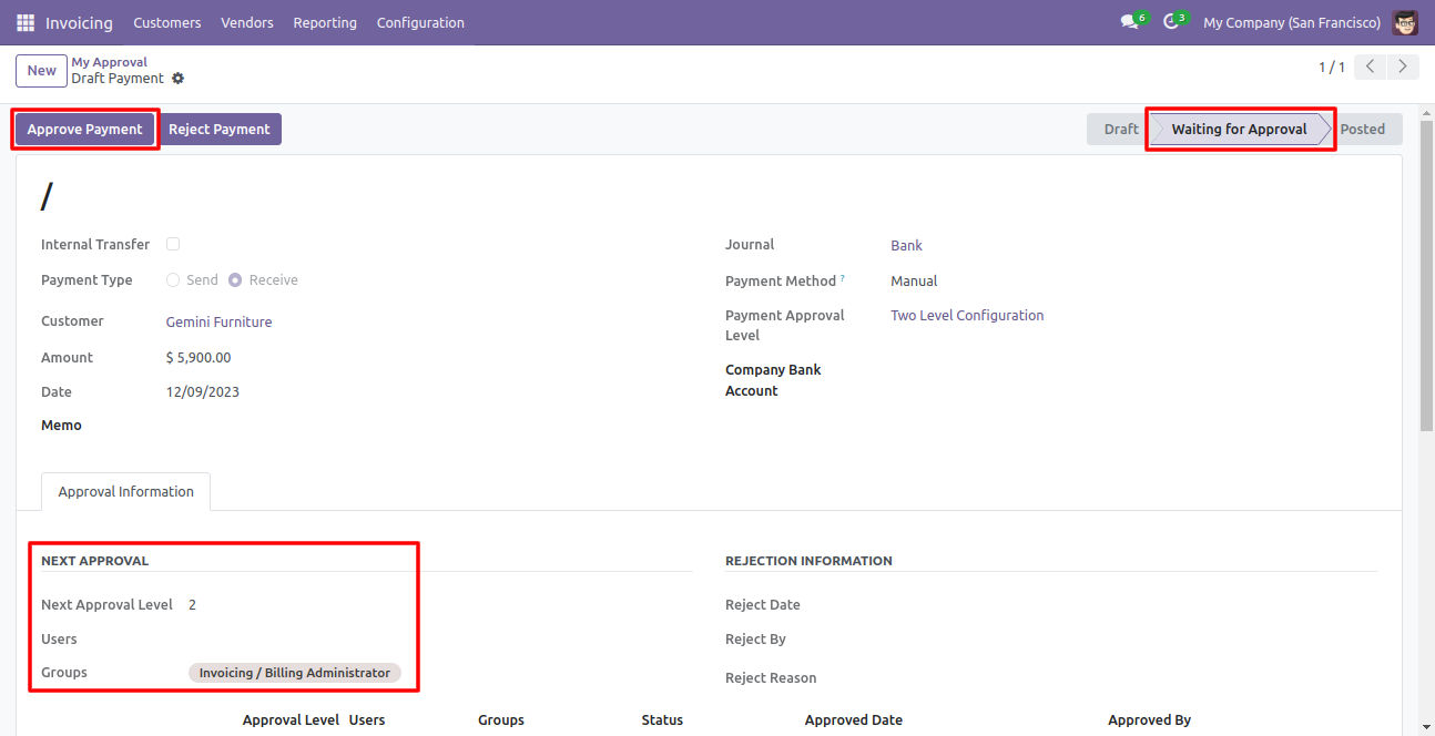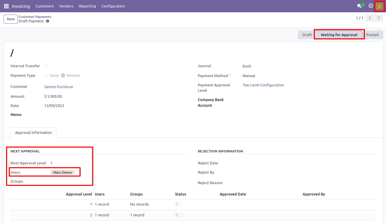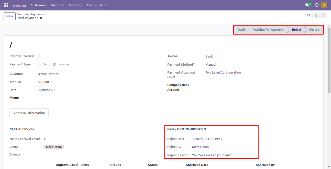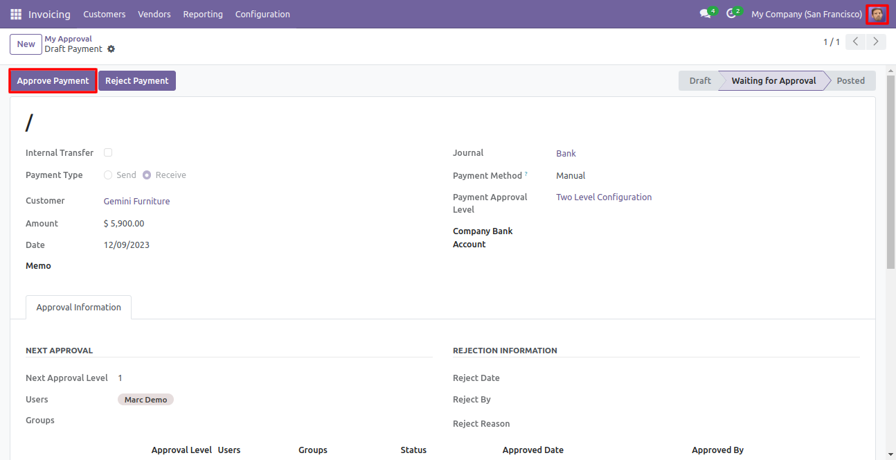 The payment is moved to draft stage. The details about approval is shown in payment form view.