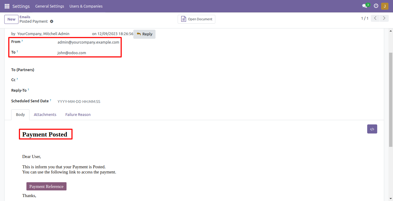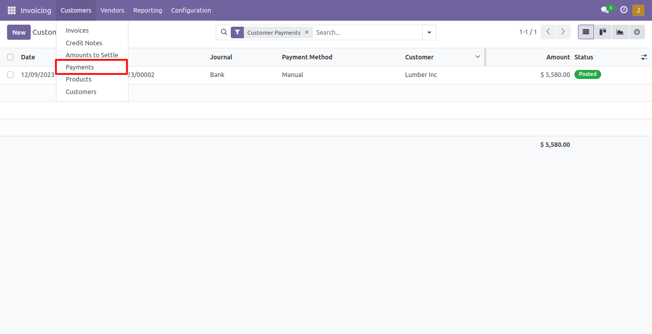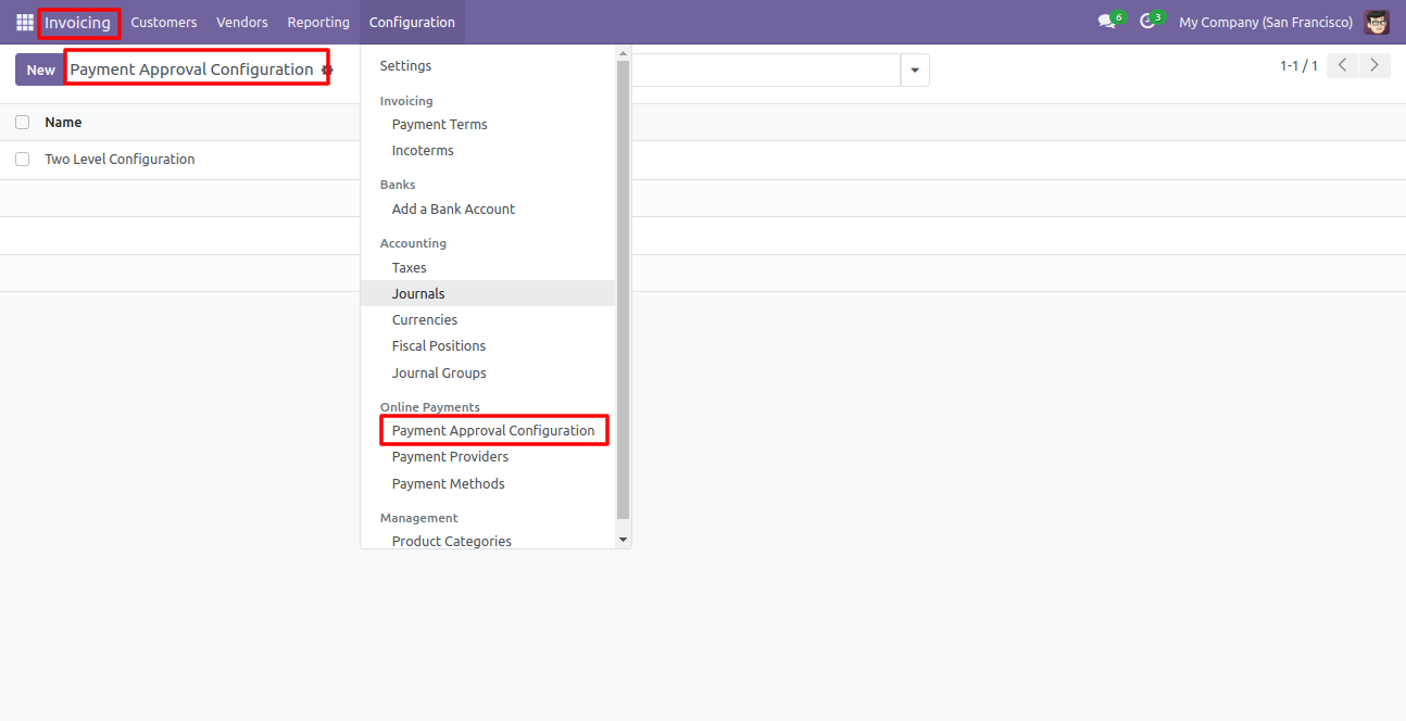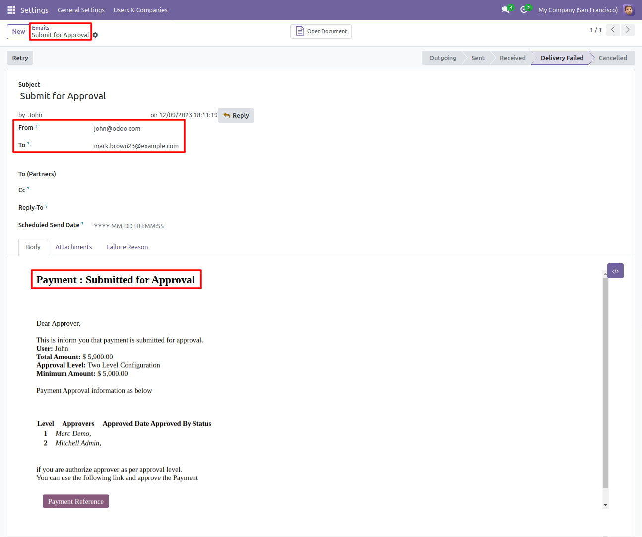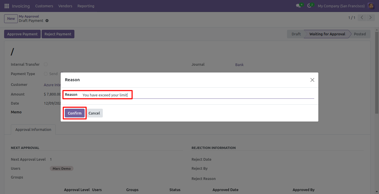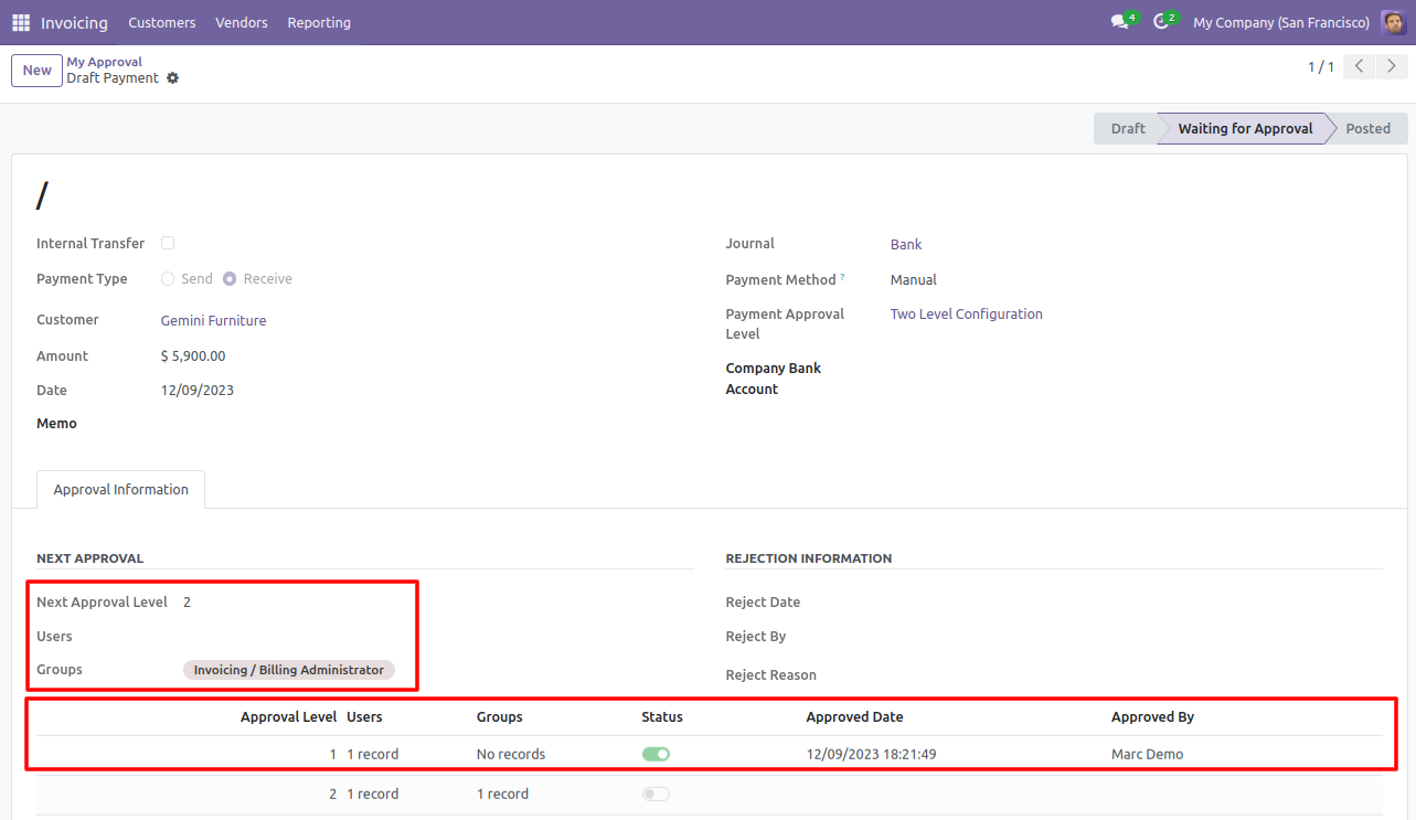 The payment is moved to draft stage. The details about approval is shown in payment form view.