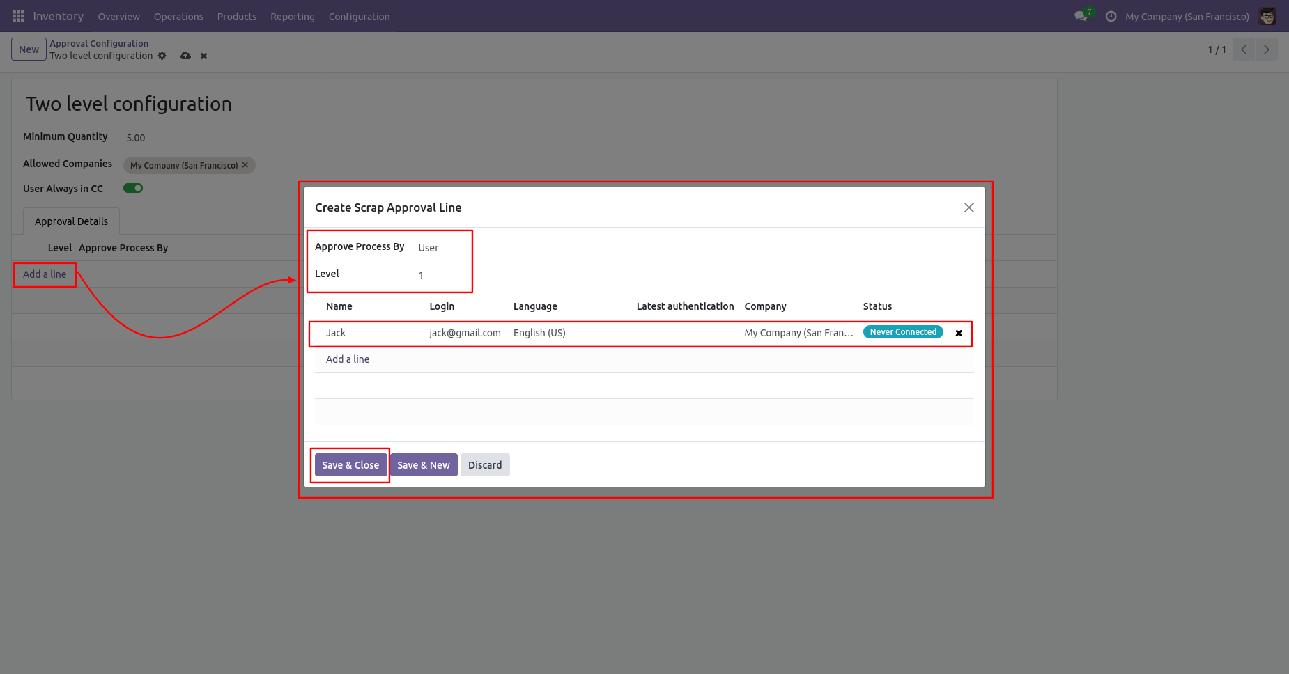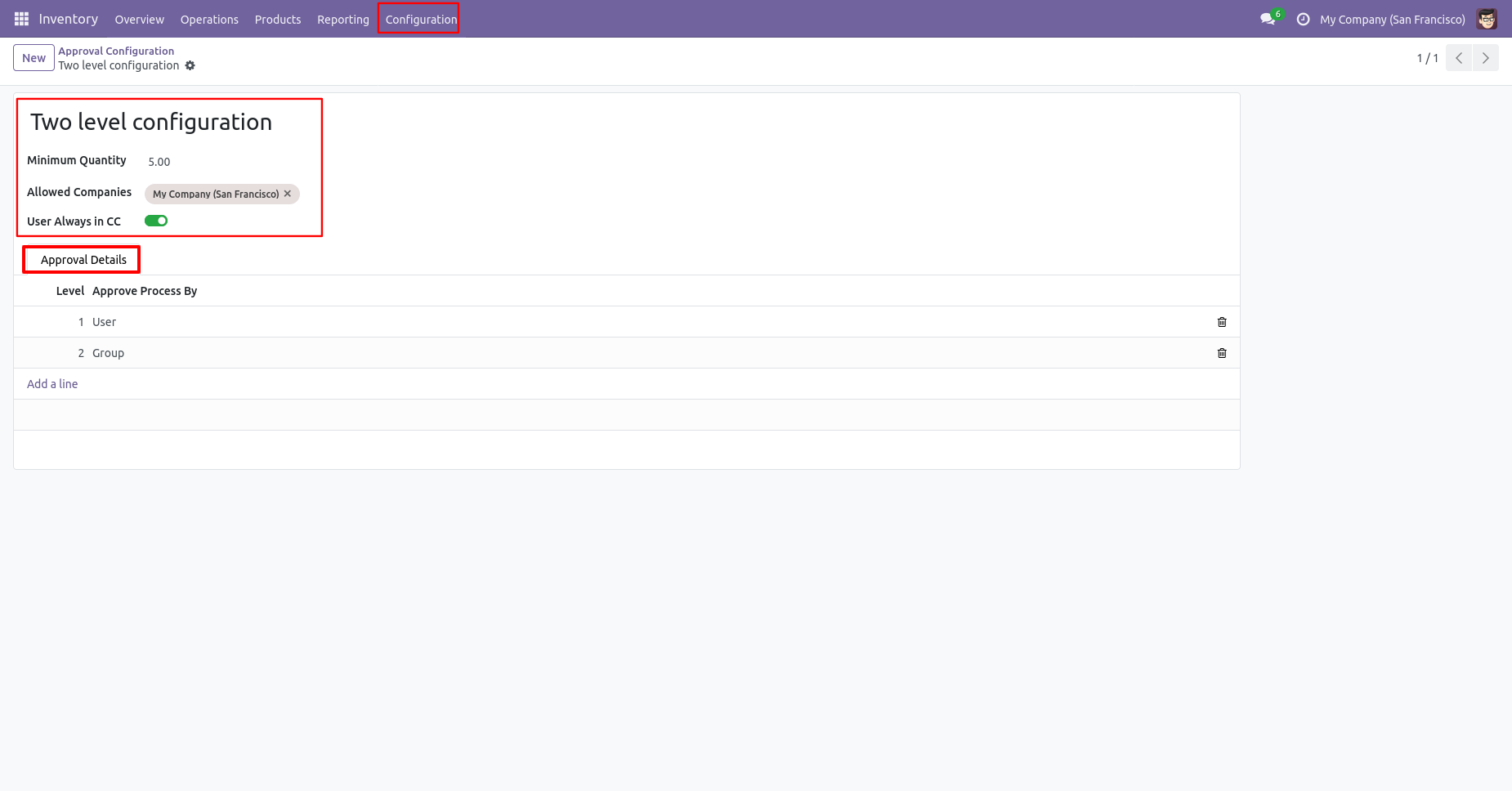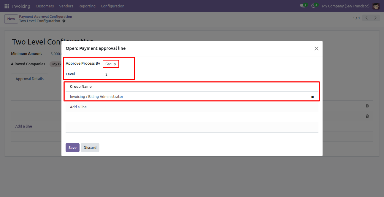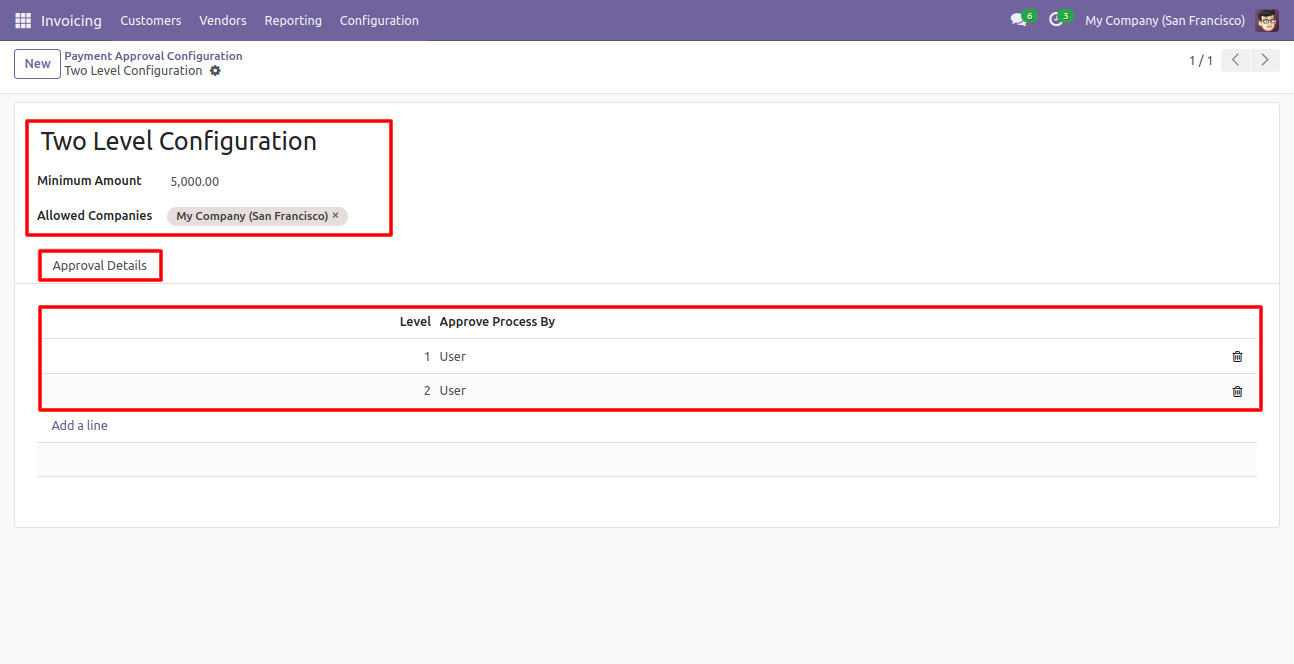 Approval Configuration: Setup approval levels based on minimum amount and users level. Also select companies.