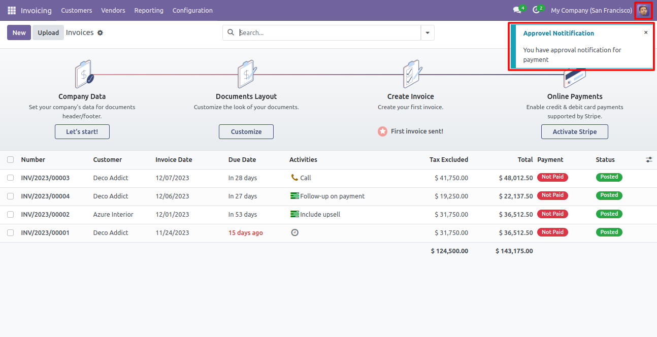 The user submits an invoice/bill for approval by pressing the 'Confirm' button. so that will automatically set the 'waiting for approval' stage. Auto fetch Approval Level based on configured approvals setup and minimum limit.