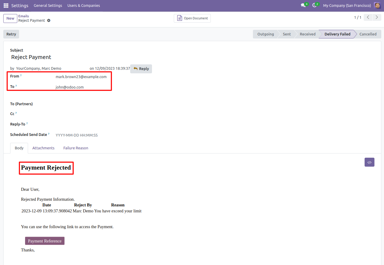 After click on the reject button, this wizard will pop up, here the approver has to add a reason for rejecting the payment.