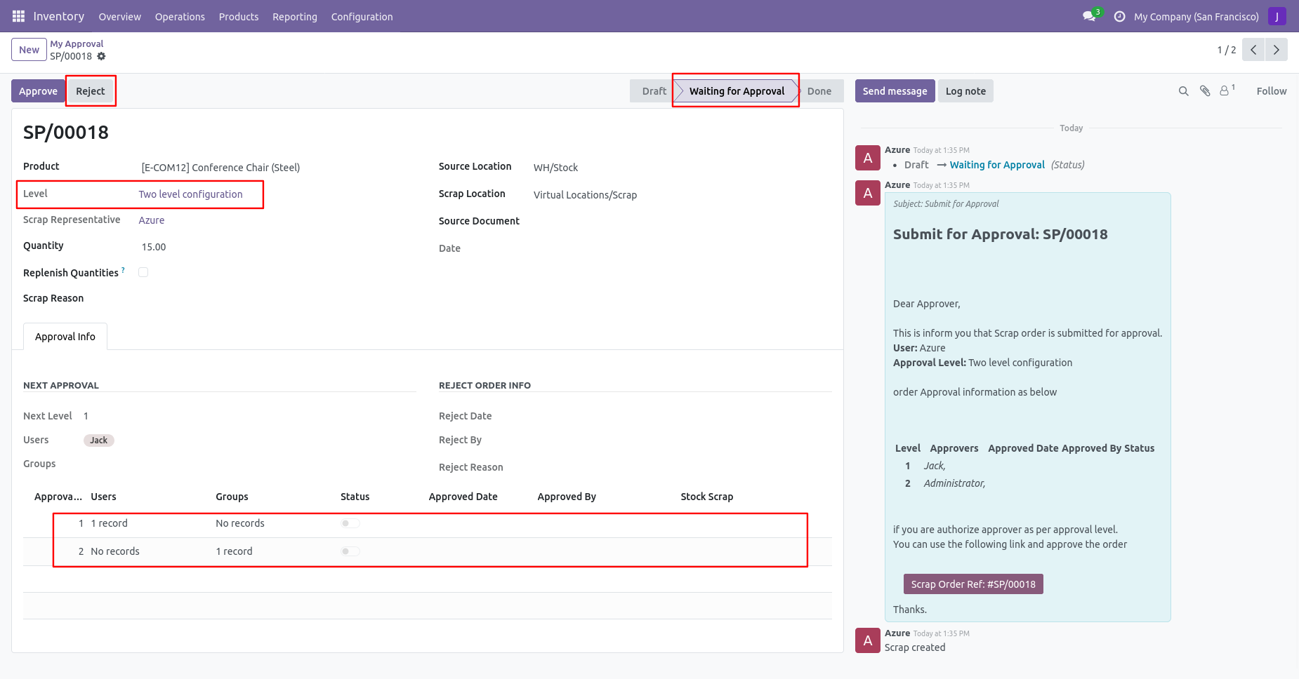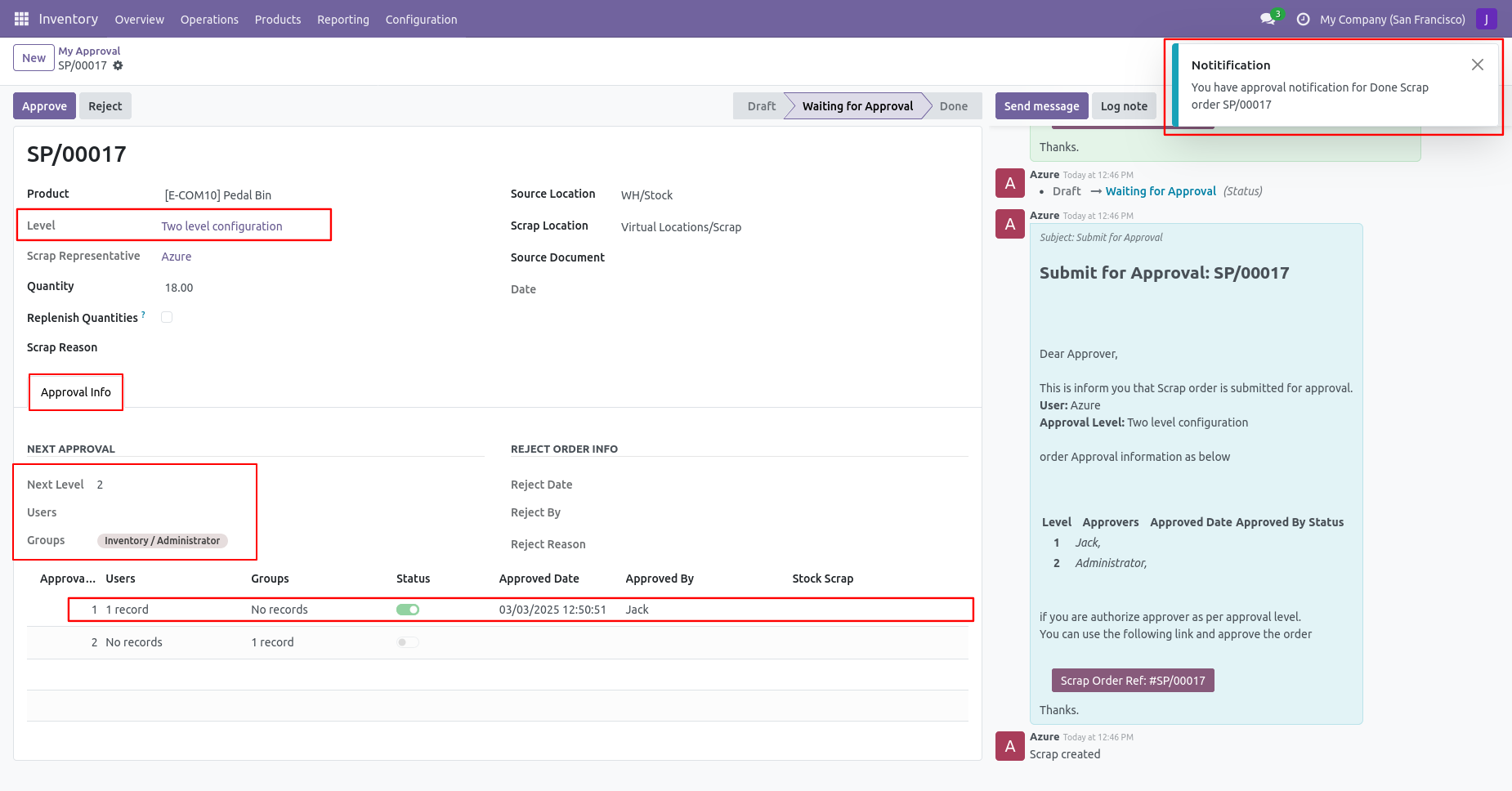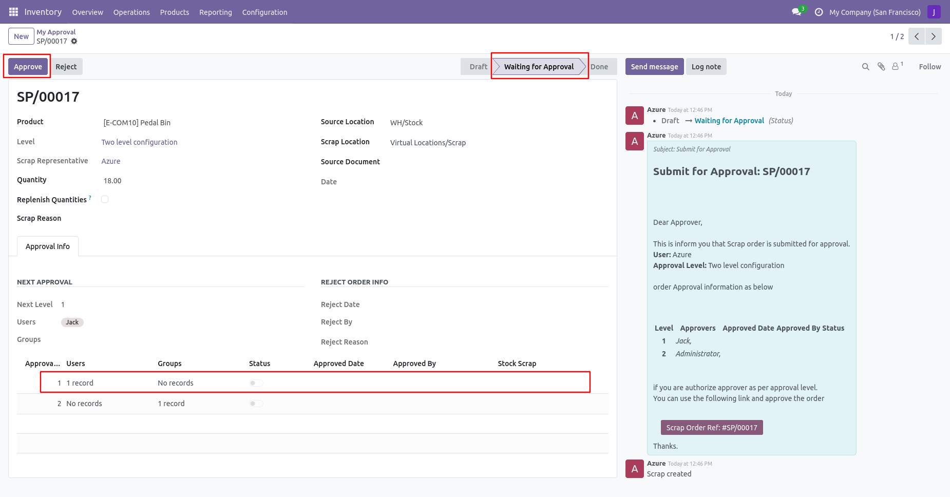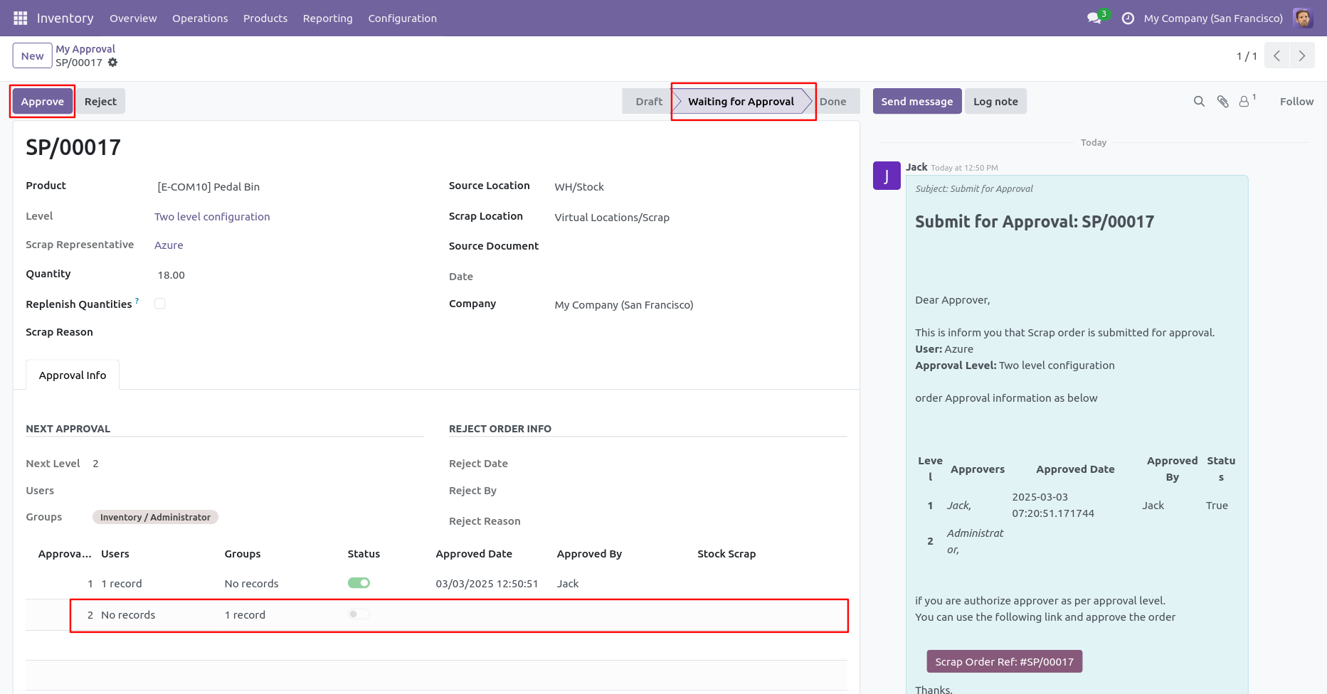 The scrap order is moved to the waiting for approval stage. The details about approval is shown in the scrap order form view.