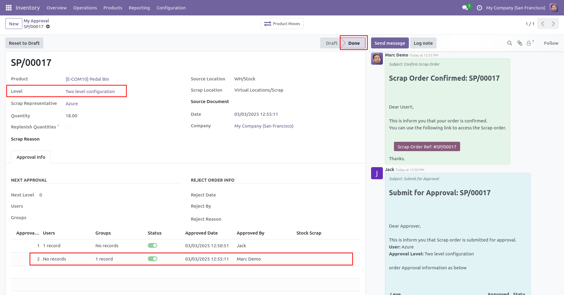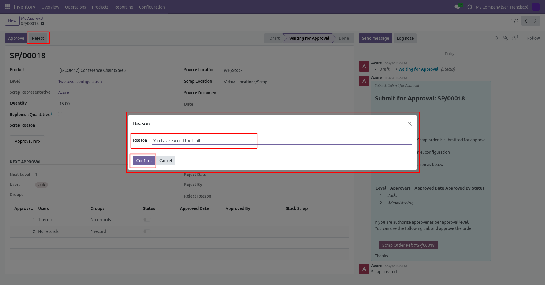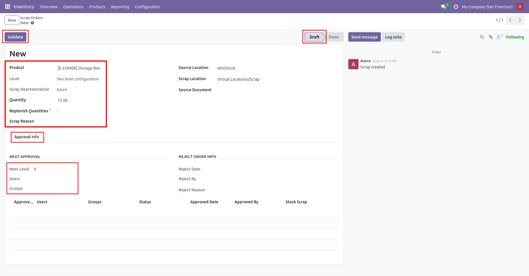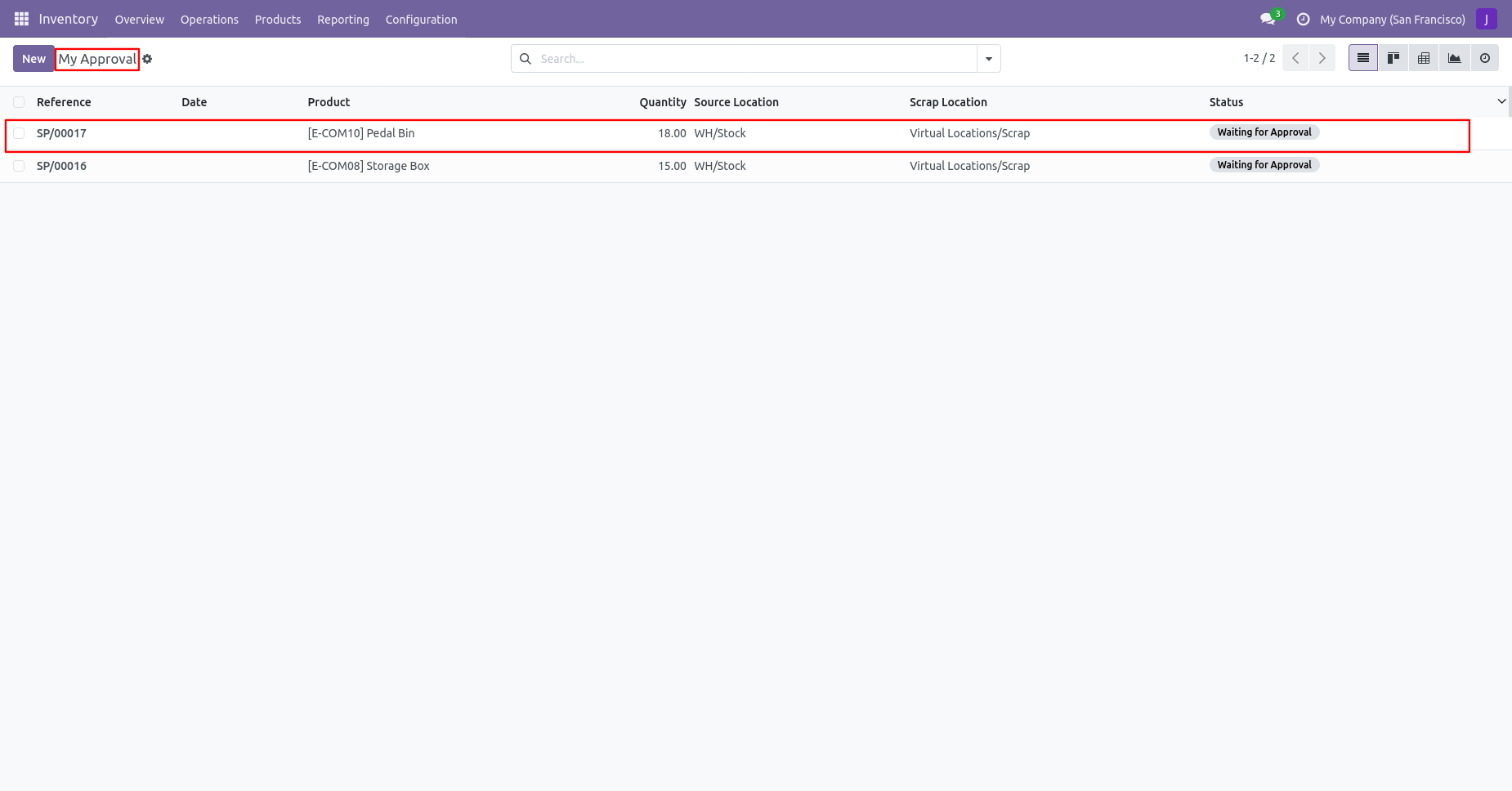 The scrap order is moved to the waiting for approval stage. The details about approval is shown in the scrap order form view.
