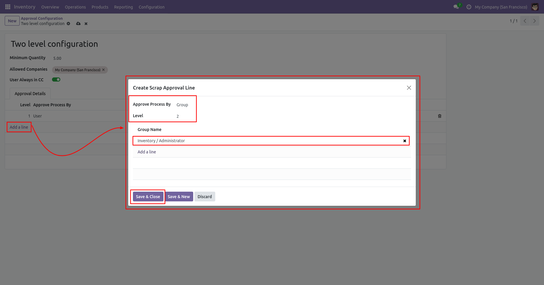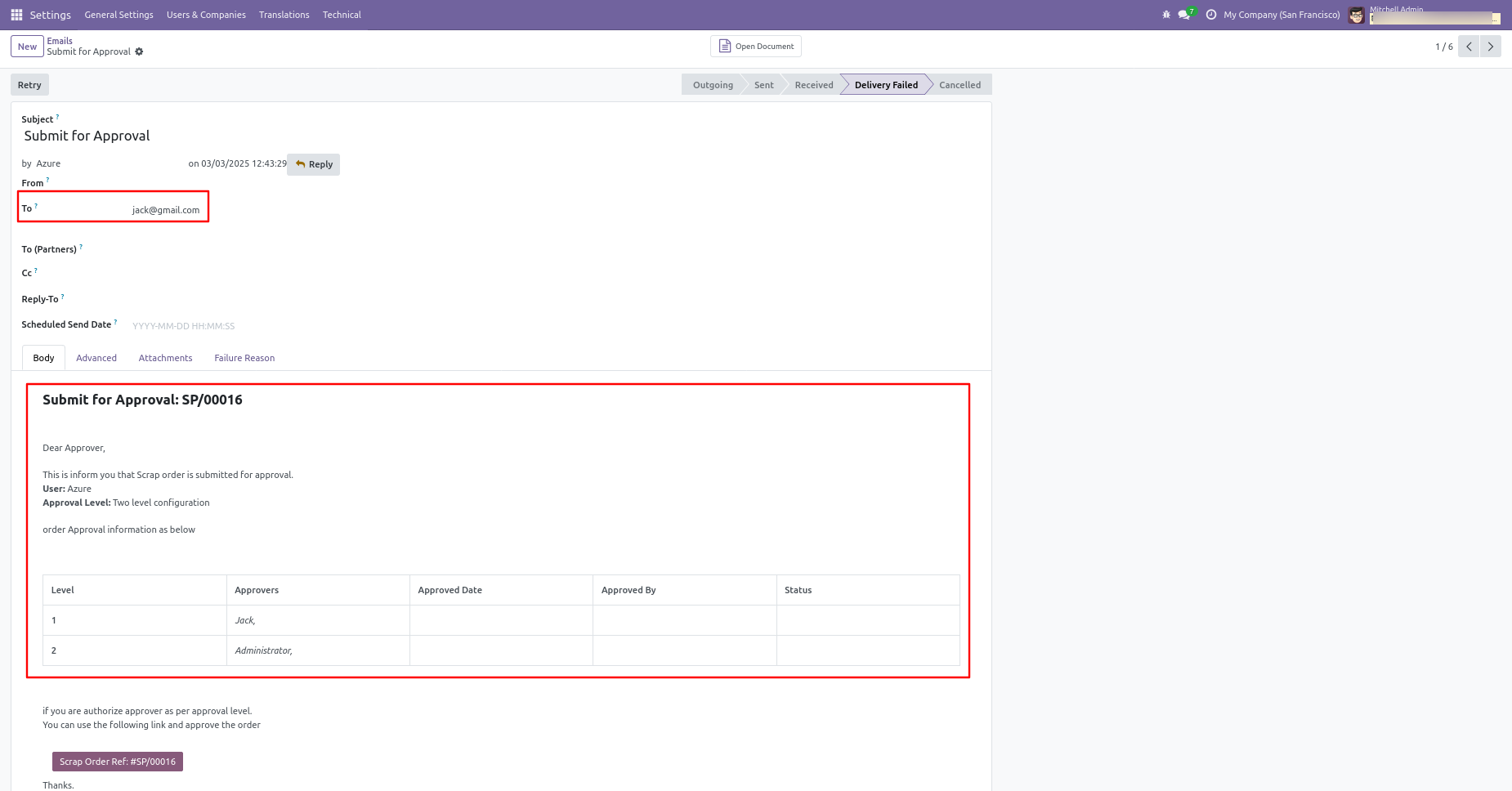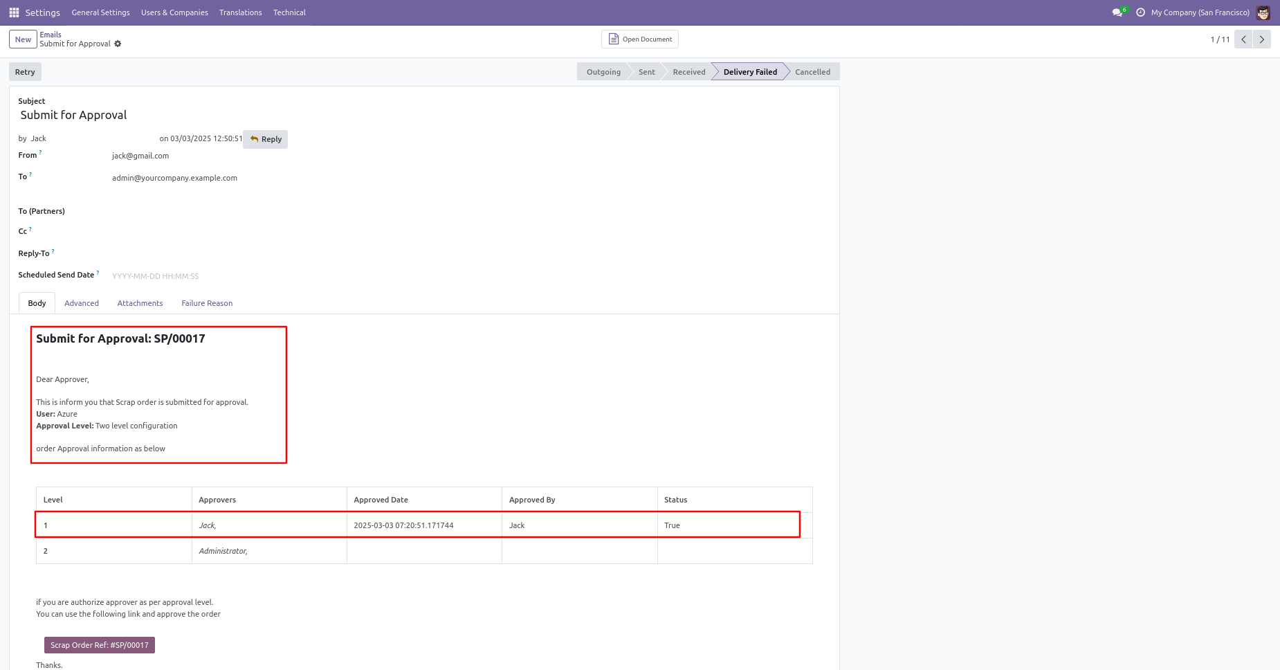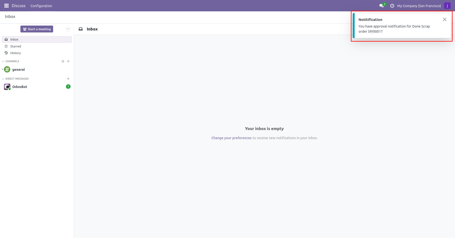 The scrap order is moved to the waiting for approval stage. The details about approval is shown in the scrap order form view.