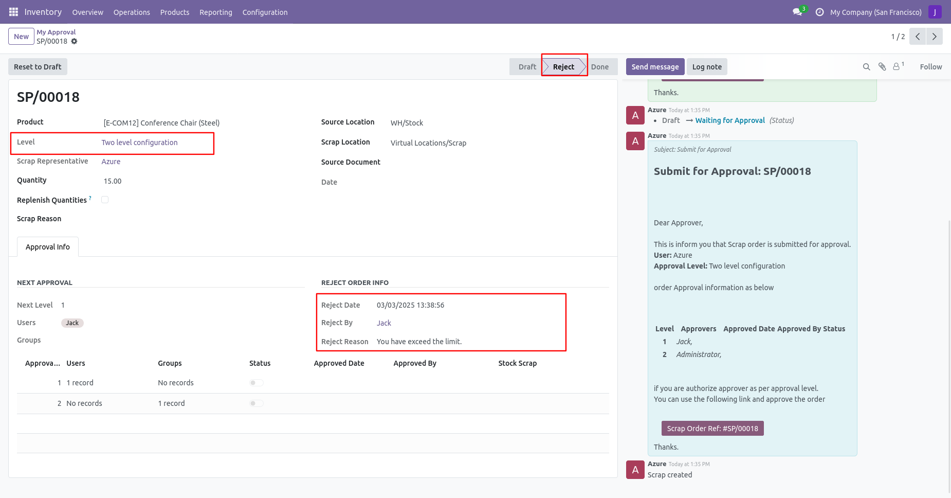There are 2 approvers if the first approver rejects the scrap order that means that the scrap will be canceled no more second approval is needed.