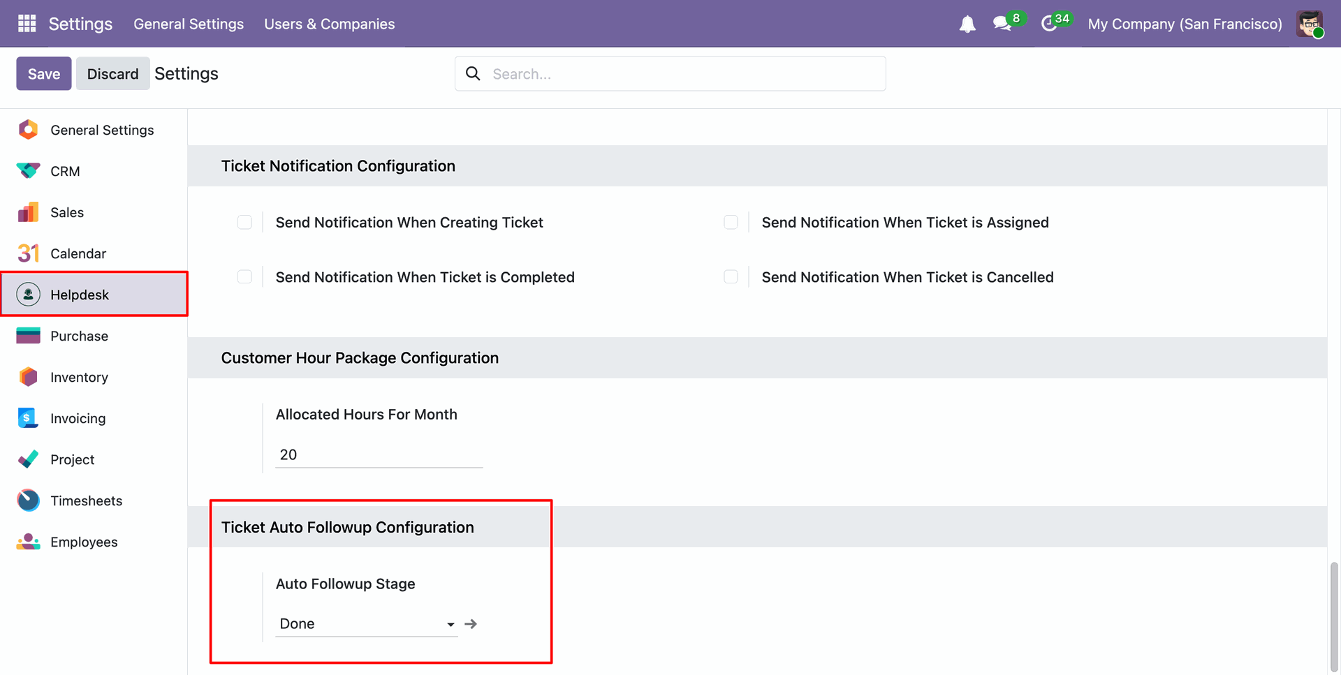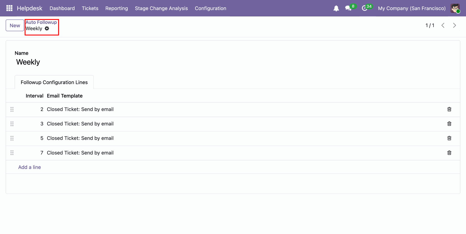 In the Helpdesk Ticket Type form view, enable the 'Follo-up' and 'Auto Follou-up Trigger' options, then select the 'Folloup Template'.