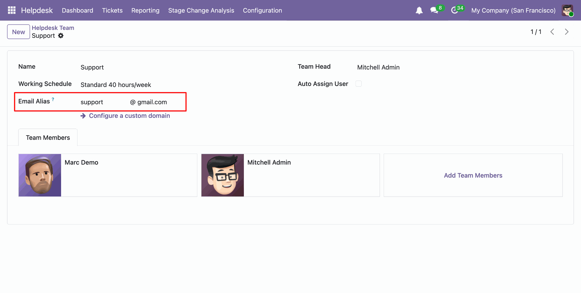 'Helpdesk Teams' form view. Where you can define working schedule as well as see helpdesk SLA ticket using the smart button 'Helpdesk SLA'.