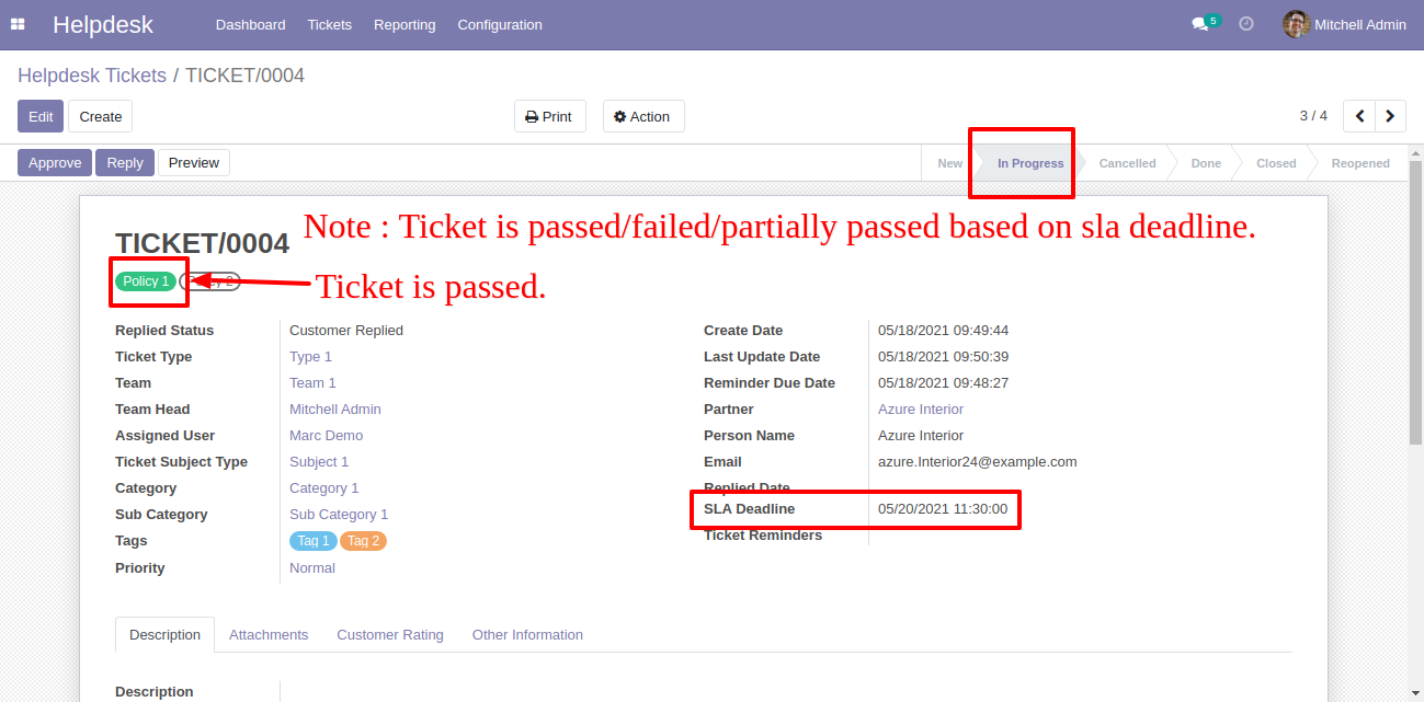 In the helpdesk ticket form view, you can see SLA deadline, Now we press the "Approve" button.