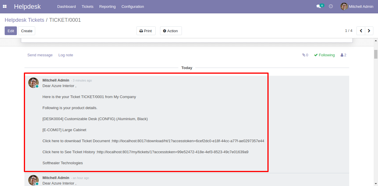 When you click on the 'Reply' button on the form, this wizard will appear where you can set an email template as per reply. In Email, there is one link 'View Ticket', Where customer can see the ticket status.