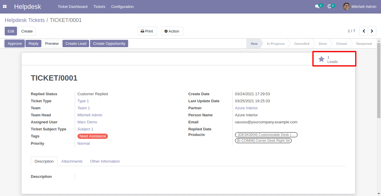 "Helpdesk Ticket" form attachment view. Where you can attach document received from customer.