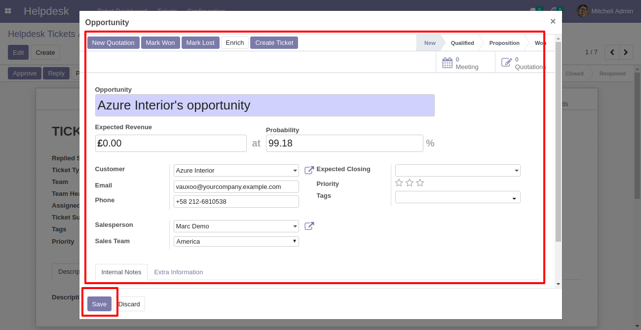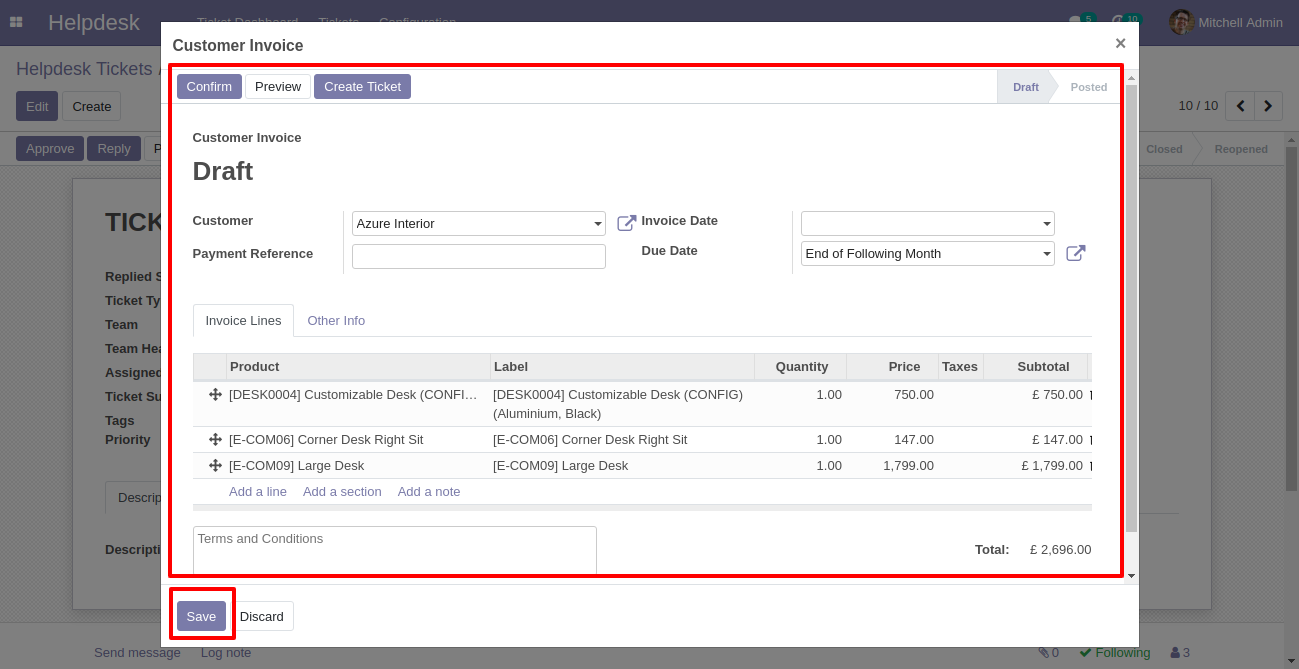 "Helpdesk Ticket" form view, create a ticket and save it.