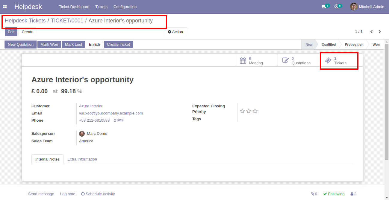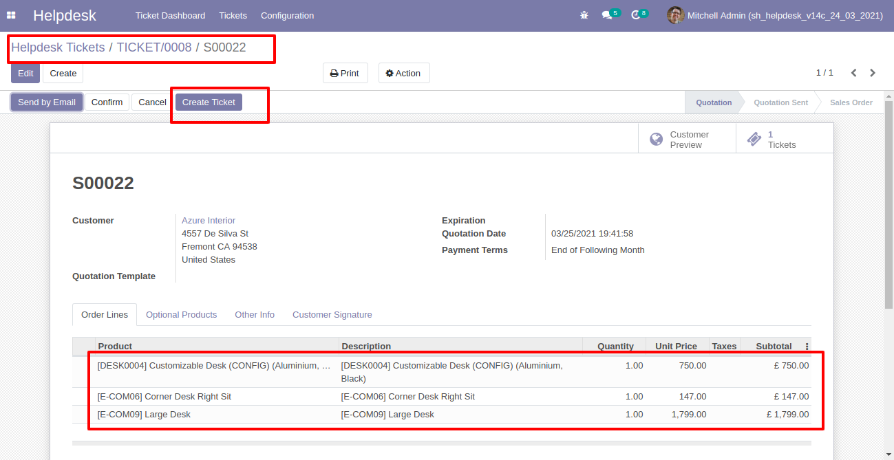 So, from that sale order, you can see tickets of that sale order/quotation using the "Tickets" smart button.