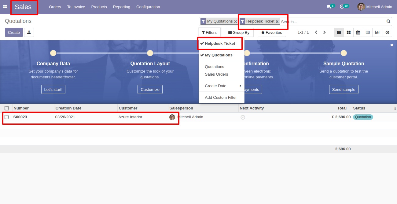 Tick security group "Sale Helpdesk Ticket" to generate a quotation/sale order directly from the helpdesk ticket as well generate a helpdesk ticket from the sale order/quotation.