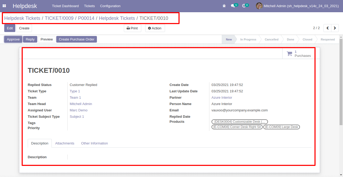 Now goto helpdesk ticket form view and click on 'Reply'.