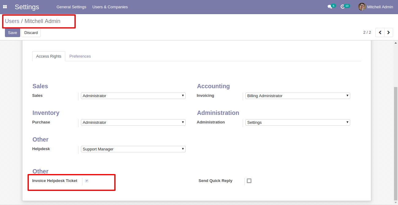 Tick security group "Purchase Helpdesk Ticket" to generate a request for quotation/purchase order directly from the helpdesk ticket as well generate a helpdesk ticket from the purchase order/request for quotation.