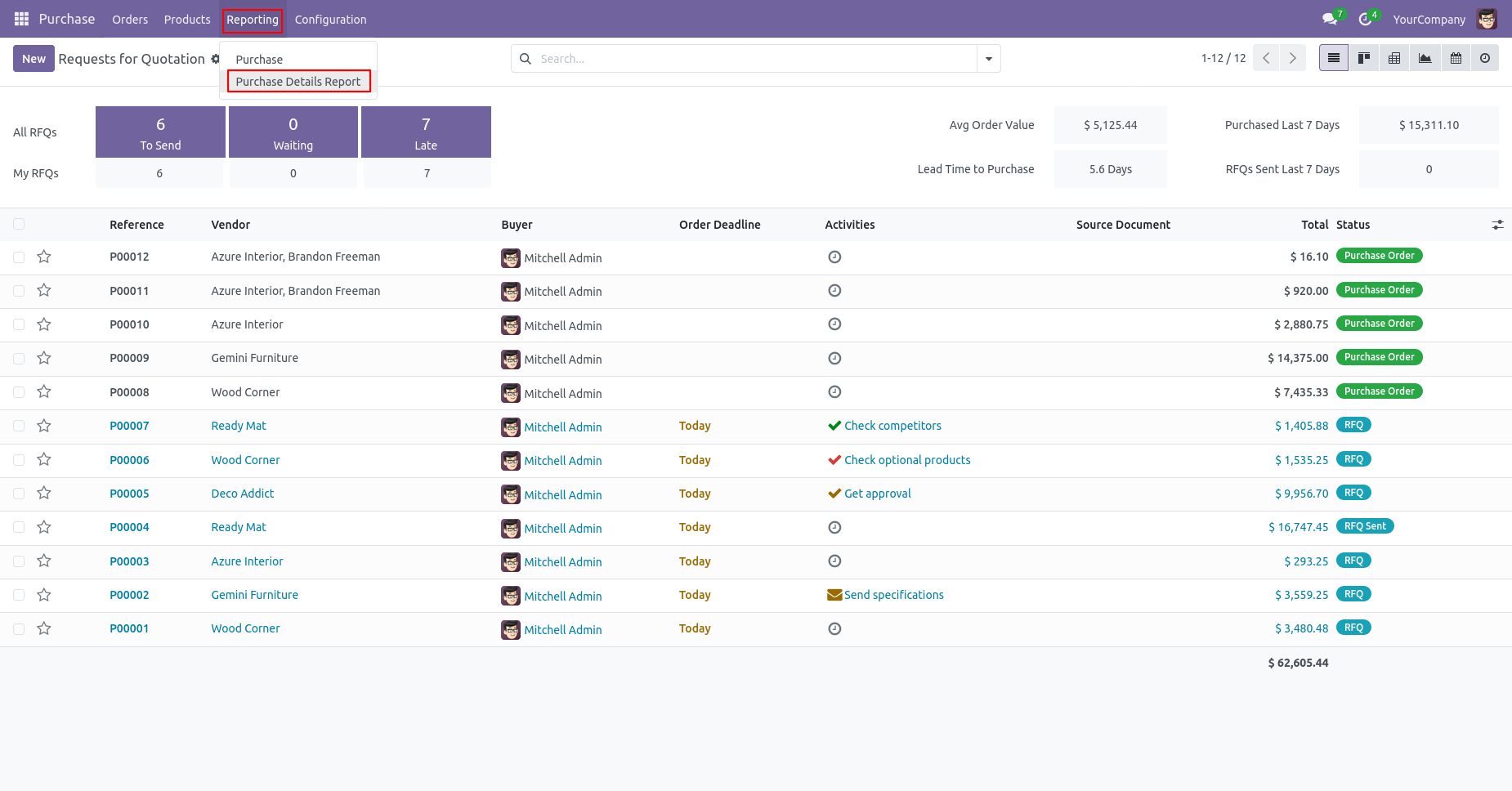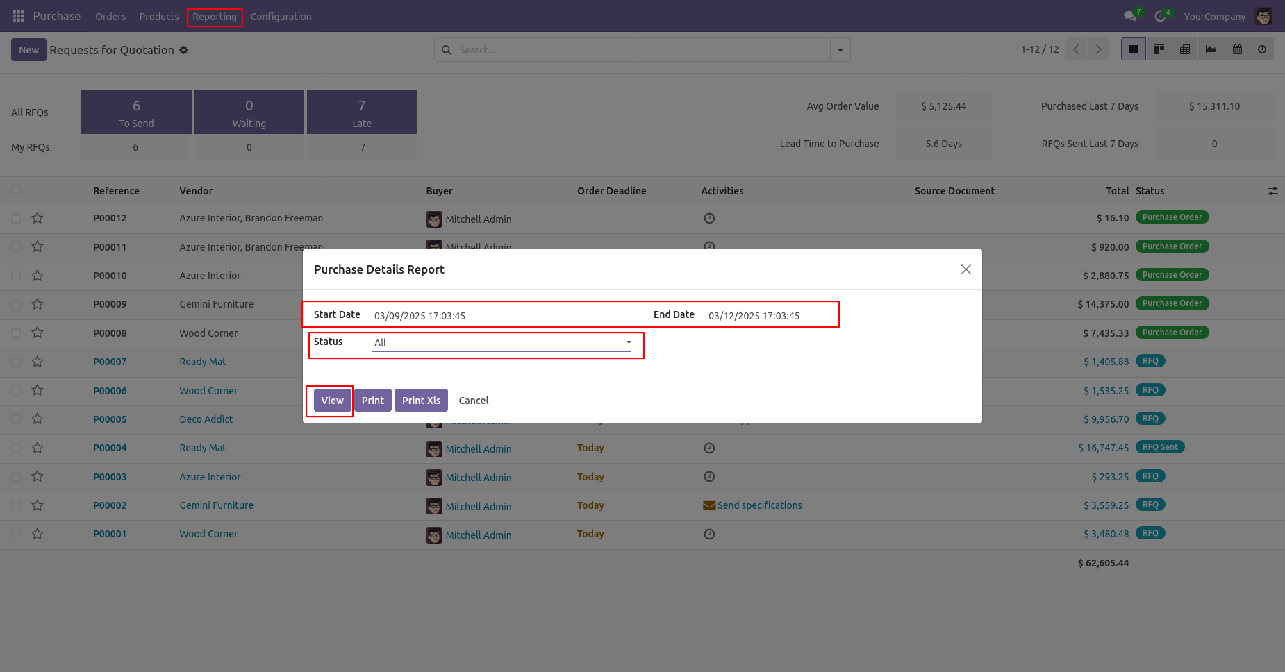 - You can generate a report based on any status of the purchase order/RFQ (All, Draft, RFQ sent, purchase order, Locked).
