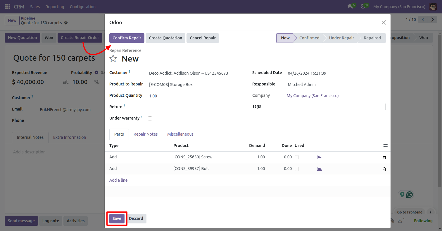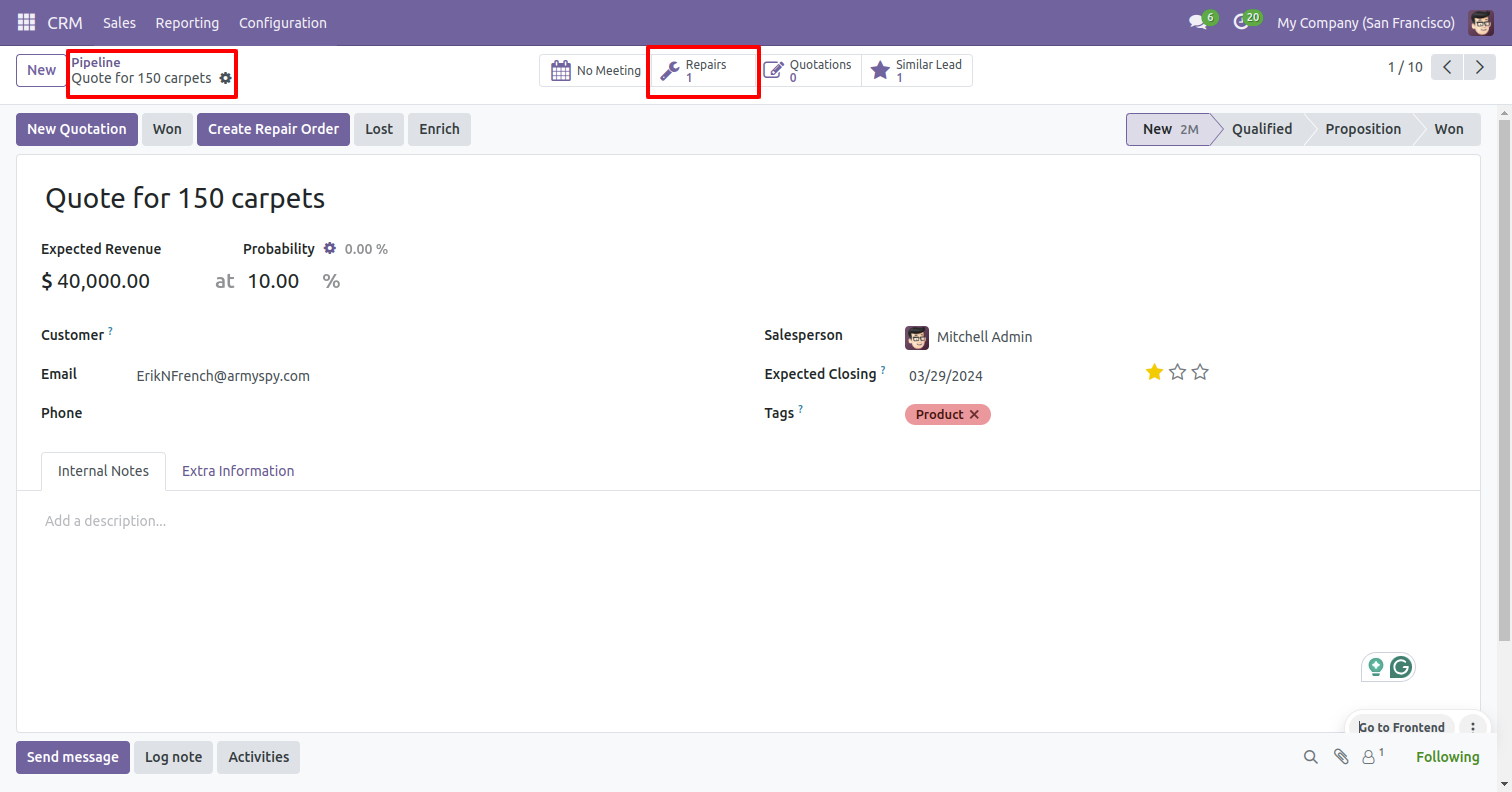 Form view of the Pipeline. Click on the 'Create Repair Order' button.