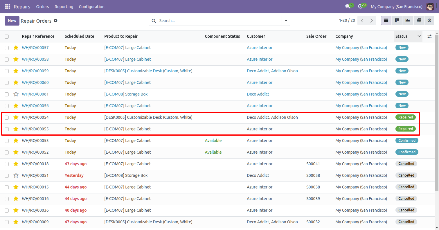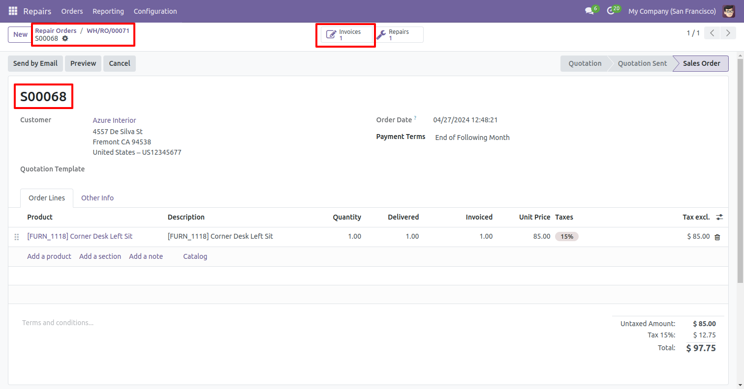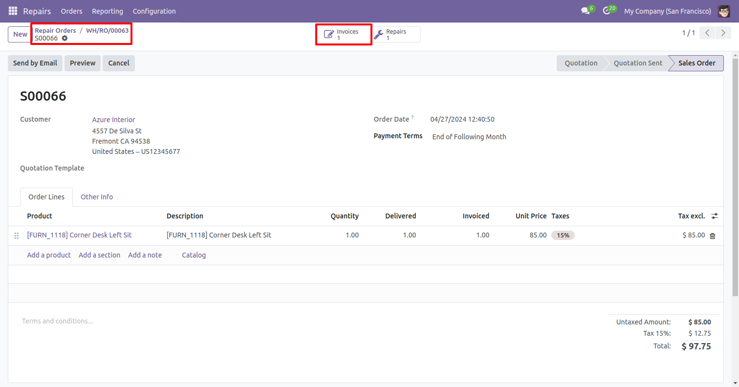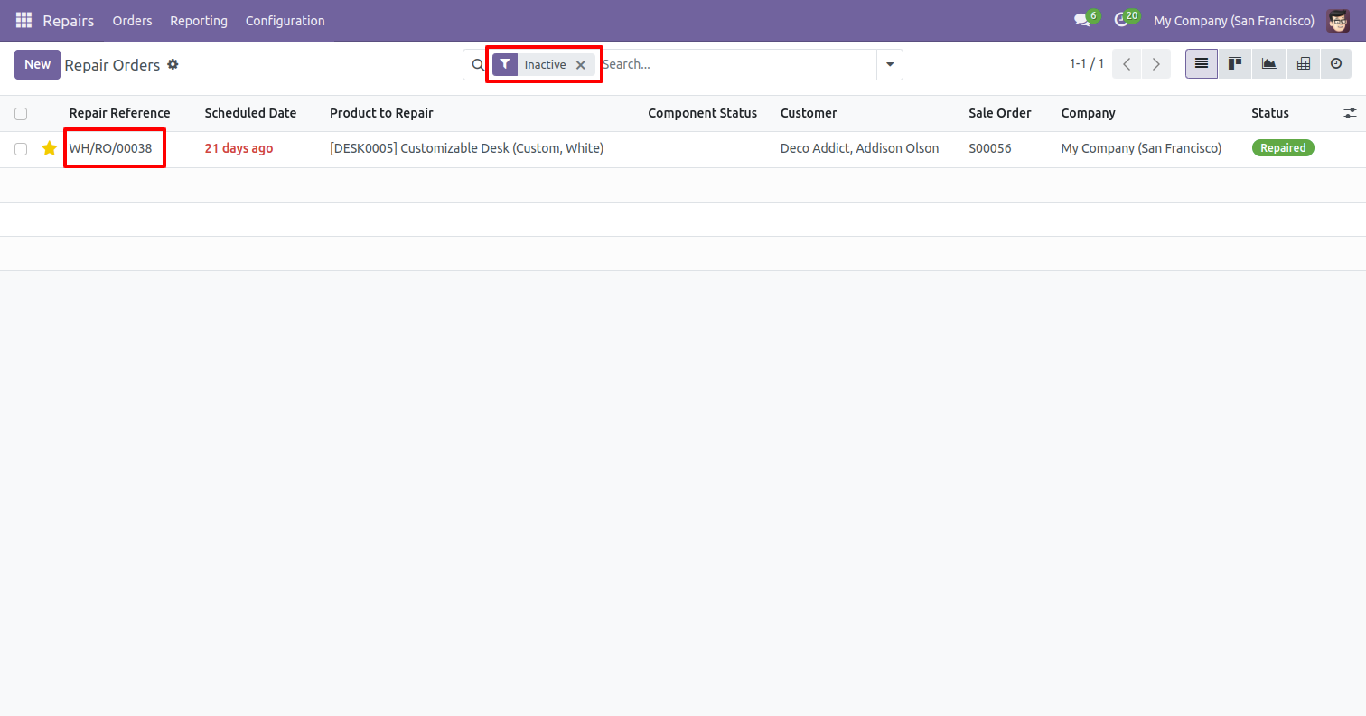 Click on the 'Repair Order' smart button to view the related Repair orders.