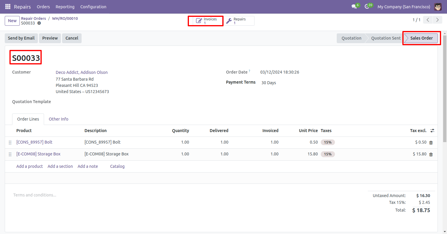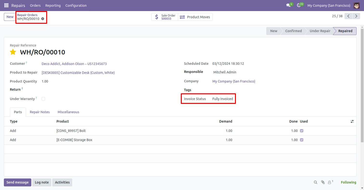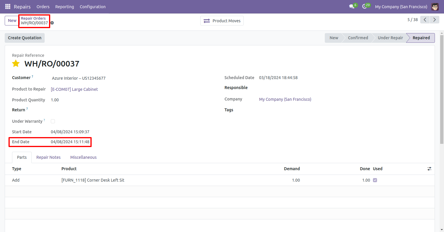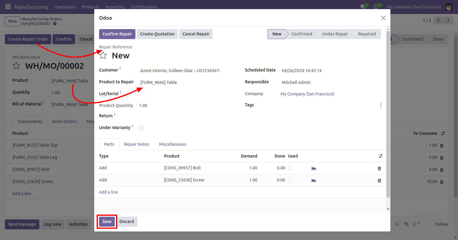 Click on the 'Repair Order' smart button to view the related Repair orders.